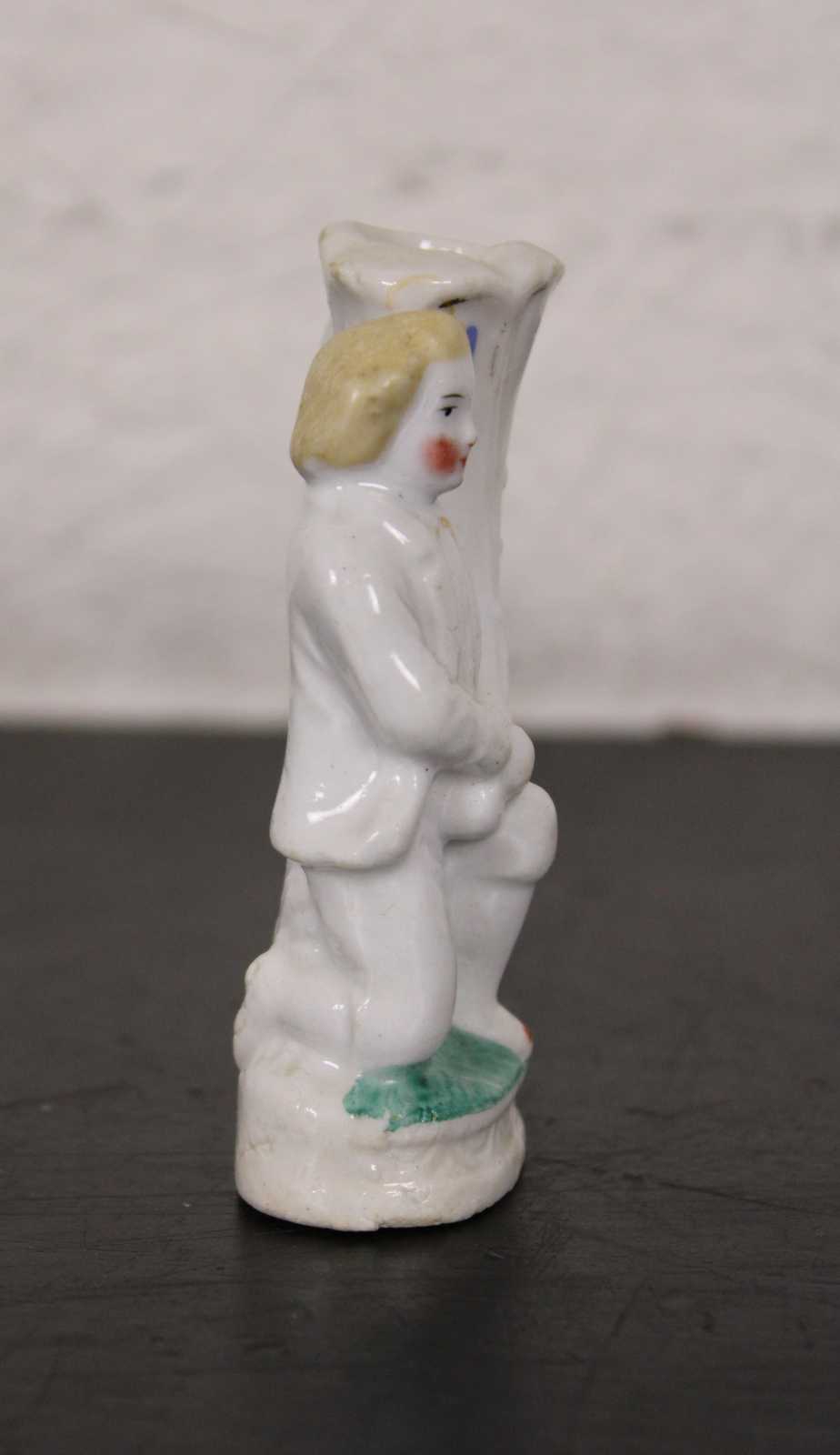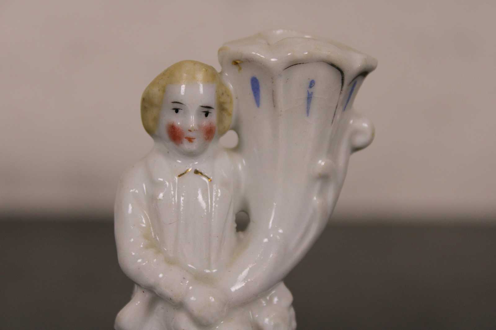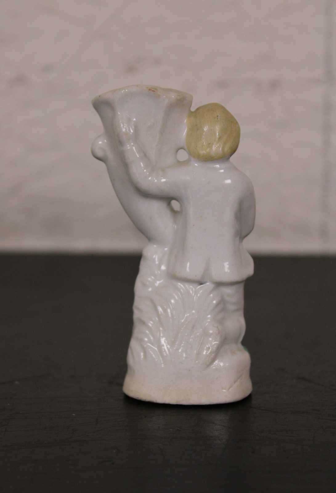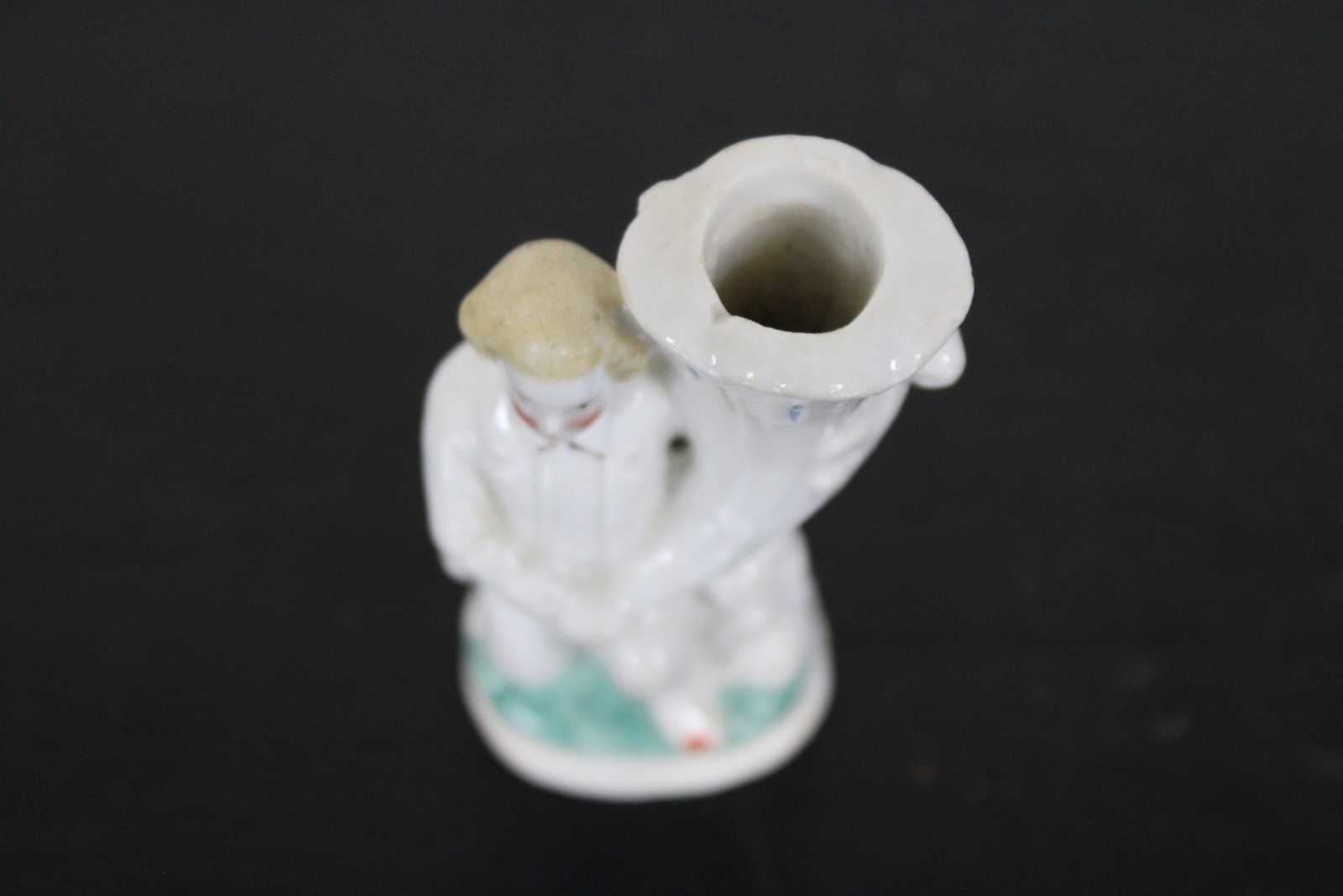 Antique 19th century Staffordshire porcelain bud vase figurine in the shape of a man on one knee holding a large cornucopia horn.