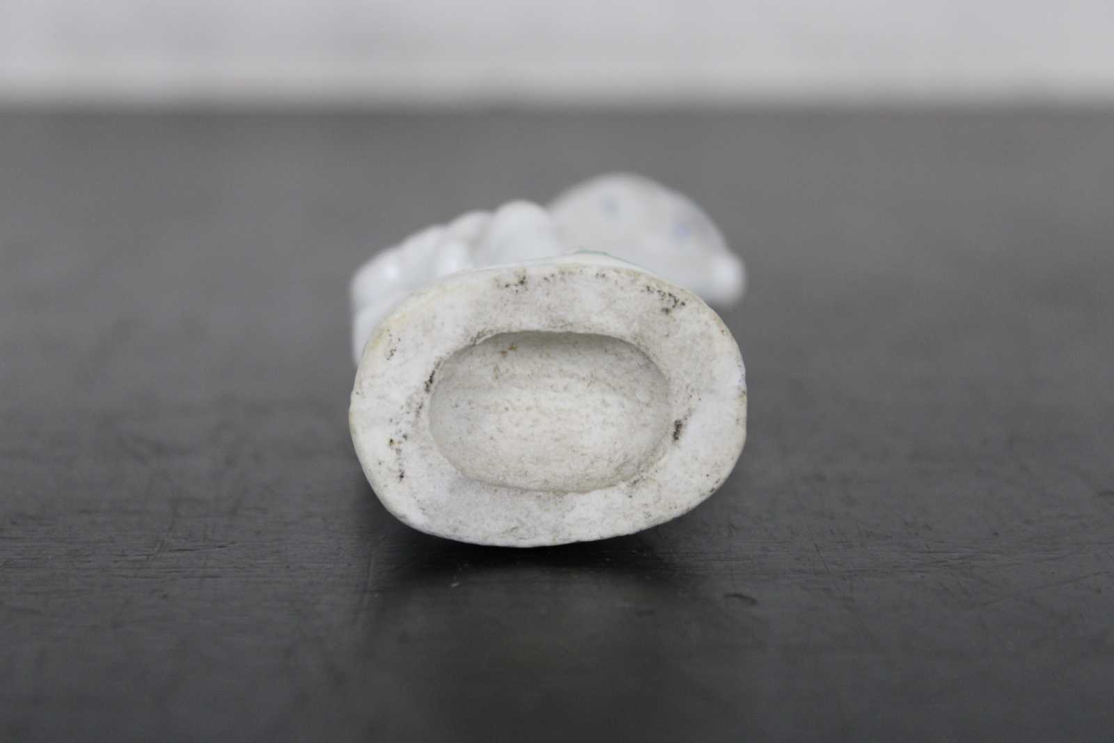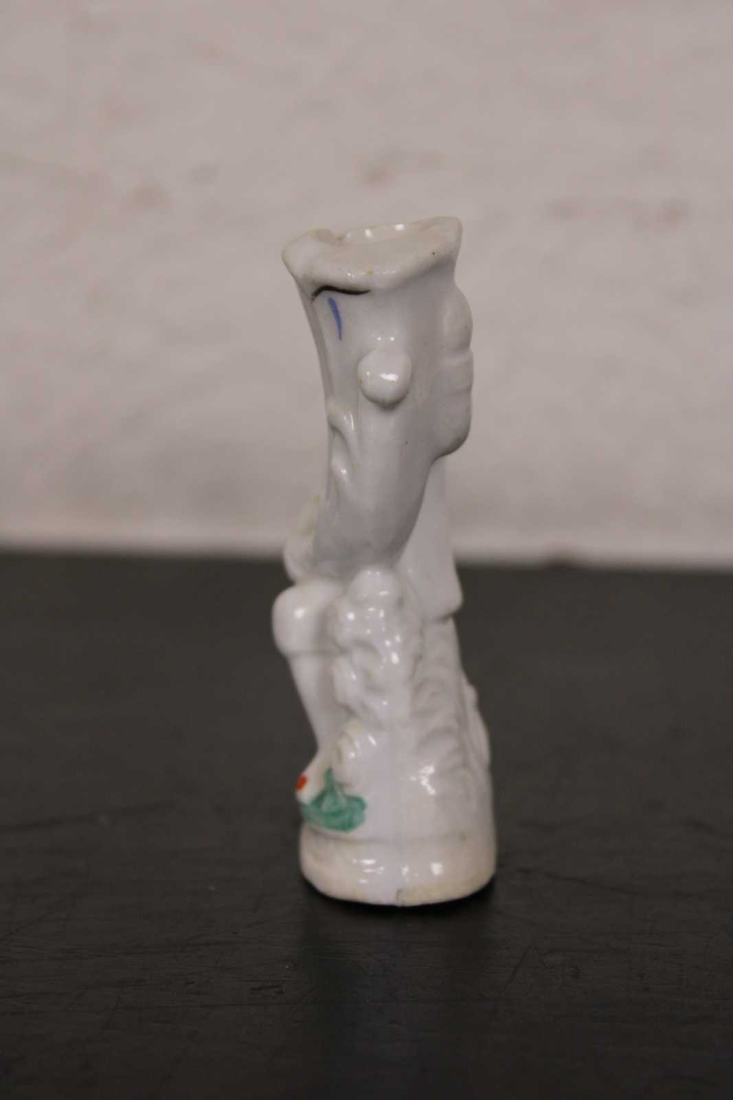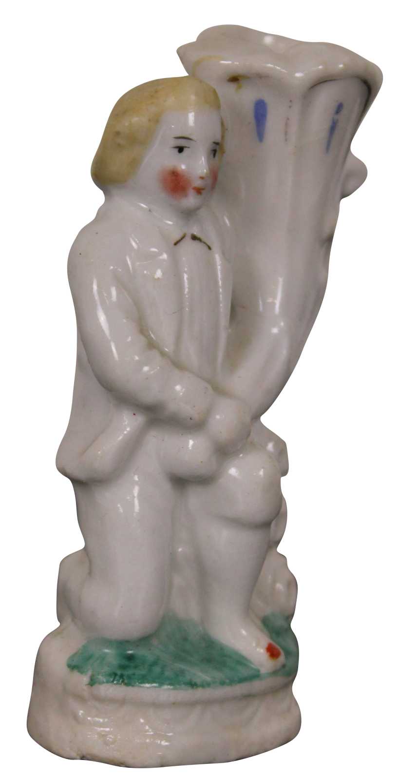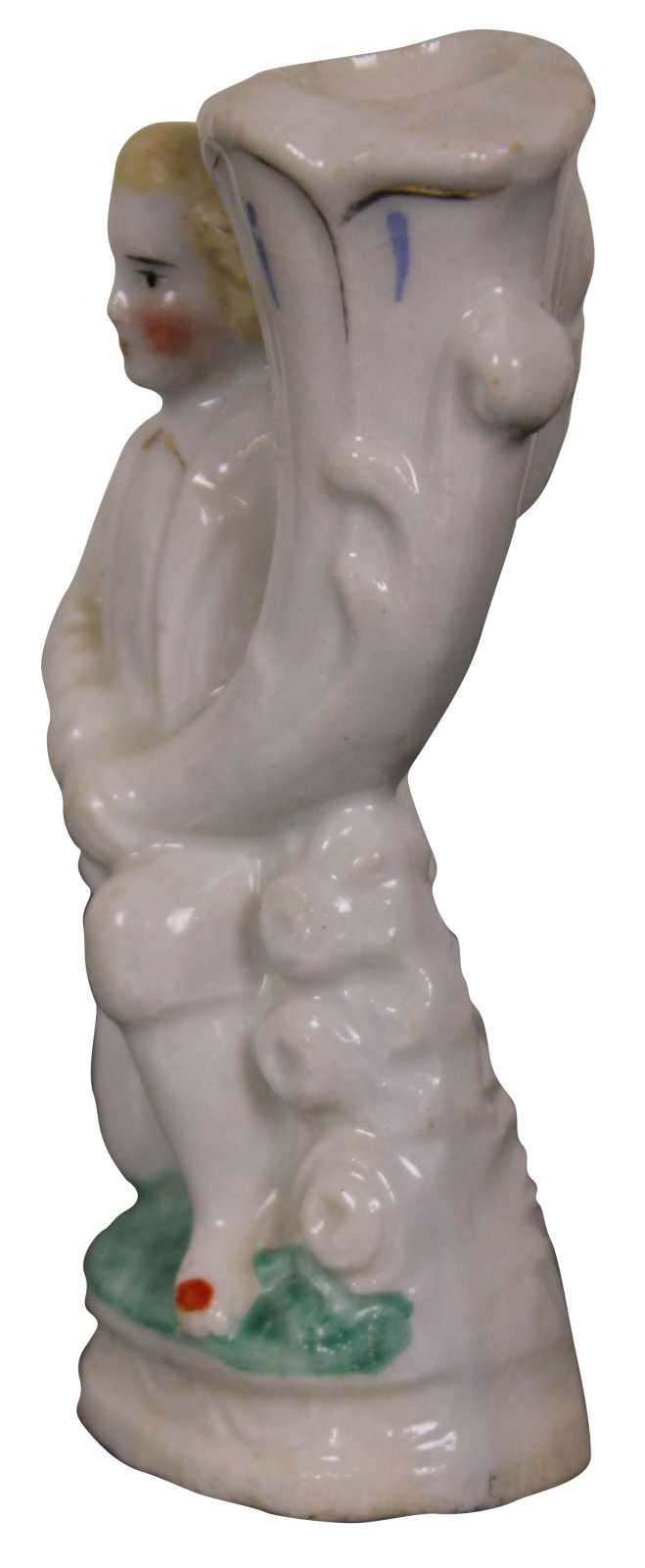 Antique 19th century Staffordshire porcelain bud vase figurine in the shape of a man on one knee holding a large cornucopia horn.