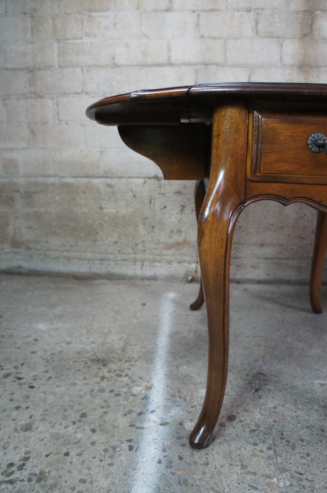 Pair of two vintage 1986 Ethan Allen French Country oval drop leaf side tables featuring serpentine form with one drawer. Made from Maple & Birch