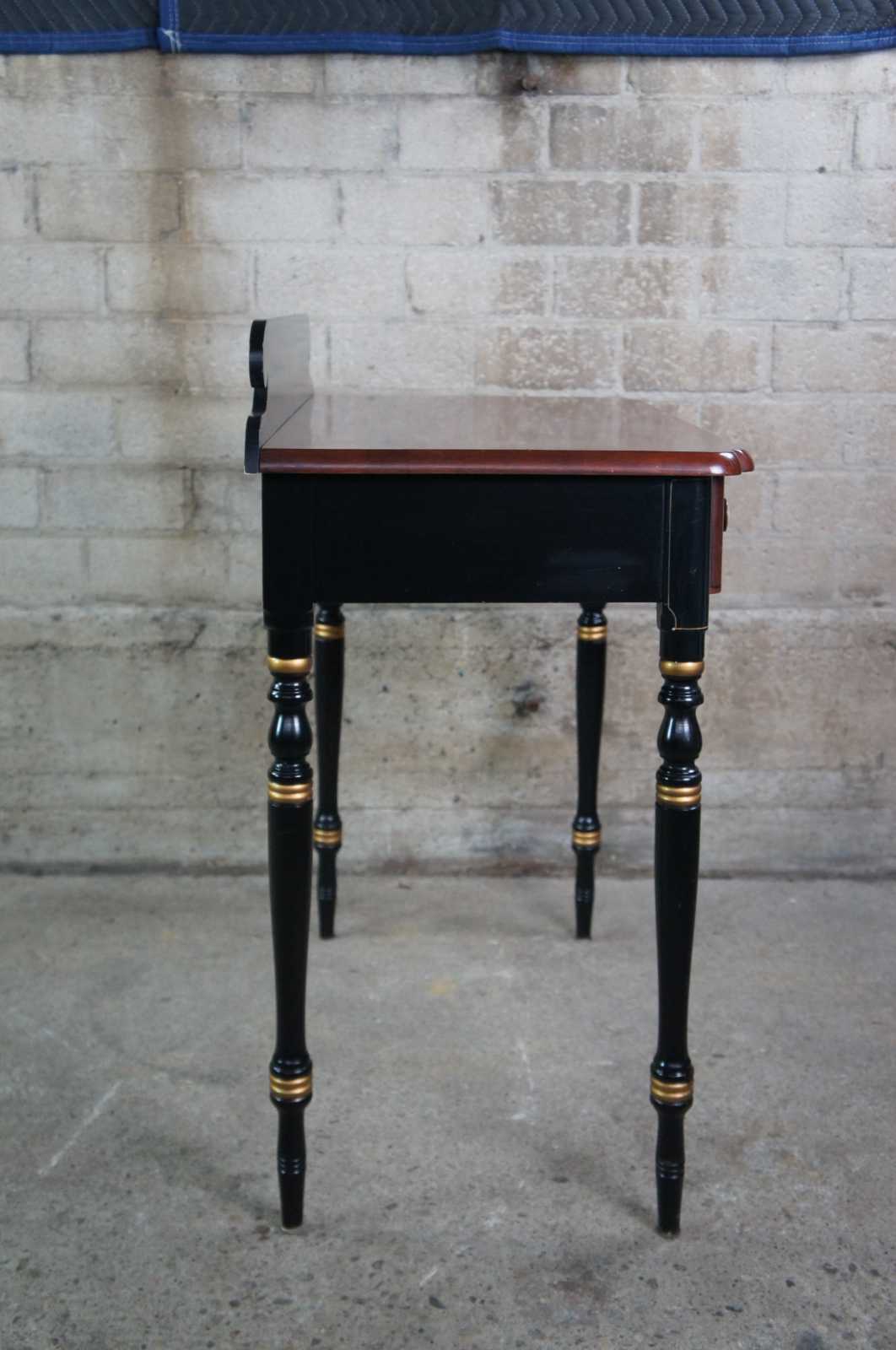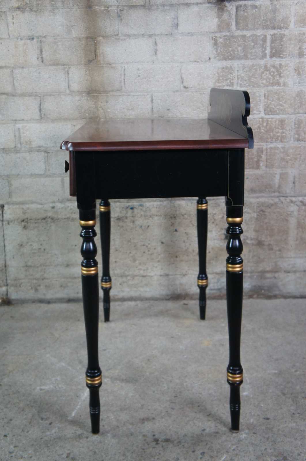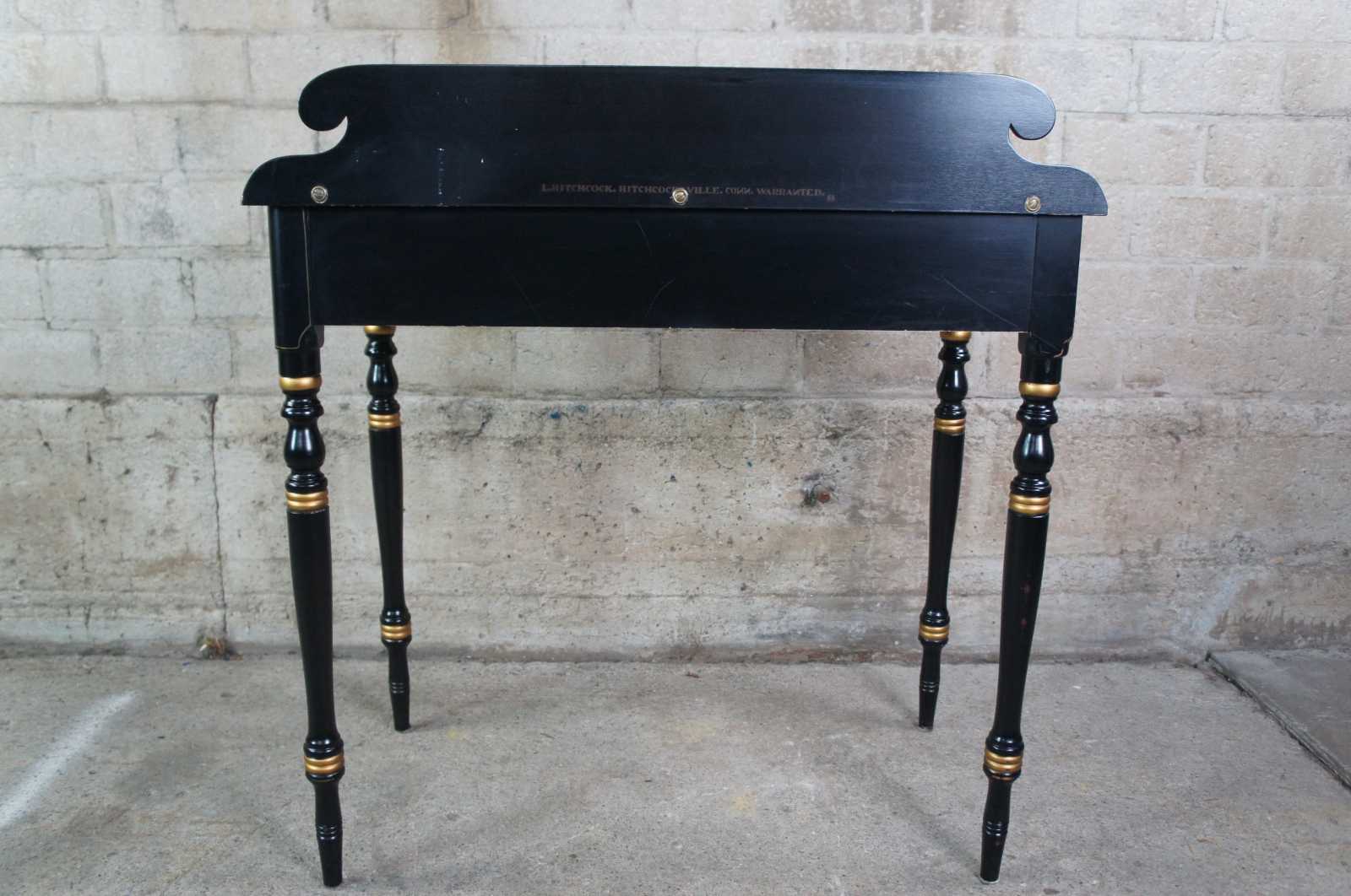 Vintage Lambert Hitchcock Black Forest stenciled Legacy writing desk or console. Made of maple featuring black ebonized finish with gold accents and stenciled arrangement of goards and vegetables. Includes porcelain knobs with an eagle carrying a flag.