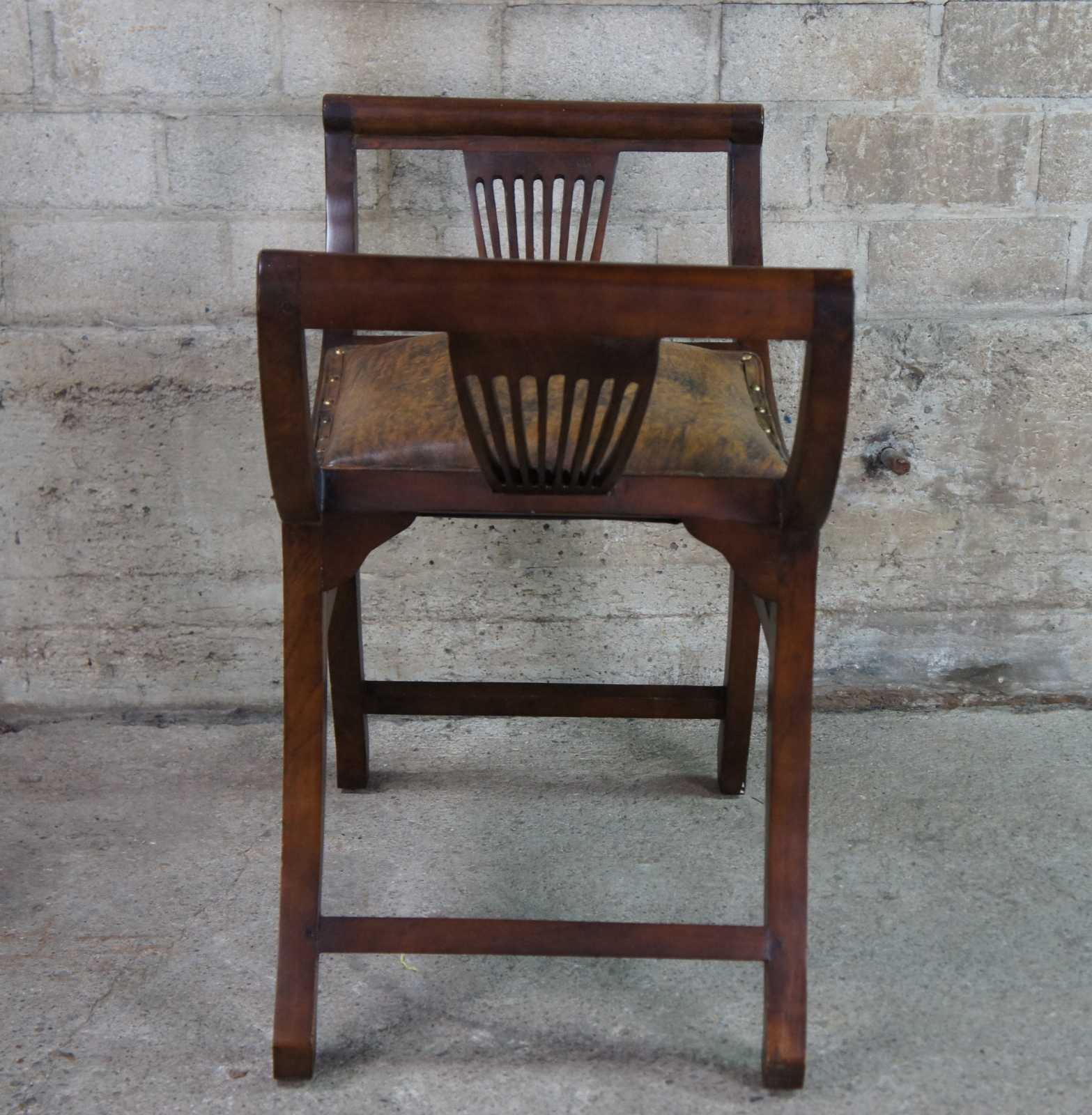 Antique early 20th Century curule chair. Made from mahogany with saddle shaped seat leading to satted arms over flared base.