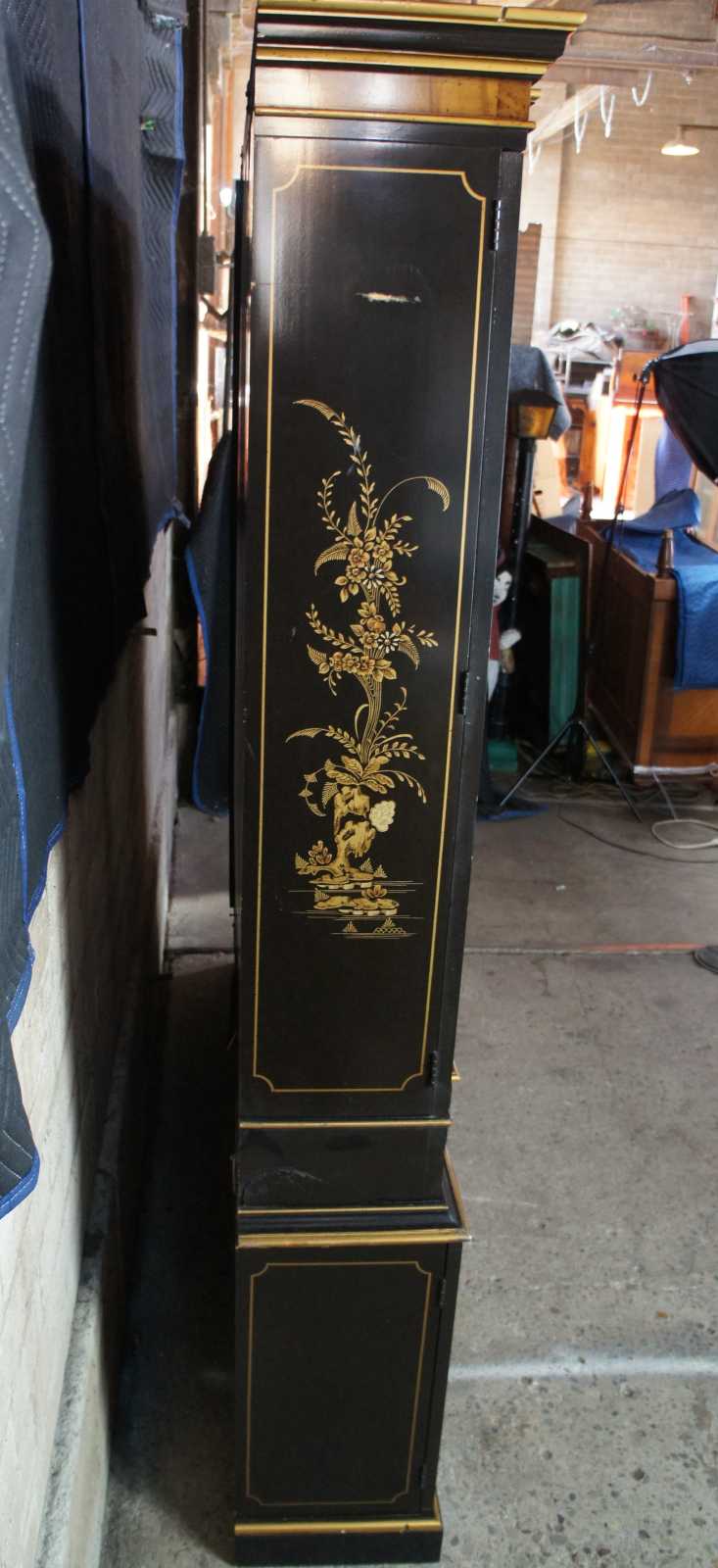 Vintage 1984 Drexel Heritage Et Cetera Chinoiserie breakfront china cabinet featuring black lacquer with gold painted accents, and pagoda mountain / water landscape scenes with geisha, fisherman, trees, and birds.
