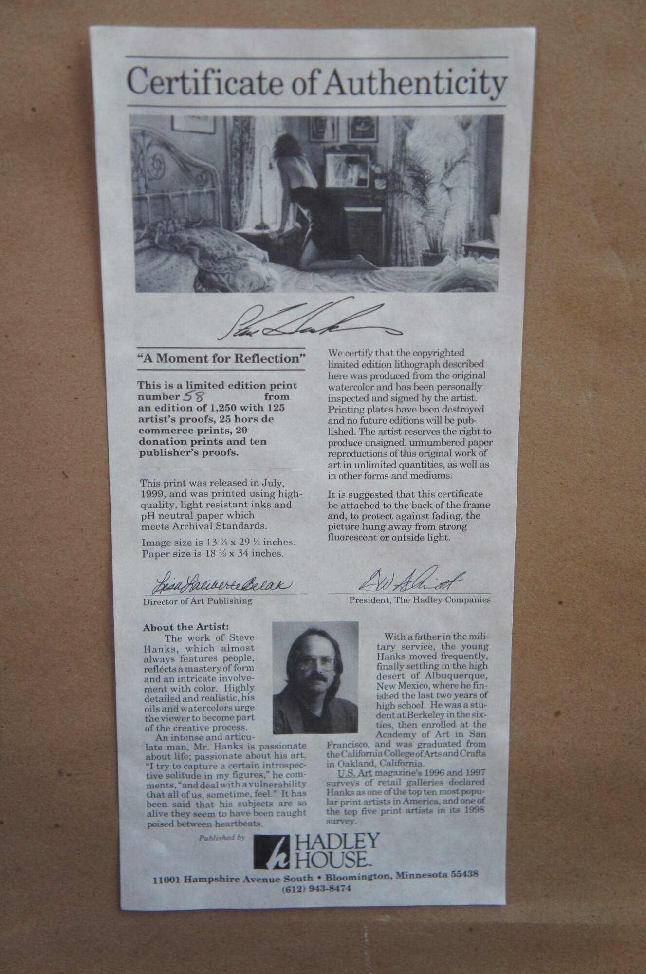 A limited edition lithograph by artist Steve Hanks titled ‘Moment of Reflection’ depicts a young woman looking into a mirror and comes with a certificated of authenticity. Hand signed, numbered and professionally Framed