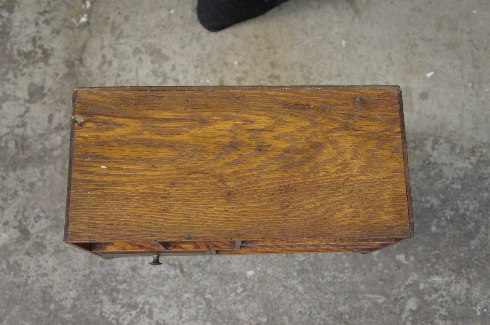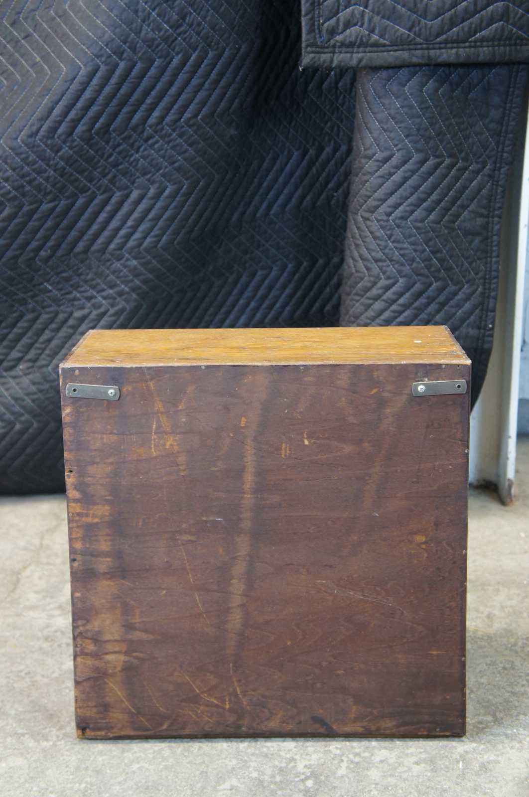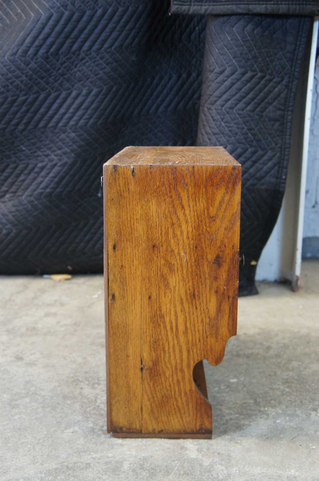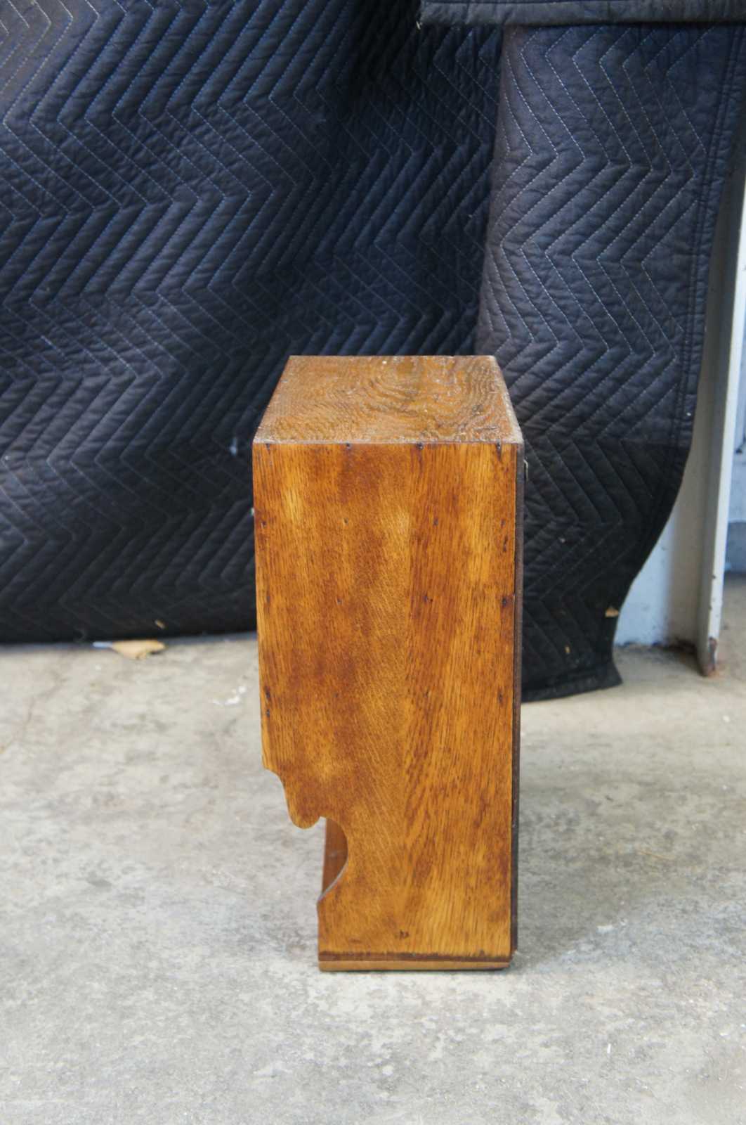 Antique oak desktop or hanging organizer. Includes 5 cubbies and a drawer for storage over a large lower shelf.
