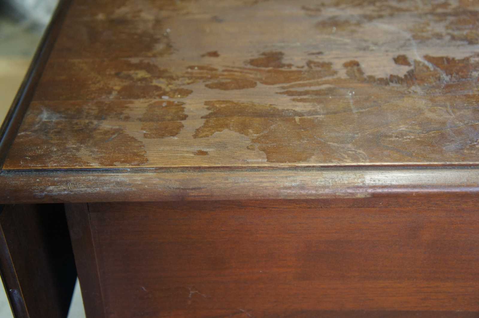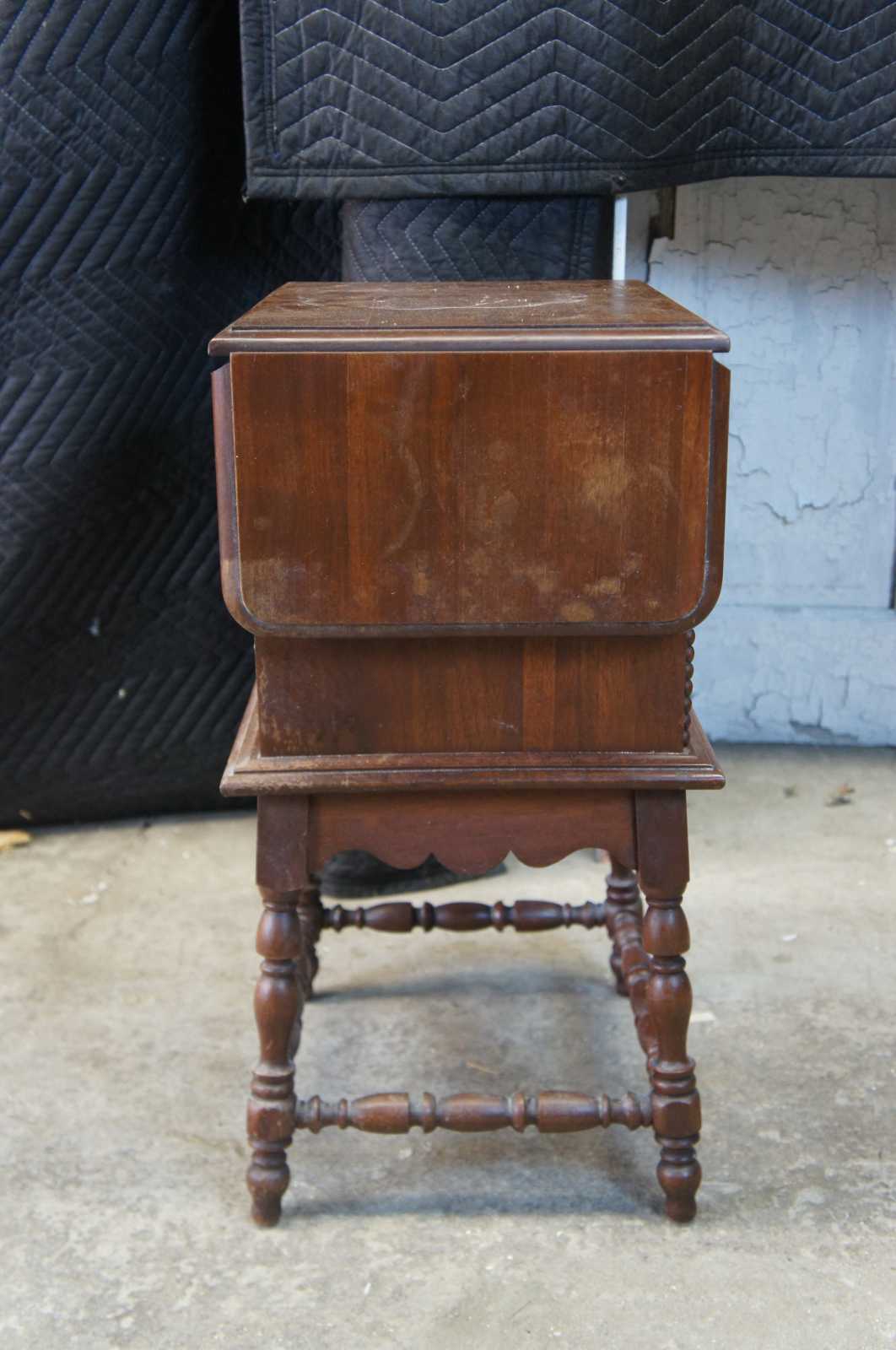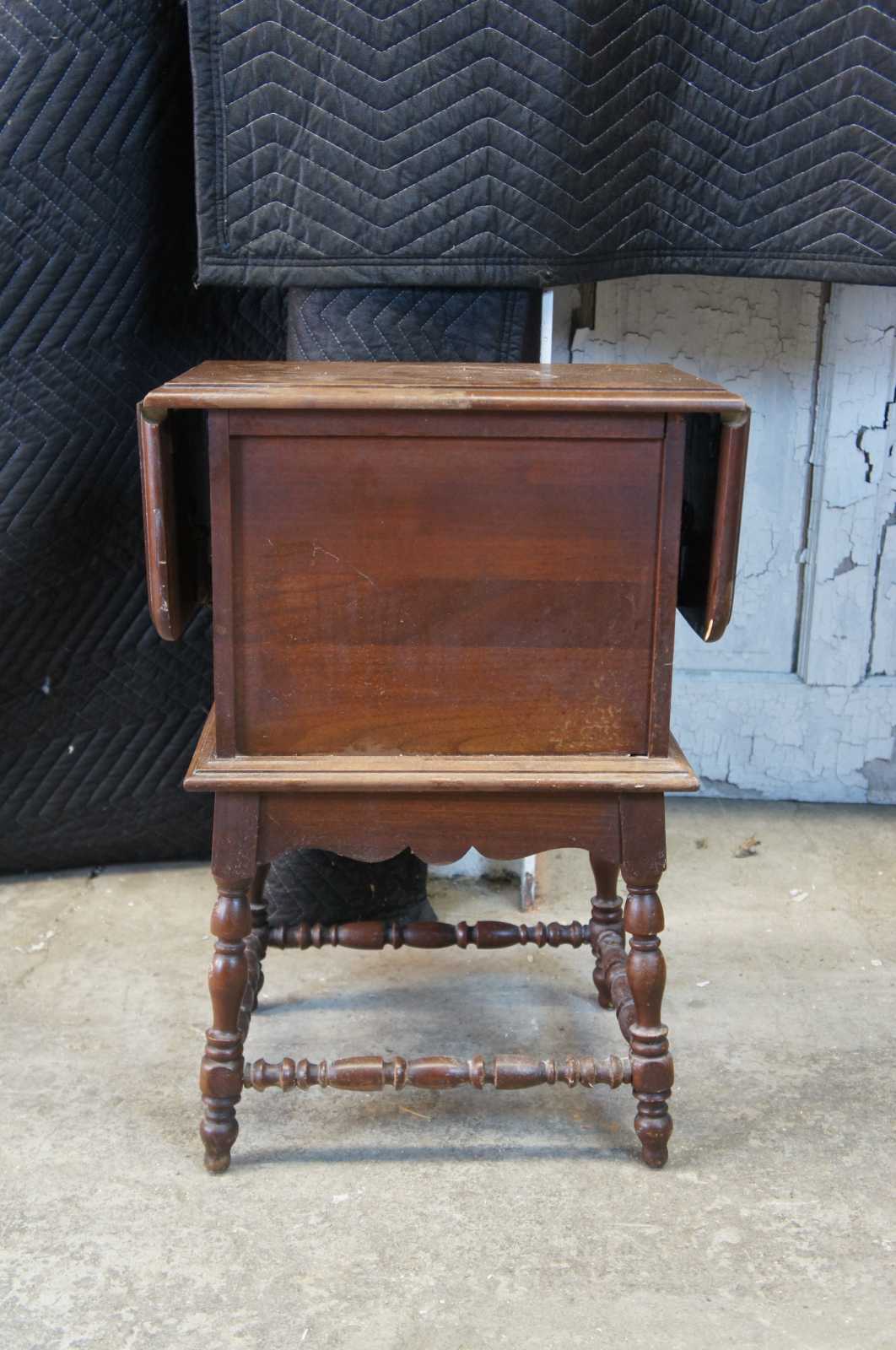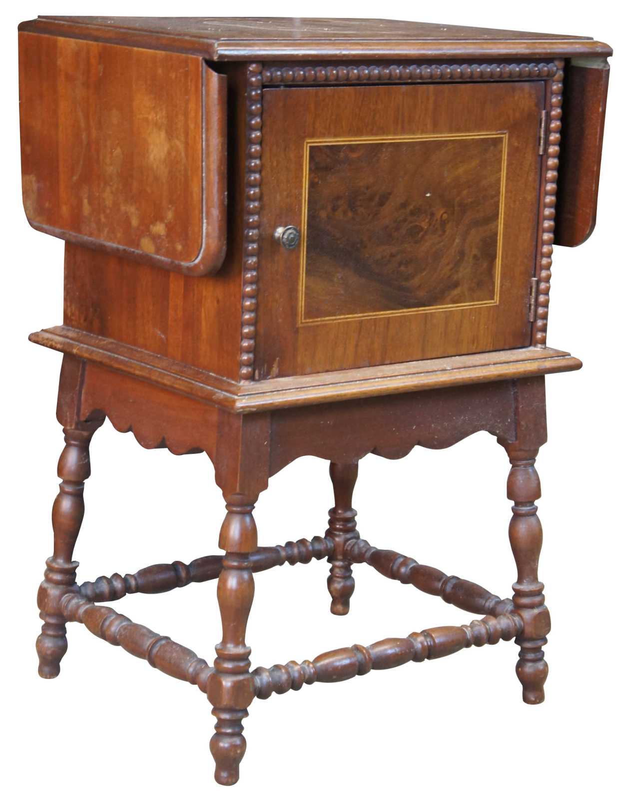 Circa 1940s humidor table. Made from walnut with burled front and metal lined interior Includes beaded trim, drop leafs and turned base