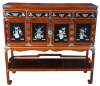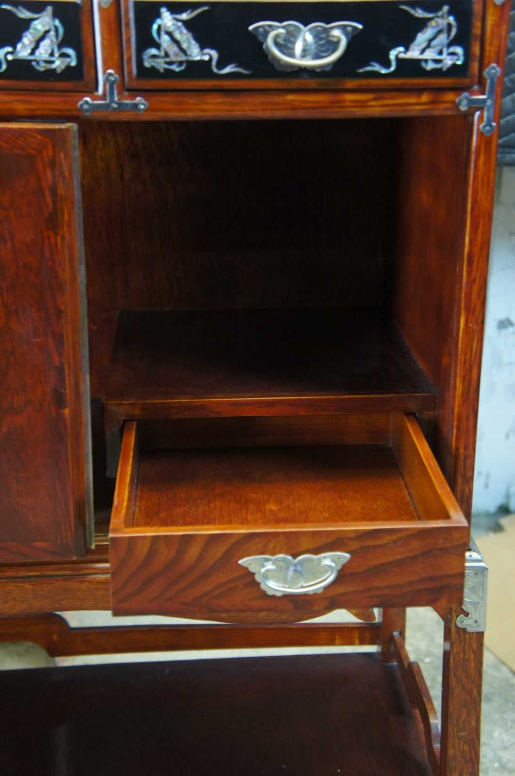 An exquisite chinese chest or cabinet on stand. A rectangular form made from elm with vibrant mother of pearl inlay set within black cabinet and drawer fronts. Neatly accented with silvertone hardware. The cabinet features four upper drawers and lower cabinet with lock Lower cabinet opens to a central space that shows a glimpse of two hidden drawers. Each drawer is revealed when the cabinet doors are slid towards the middle. The cabinet is supported by a ming style base.