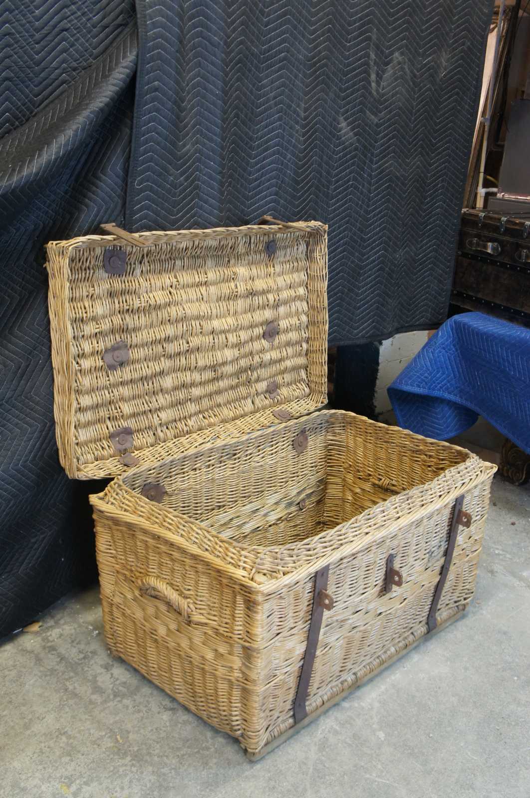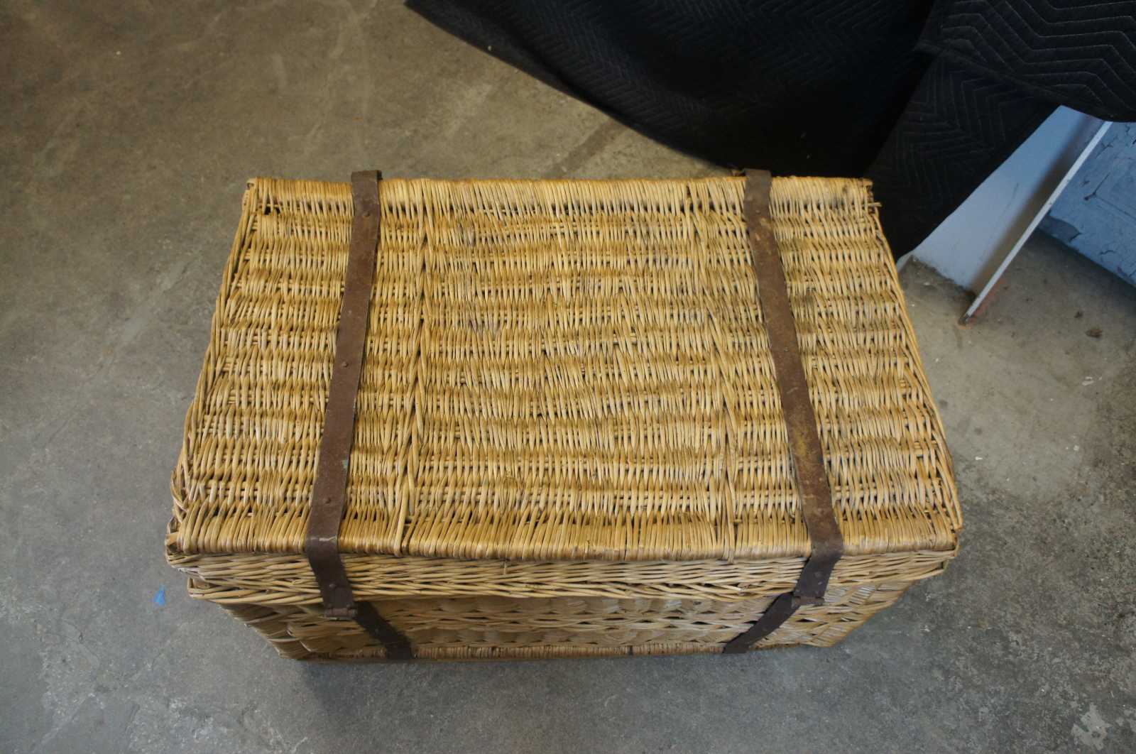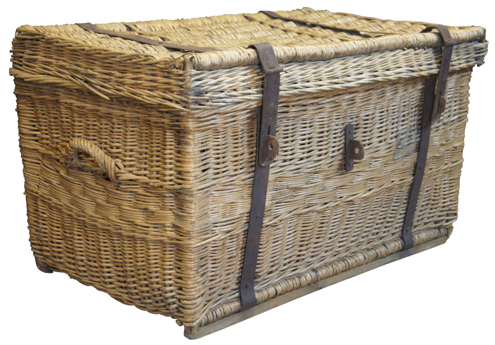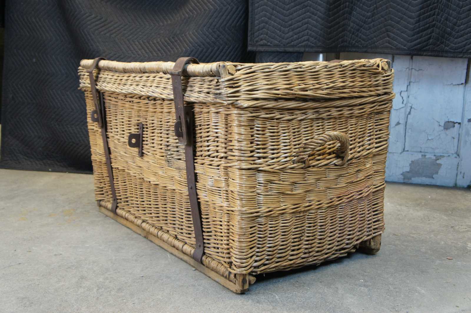 Early 20th century European wicker trunk. A nice oversized carrier with iron locking system. Features handles on each side. Great for use as a hamper, table or accent piece.