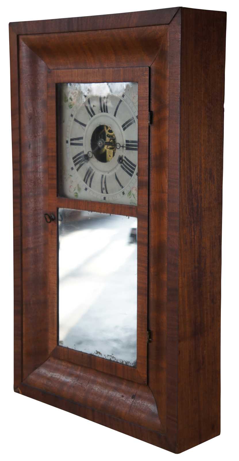 Antique mid 19th century Manross Prichard & Co 8 day shelf clock featuring Ogee (OG) form with mahogany case, brass works, roman numeral face and mirror. Circa 1843.