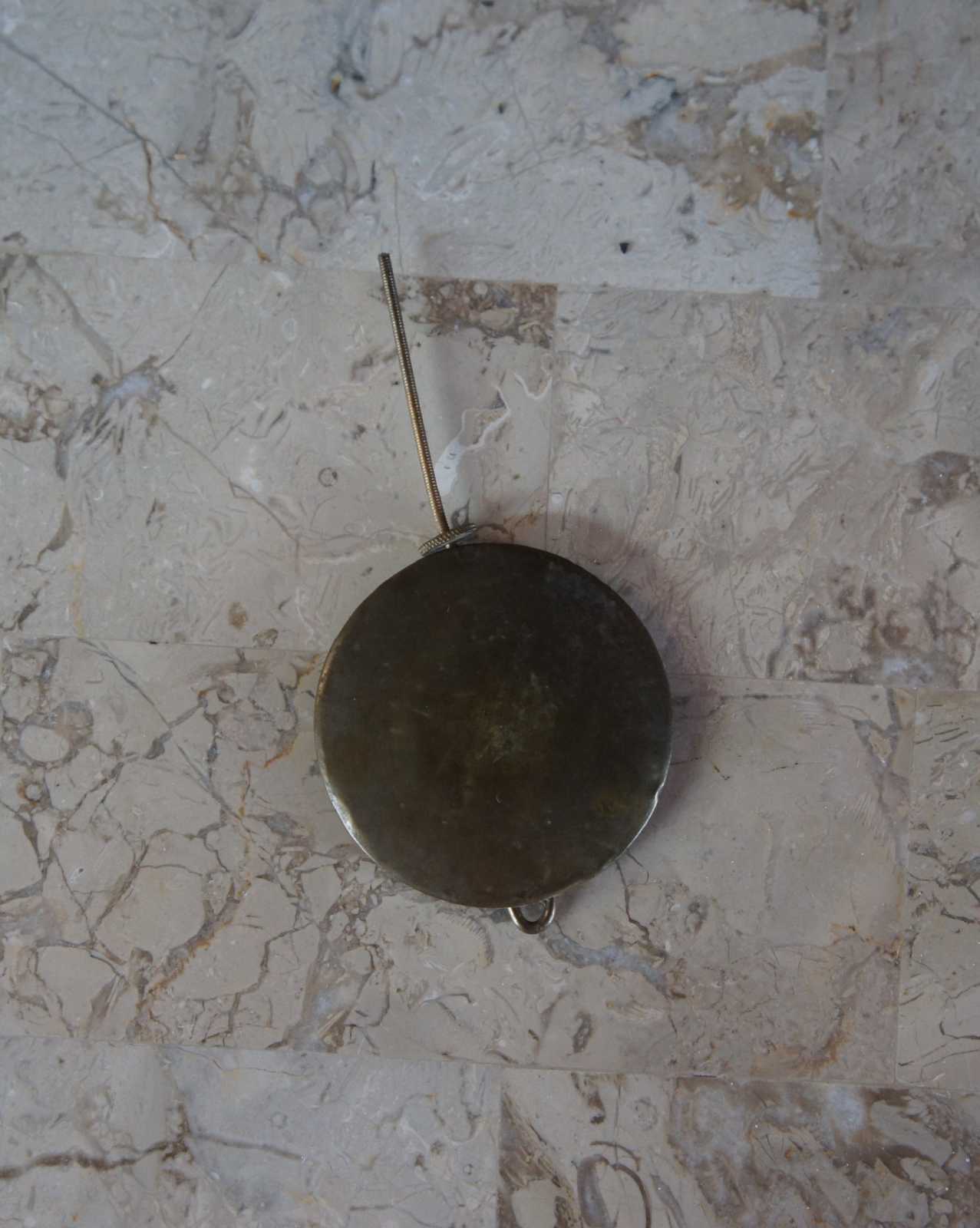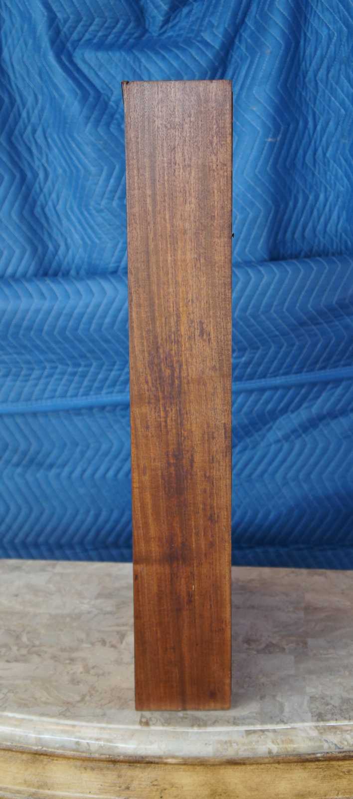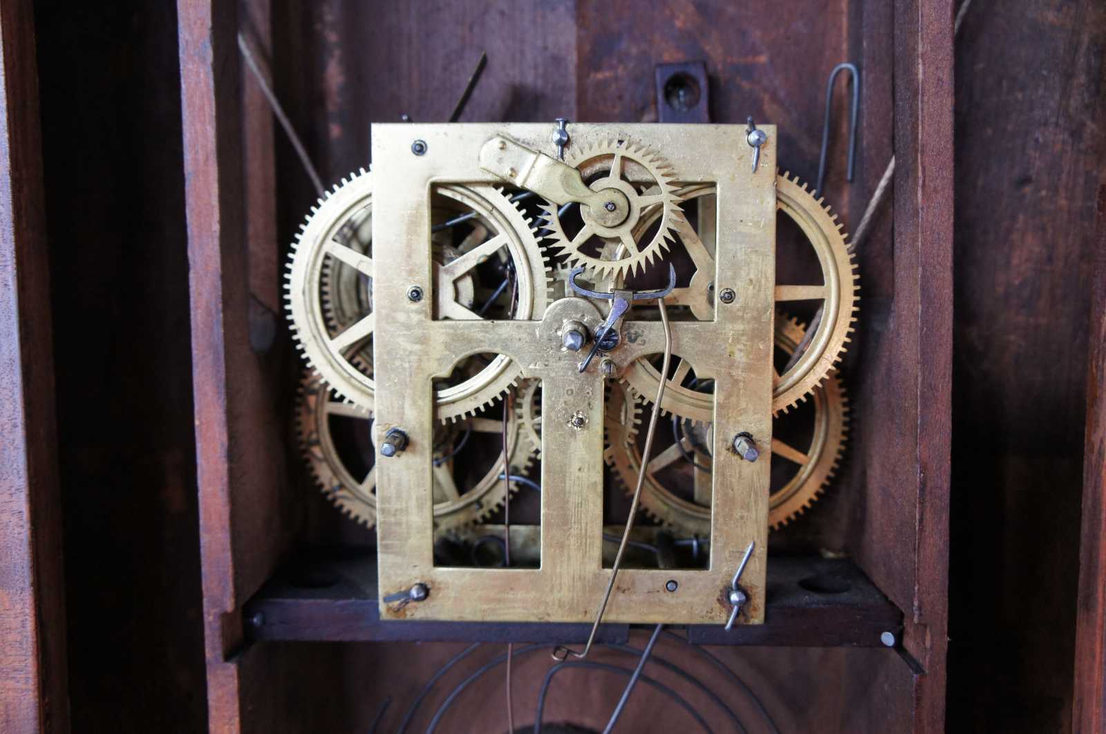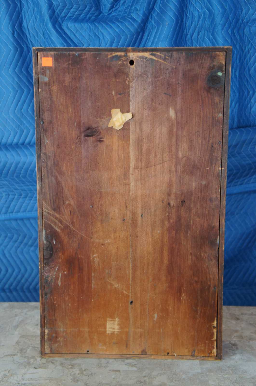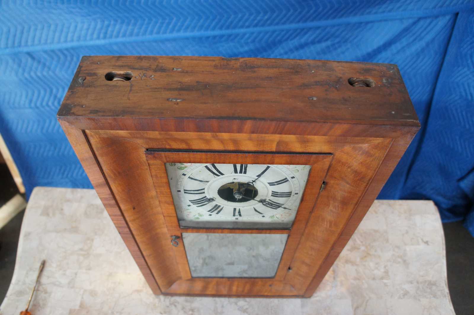 Good antique condition, wear and distressing commensurate with age and use, veneer loss to case lower left, paint loss / scratching to face, silver loss to mirror, working.