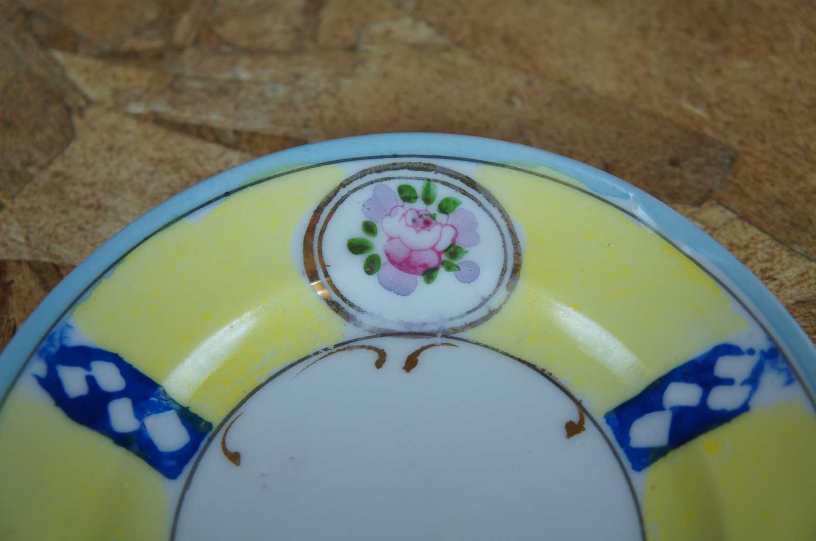 good, smoothed chip to saucer, wear to paint/gilding