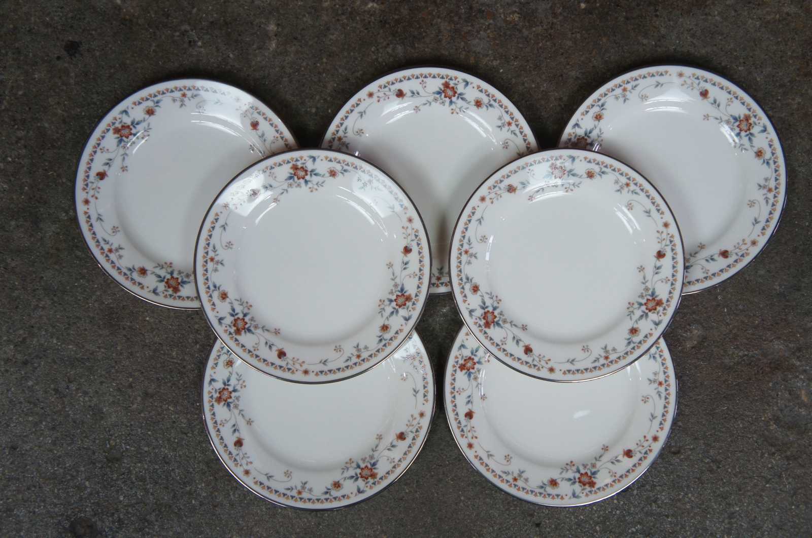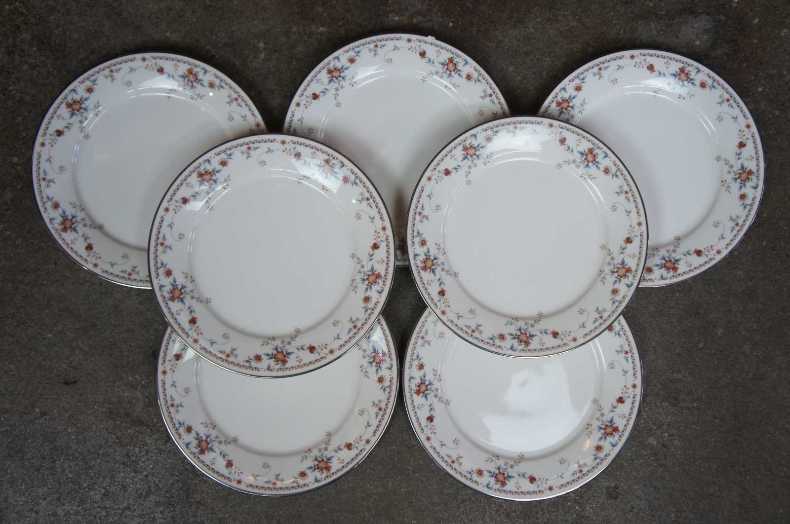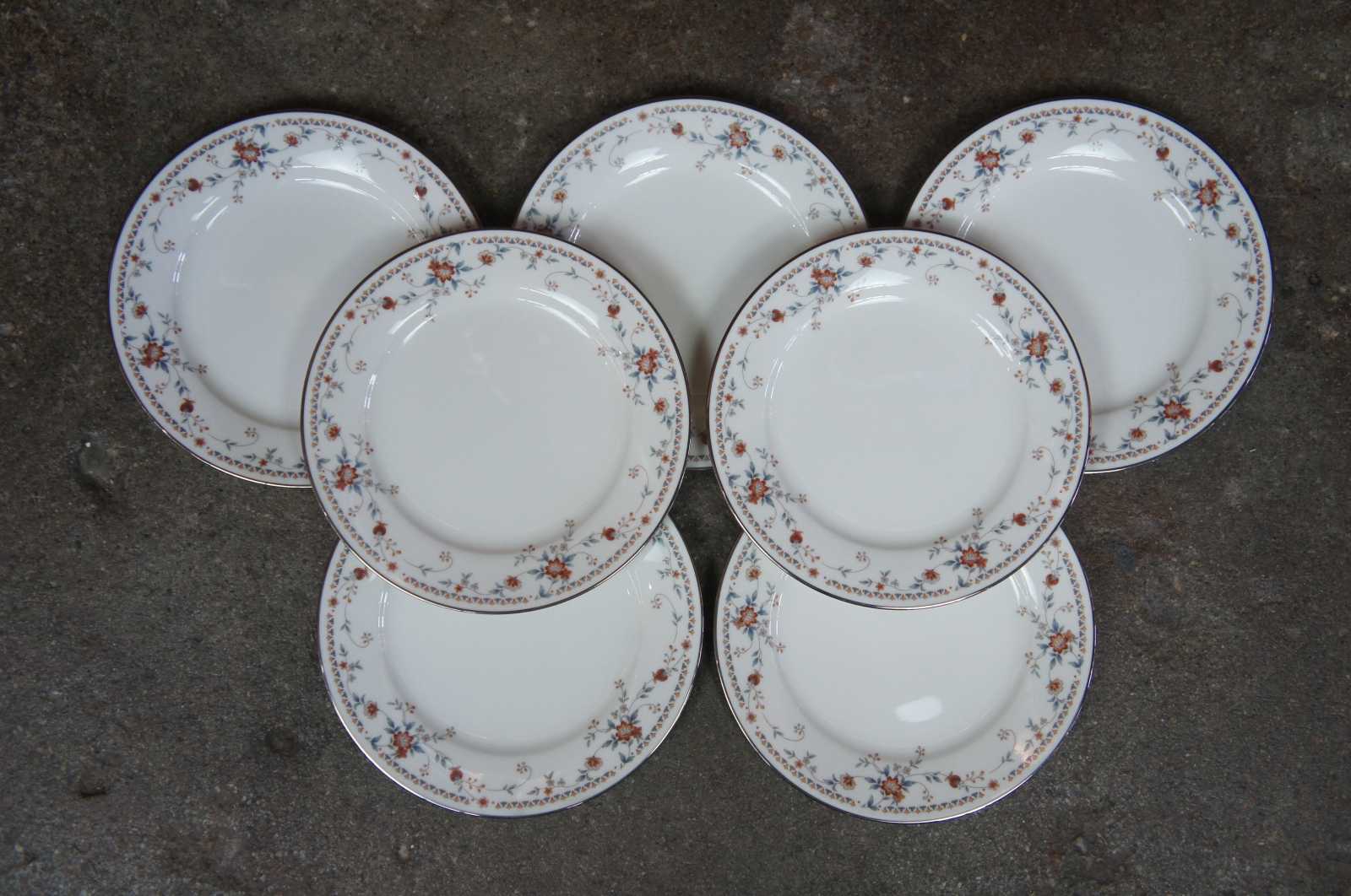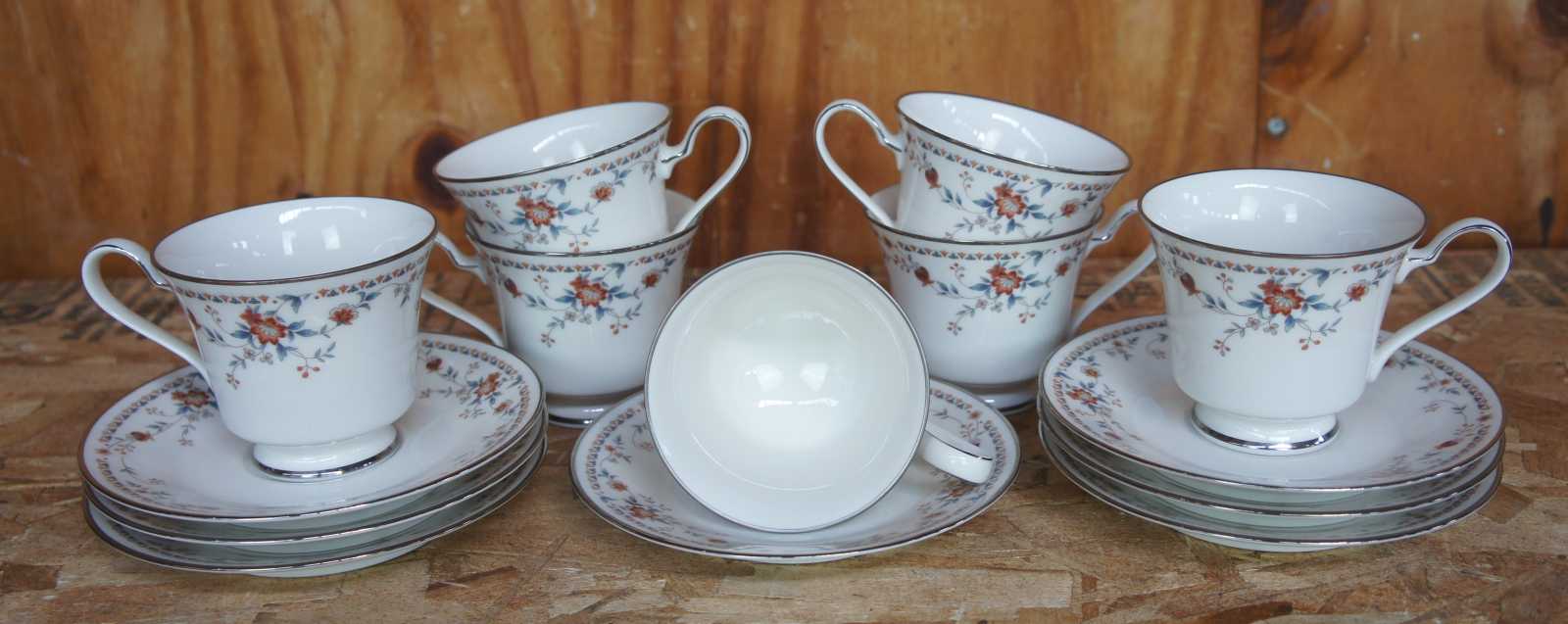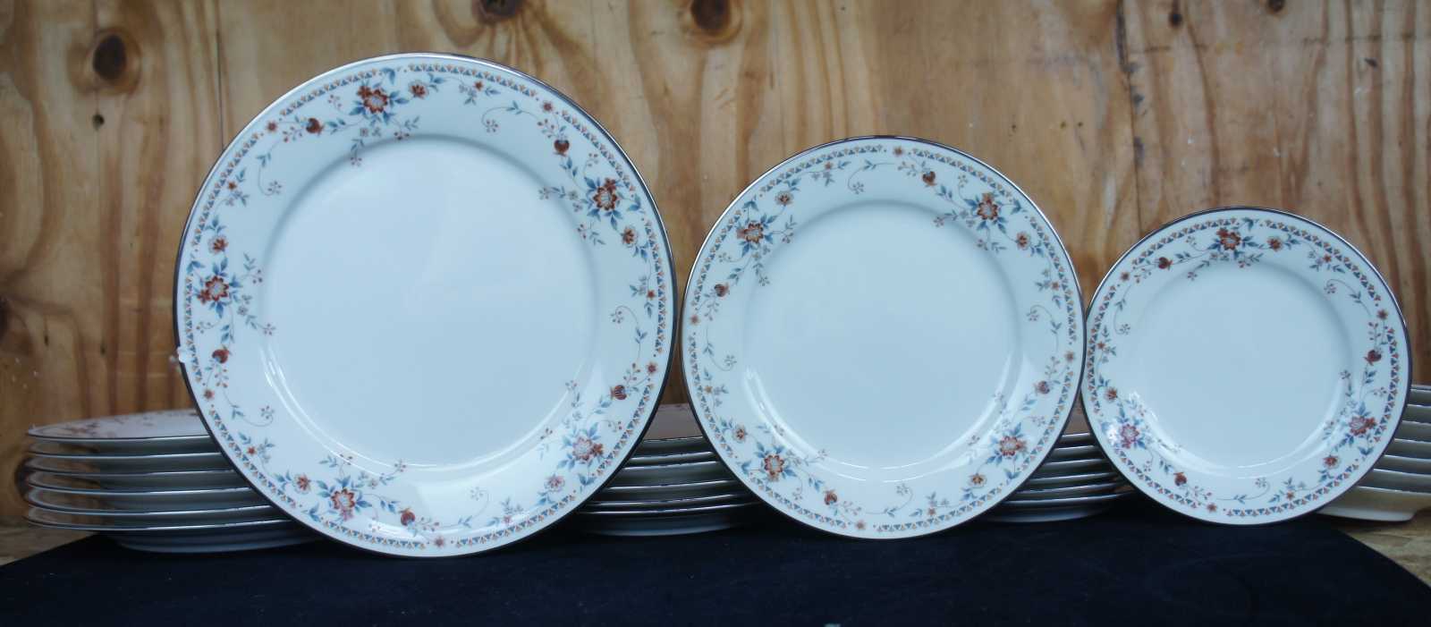dinner plate 7- 10.5" x 1"h, salad plate 7- 8.125" x 0.875"h, bread plate 7- 6.375" x 0.625"h, saucers 7-6" x 0.75"h, teacups 7- 3.5" x 3"h