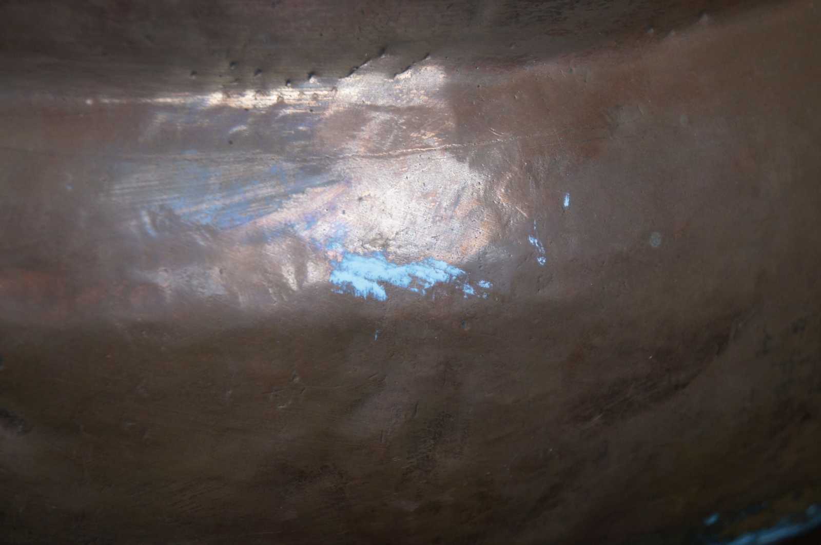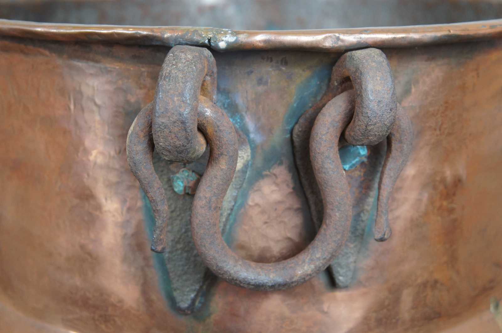 Monumental antique copper cauldron featuring hammered details with dovetailing and ornate forged iron handles.