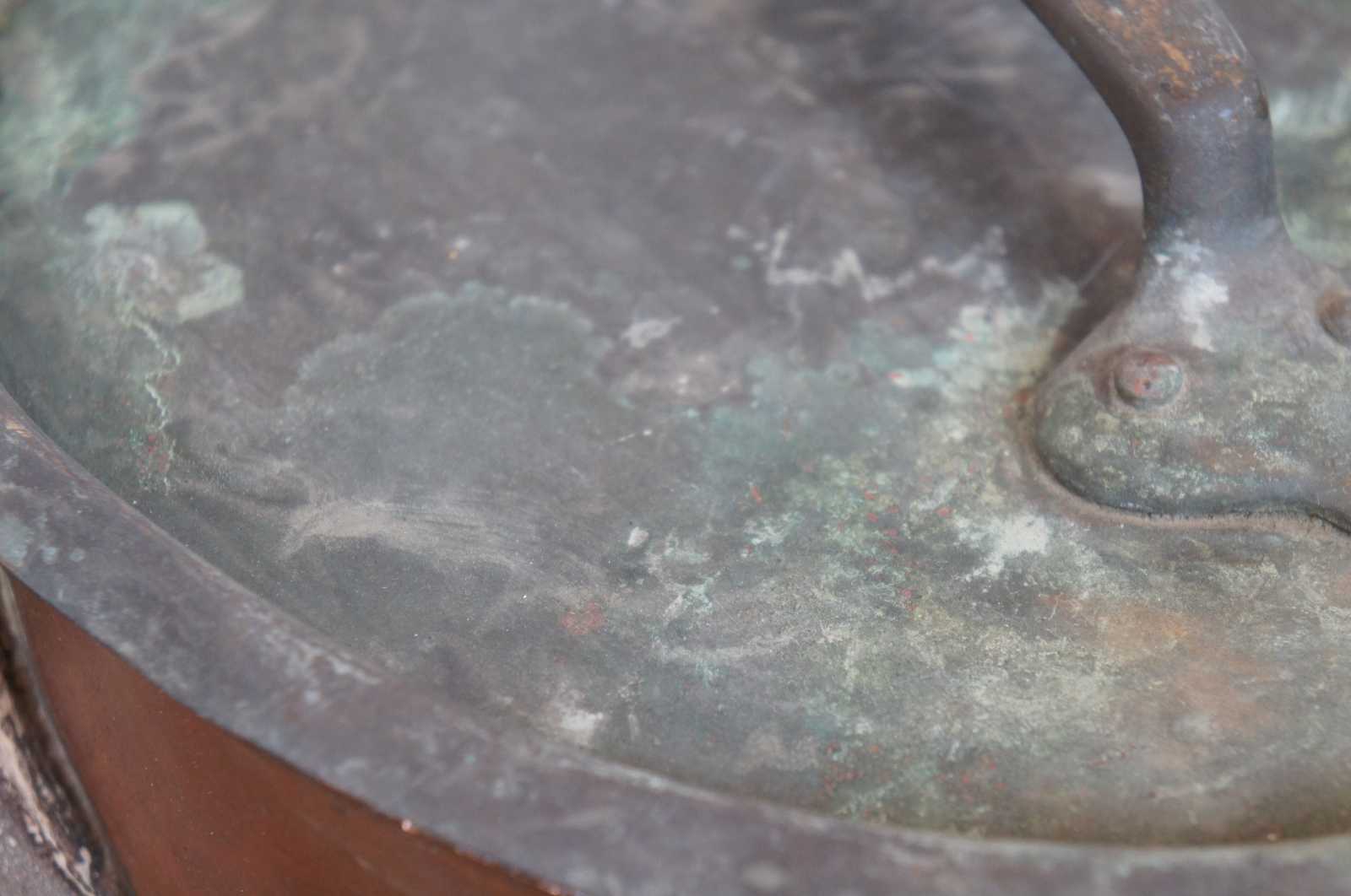 Antique French copper cook pot or saute pan featuring cast iron handle and lid.