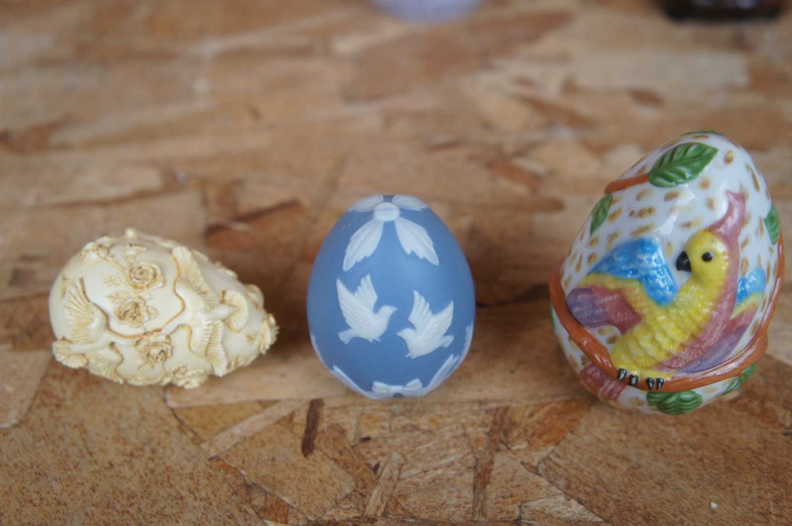 Twenty one vintage ornamental eggs made of various materials including glass, painted ceramic, polished marble, enameled cloisonne, faceted, jade, reticulated metal, wedgwood style, pewter, and carved wooden holders.