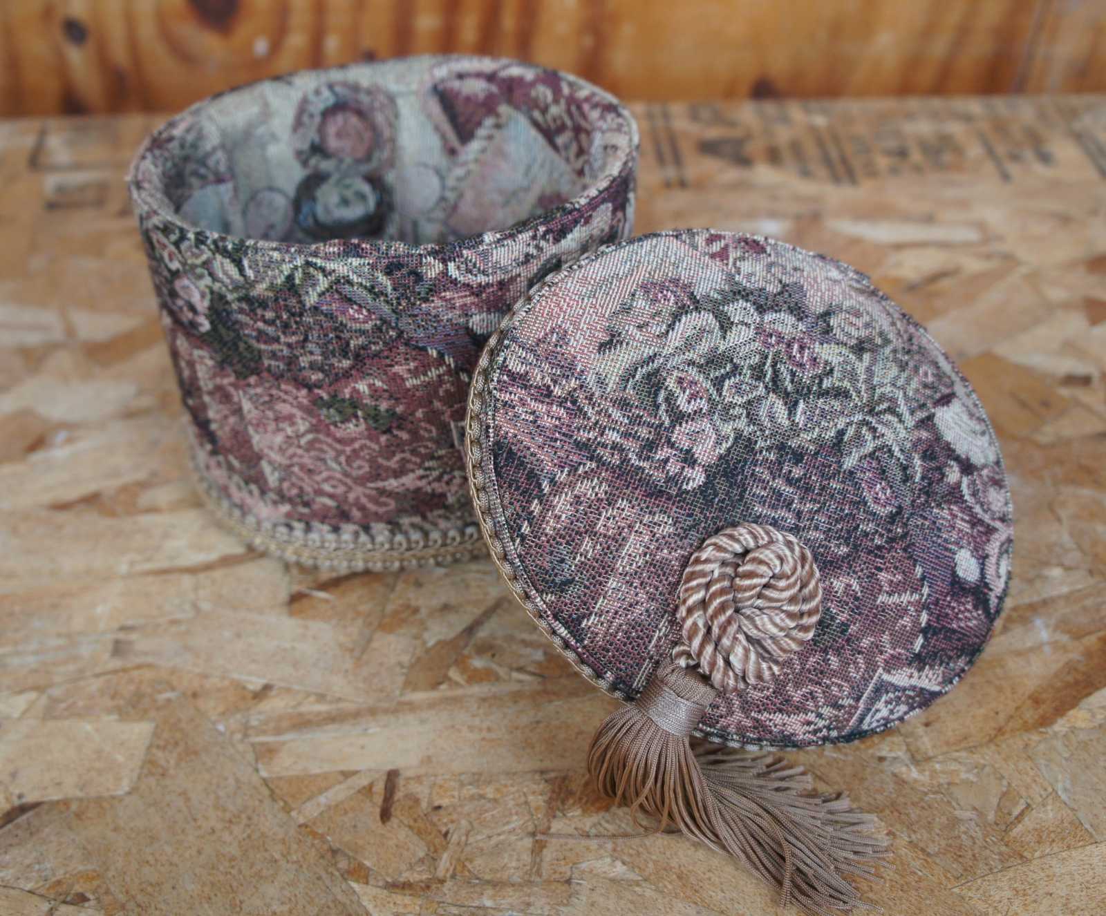 A lovely French brocade fabric covered keepsake jewelry, sewing, or boudoir box with decorative tassel.