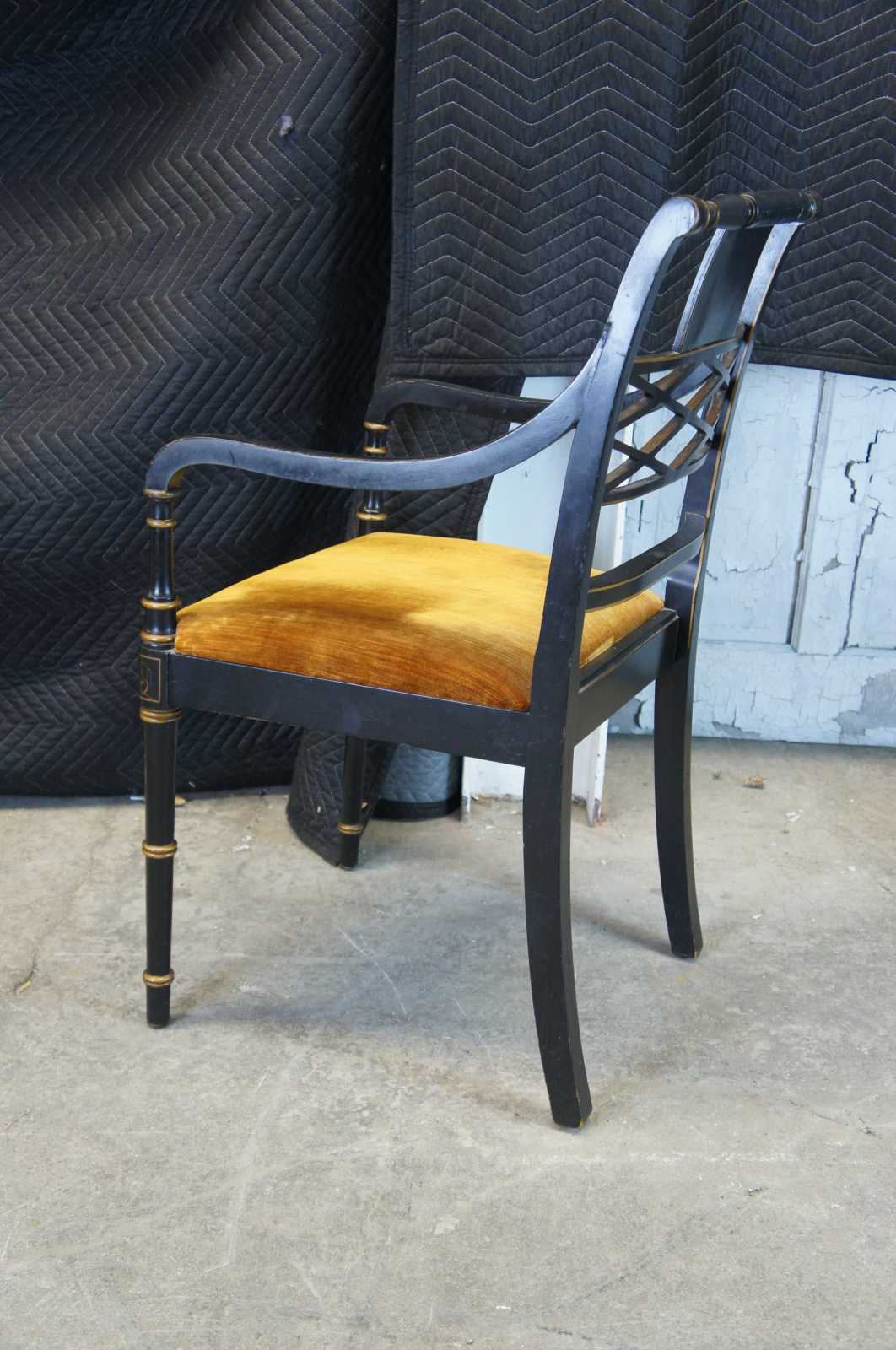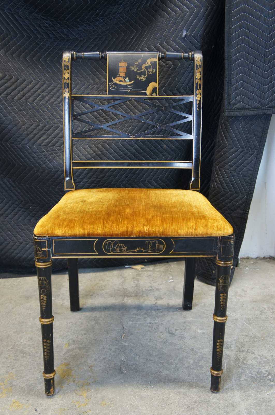 4 beautiful Chinese Chippendale inspired black lacquer dining chairs by Union National, circa 1980s. Features an open back with turned rail over painted sailboat waterscape and lattice fretwork. Each chair includes hand applied gold detail with florets and geisha scenes. Upholstered in gold.