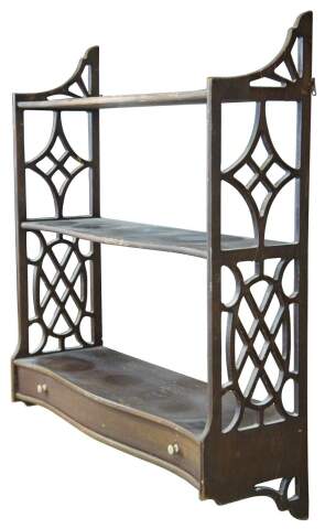 Mid 20th century Chippendale style Lewis Butler wall shelf, #131. A serpentine form made from mahogany with fretwork siding and lower drawer.