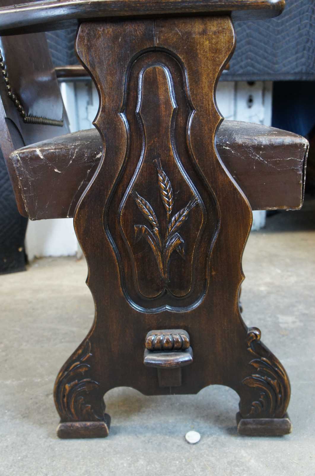 8 Antique French Country Old World oak dining chairs. An exquisite and unique form with molded side panels featuring wheat carvings and acanthus blocked feet. Upholstered in a brown leather with nailhead trim.