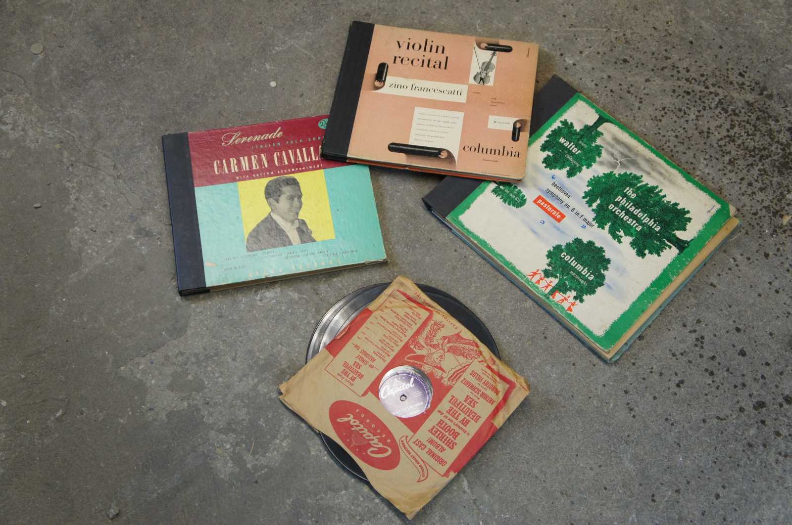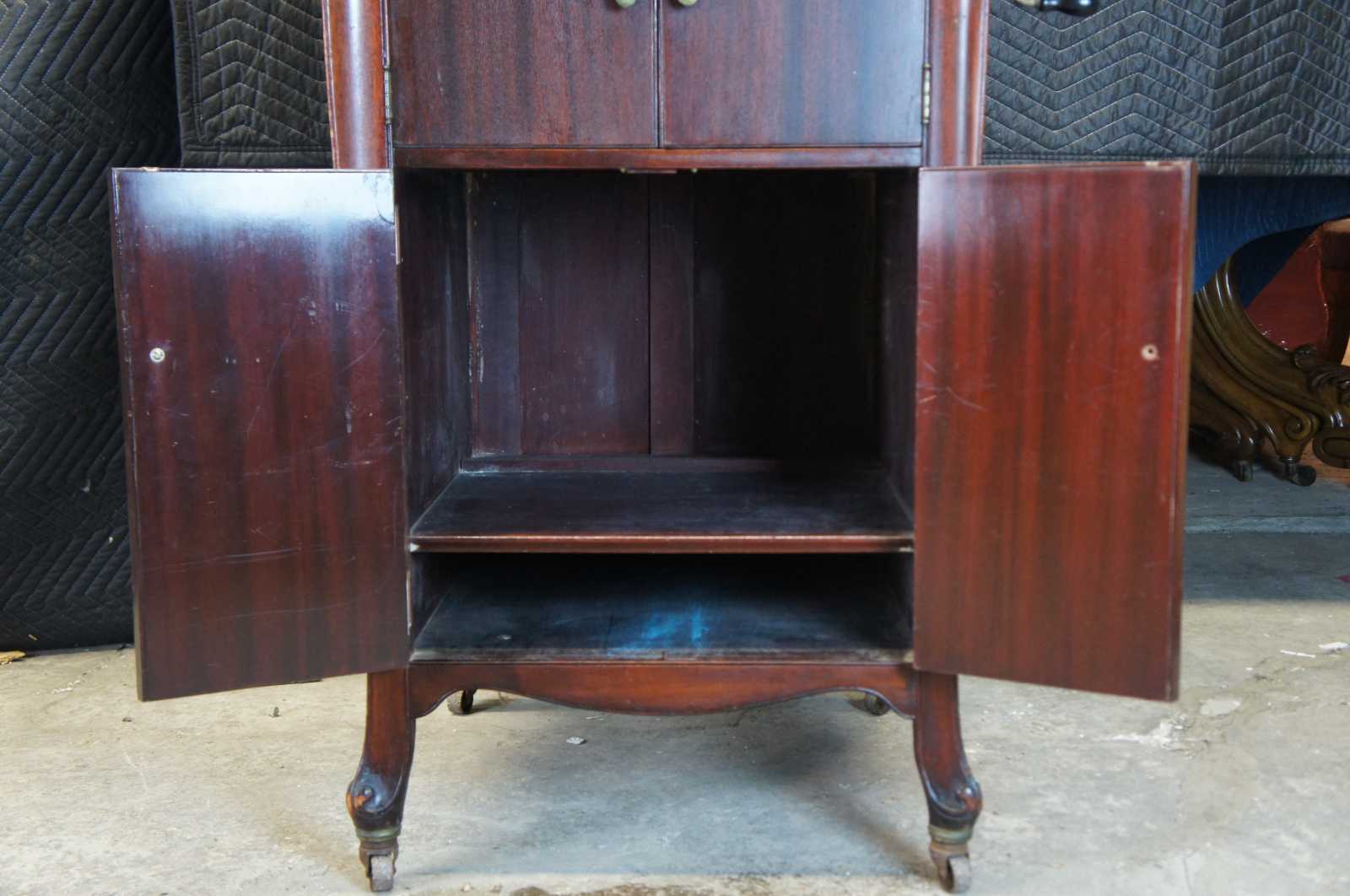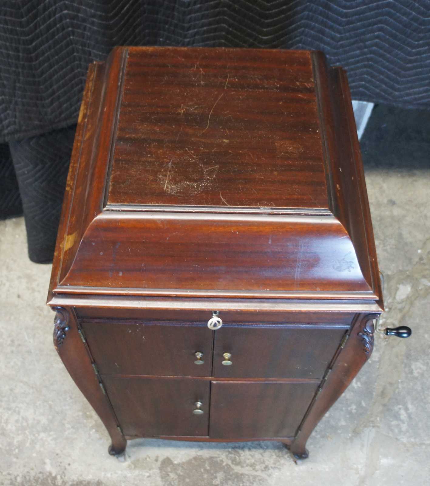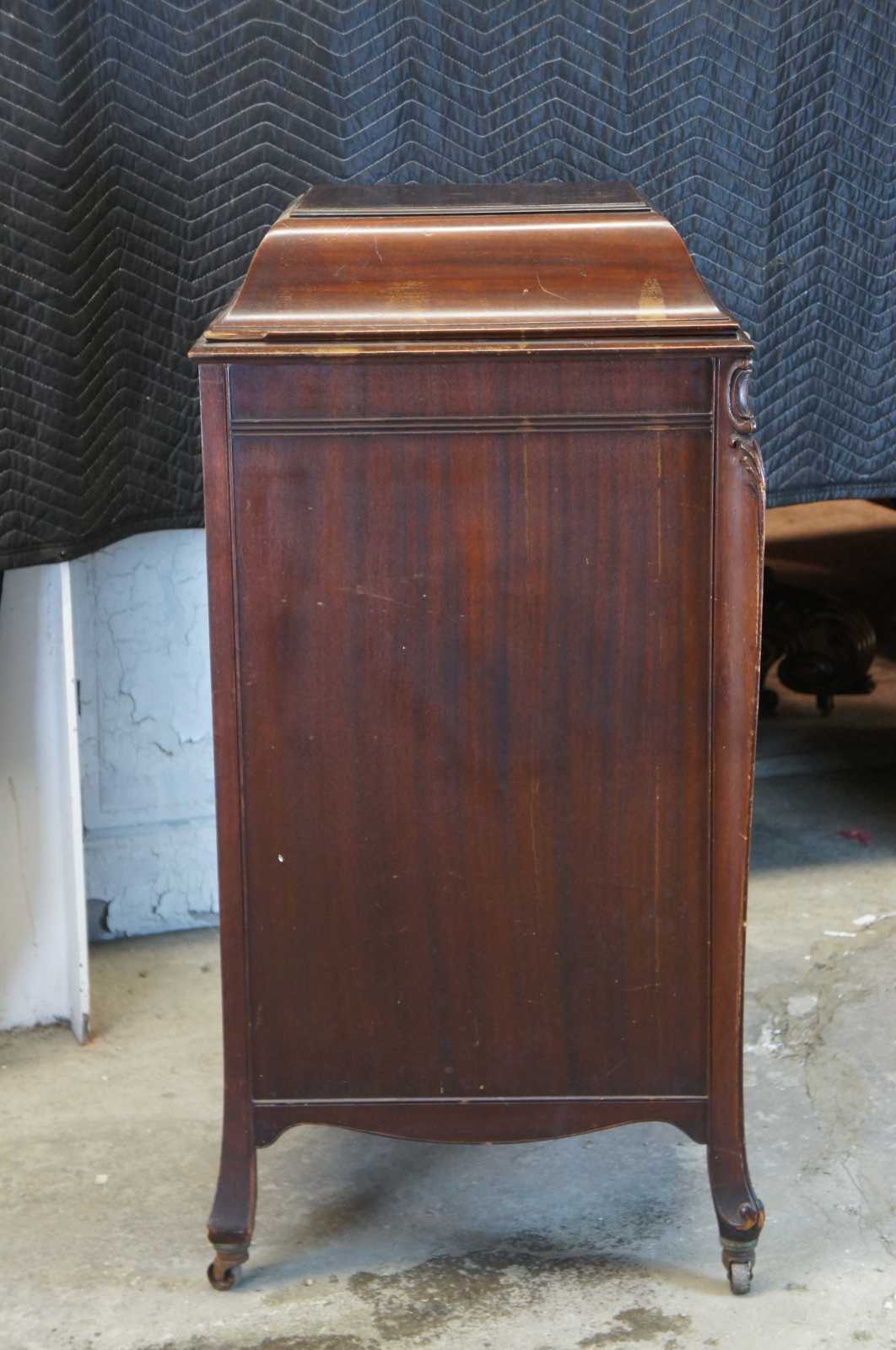 Good Overall; Crazing to the cabinet finish from age. Distressing and marking. Missing right door knob. The victrola seems to have a scratchy sound, unsure if it is the speaker or just in need of a new needle.