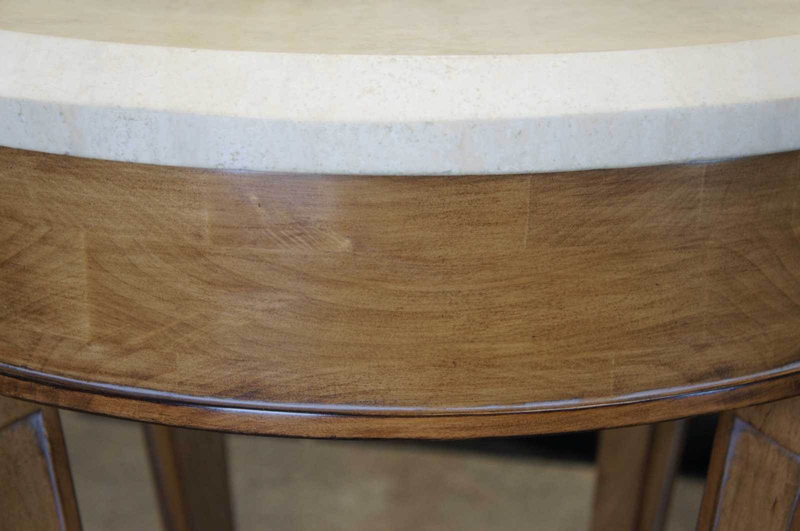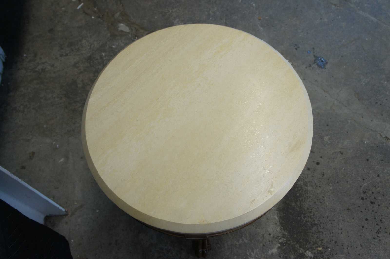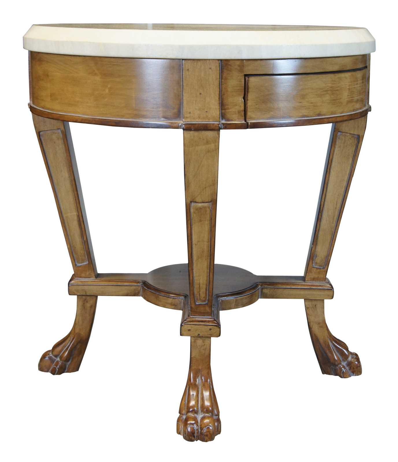 The slender, tapered shape of the Renaissance End Table features a dramatic set of carved neoclassic paws that support graceful legs. The top is crowned by a round travertine slab