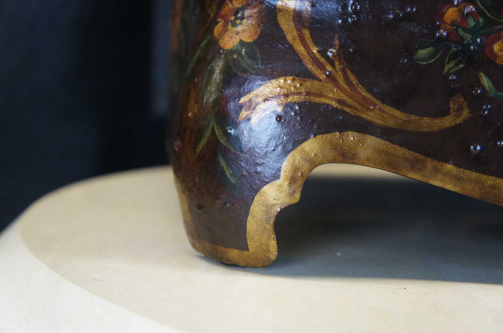 Italian or Baroque Revival chest. Great for decorative use or as a centerpiece or Jewelry Casket. Features a bombe form with hand pianted floral details. Brown with gold trim.