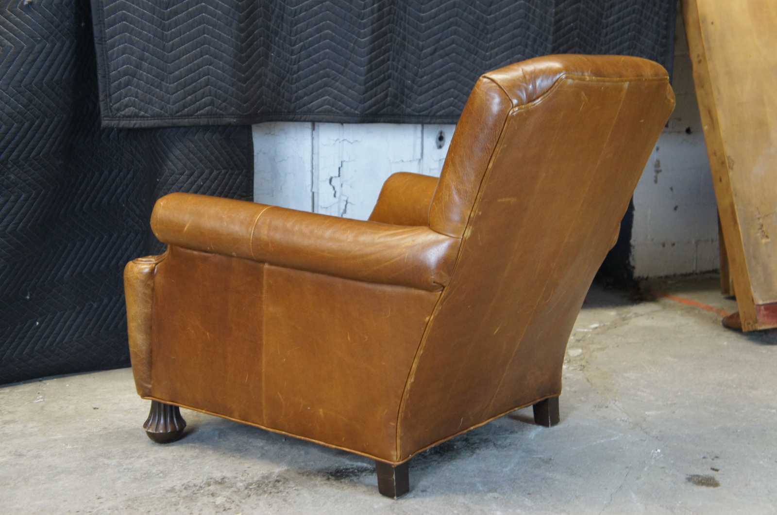 William Alan Inc brown leather club chair, circa 1999 Features a down cushion, rolled arms, tufted seat and ottoman and bun feet.