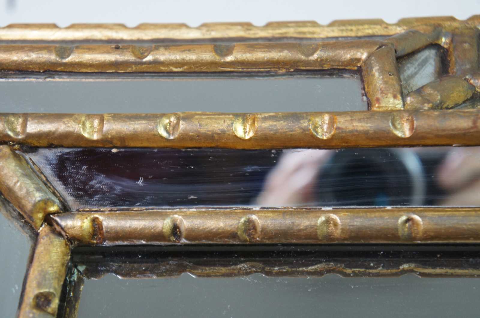Vintage rectangular Venetian giltwood mirror with small beveled mirrored segments and carved bamboo style frame. Made in Italy.