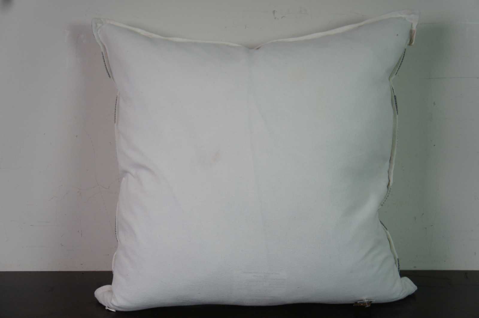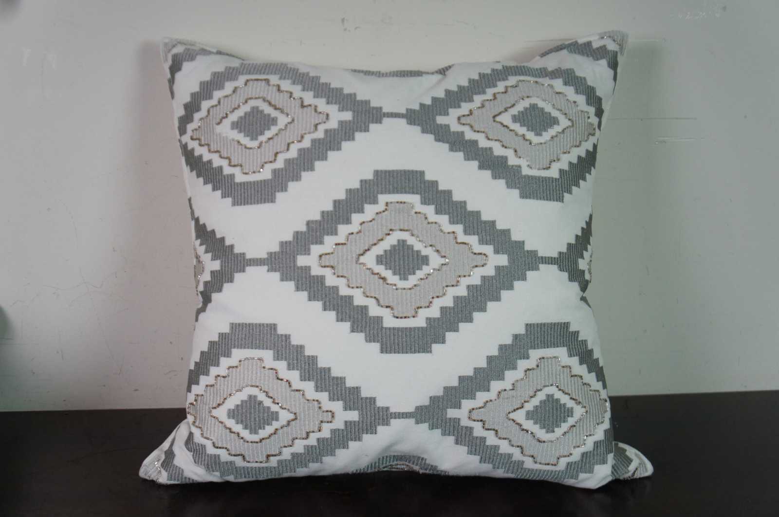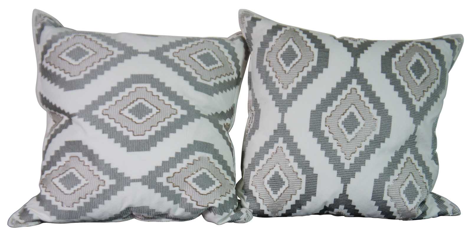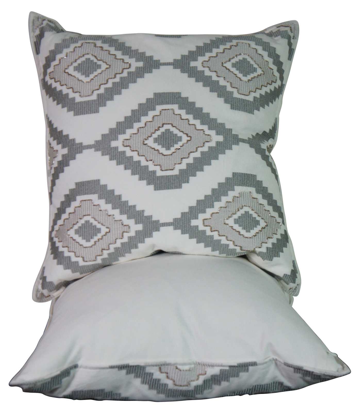 Pair of vintage Arhaus square down filled throw pillows in a Southwest inspired gray and beige embroidered diamond design with beaded accents.