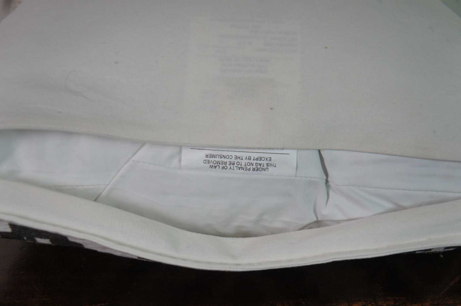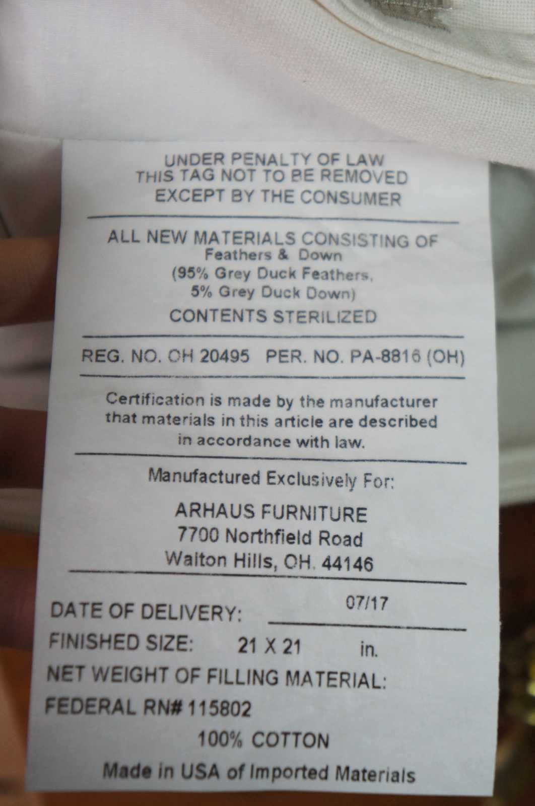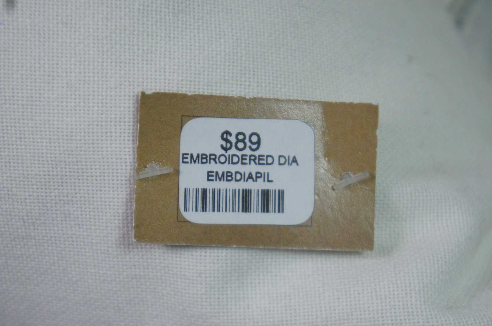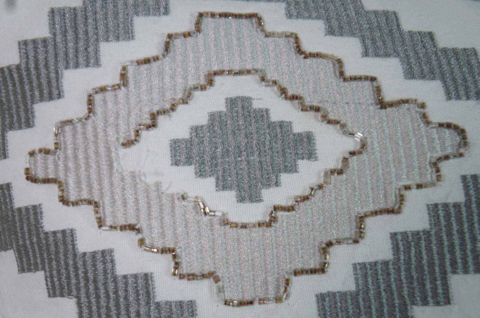 Pair of vintage Arhaus square down filled throw pillows in a Southwest inspired gray and beige embroidered diamond design with beaded accents.