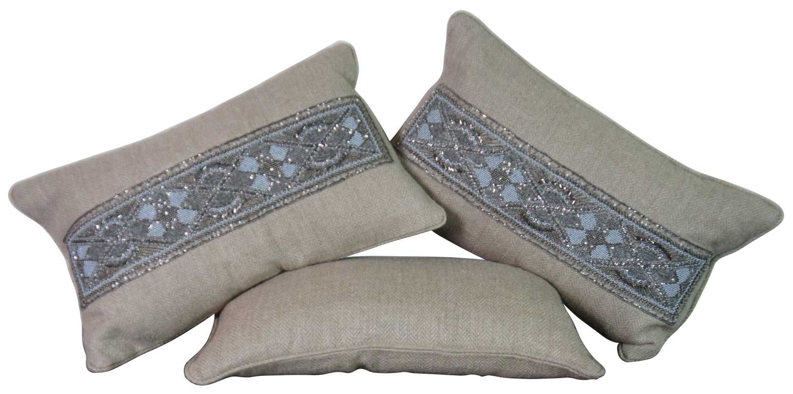 Trio of vintage Arhaus down filled lumbar throw pillows featuring the silver beaded Hathi pattern on a beige herringbone burlap surface.