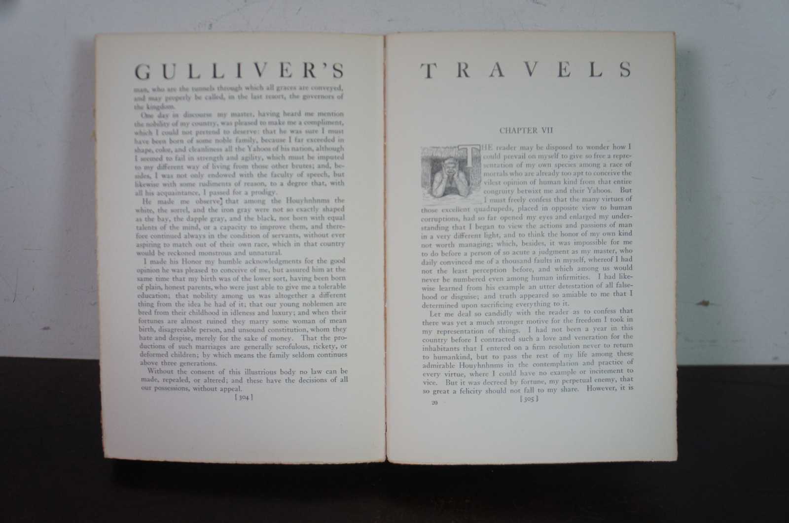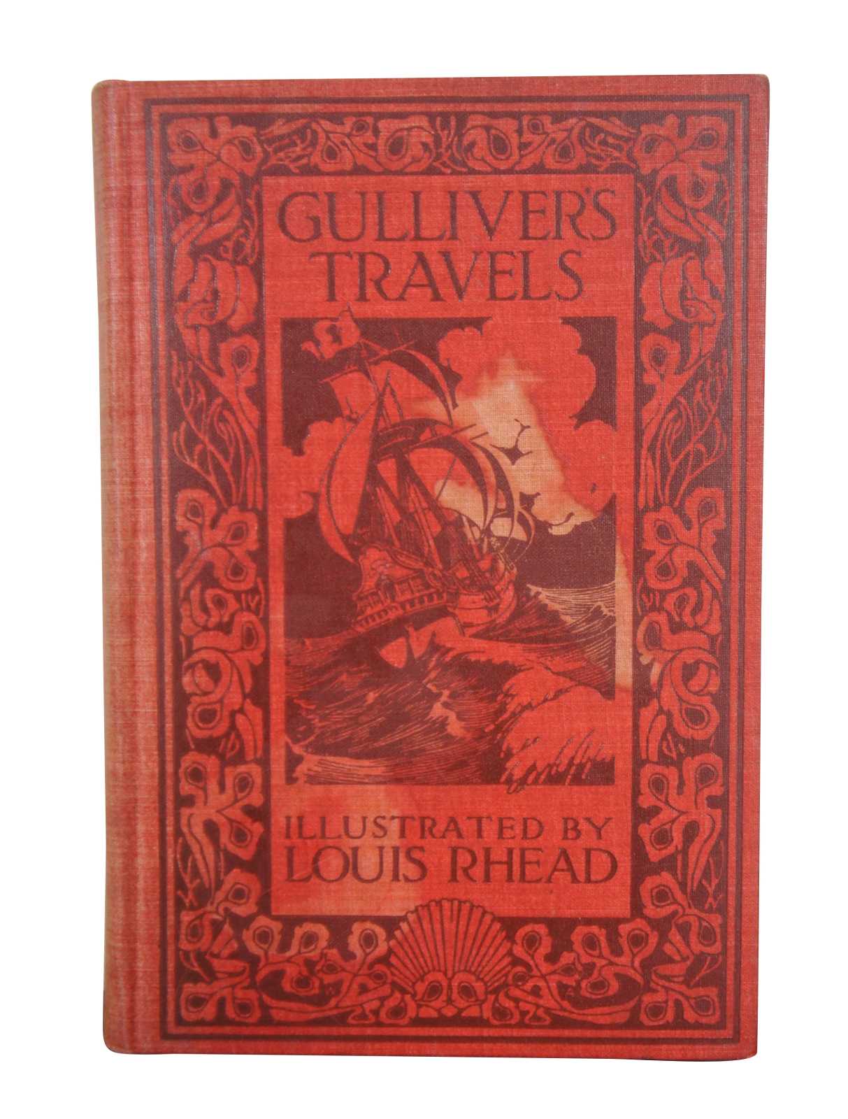 Antique hard cover copy of “Gulliver’s Travels” by Jonathan Swift, with an introduction by W.D. Howells, illustrated by Louis Rhead, produced by Harper & Brothers Publishers, 1913.