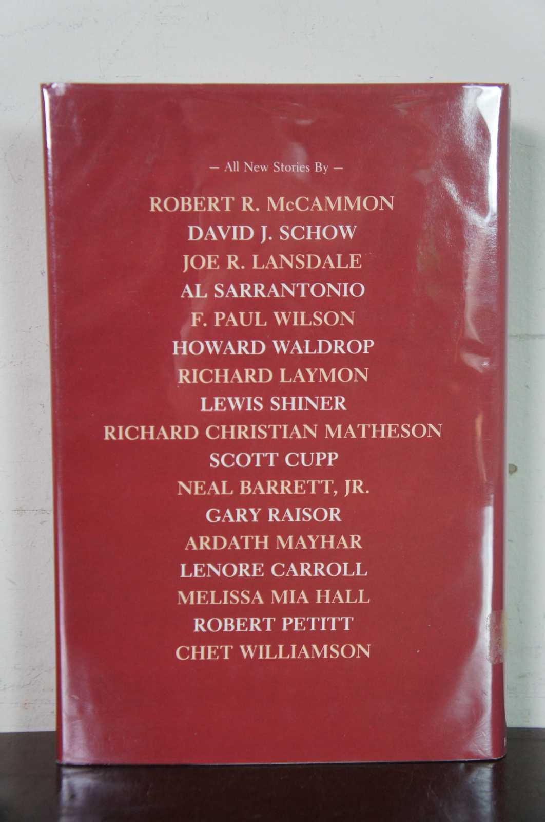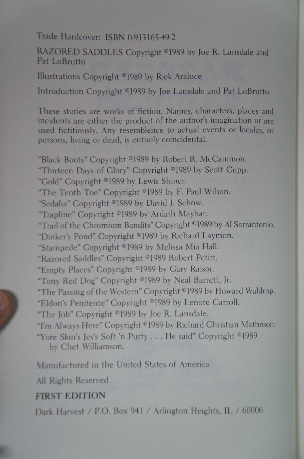 Vintage hard cover deluxe 1st edition copy of “Razored Saddles” edited by Joe R. Lansdale & Pat LoBrutto, illustrated by Rick Araluce, produced by Dark Harvest, 1989. Anthology containing stories by Robert R. McCammon, Joe R. Lansdale, Al Sarrantonio, Richard Laymon, Scott Cupp, Neal Bennett, Jr, Ardath Mayhar, Chet Williamson, F. Paul Wilson, David J. Schow, Howard Waldrop, Lewis Shiner, Richard Christian Matheson, Gary Raisor, Lenore Carroll, Melissa Mia Hall, and Robert Petitt. Numbered 531 of 600 and autographed by Richard Laymon, Robert R. McCammon, Al Sarrantonio, Chet Williamson, Richard Matheson(?), Ardath Mayhar, and Patrick LoBrutto.