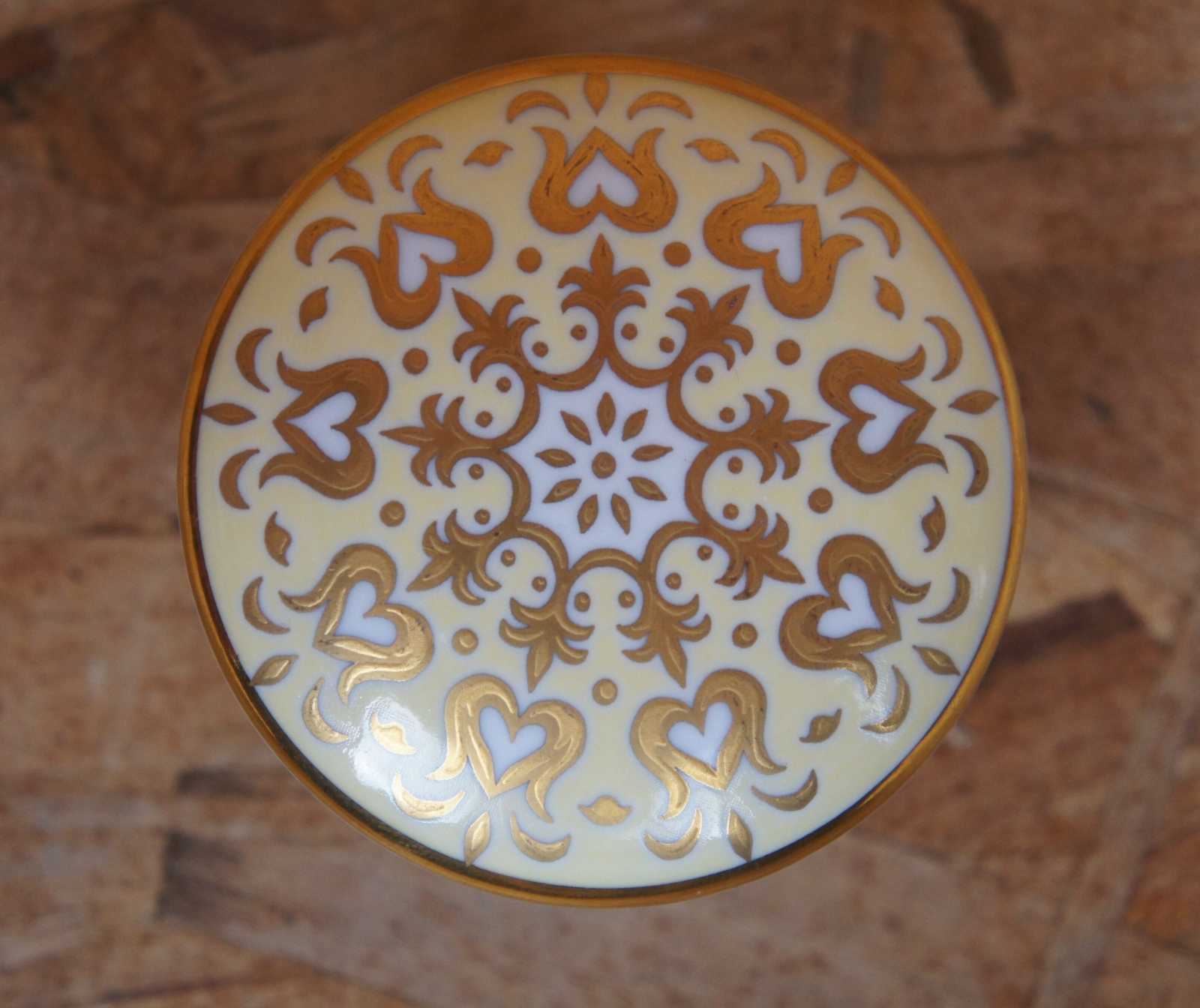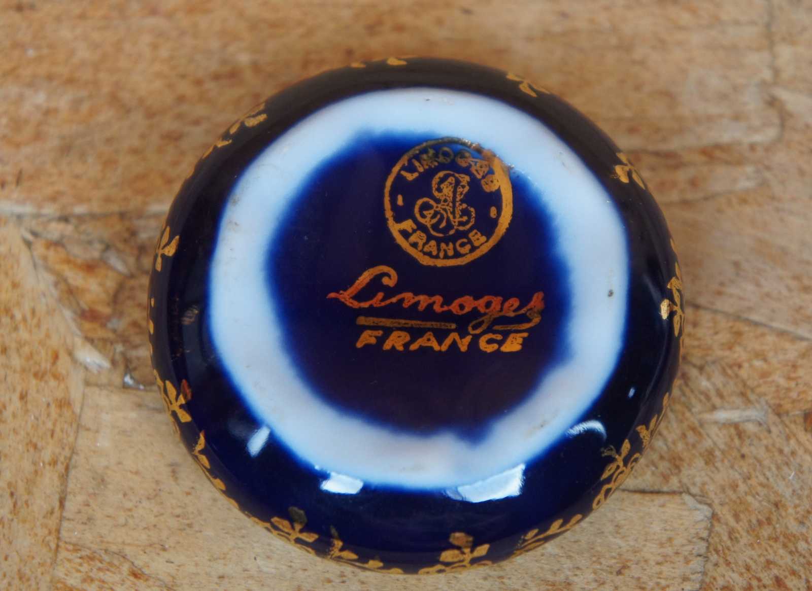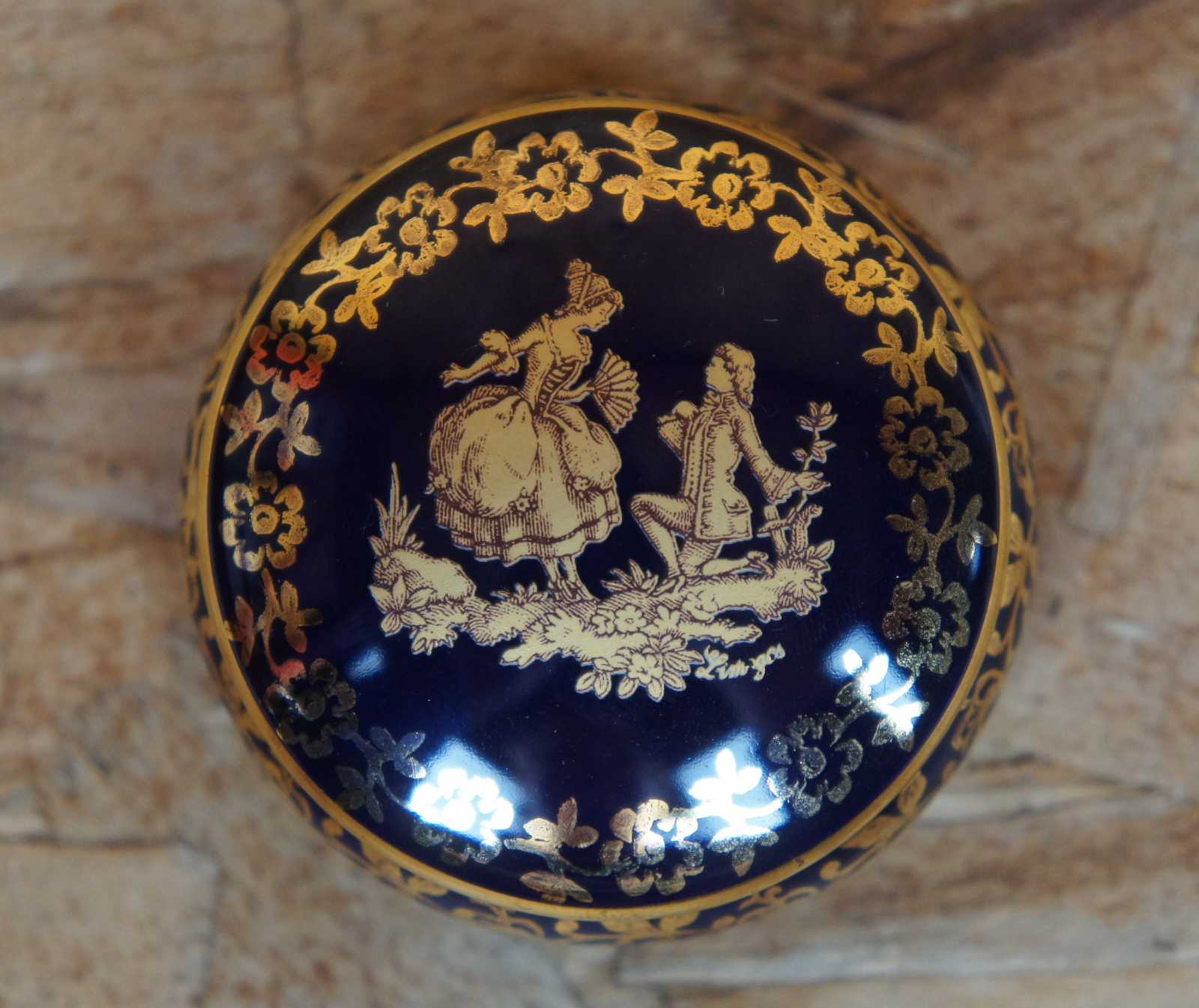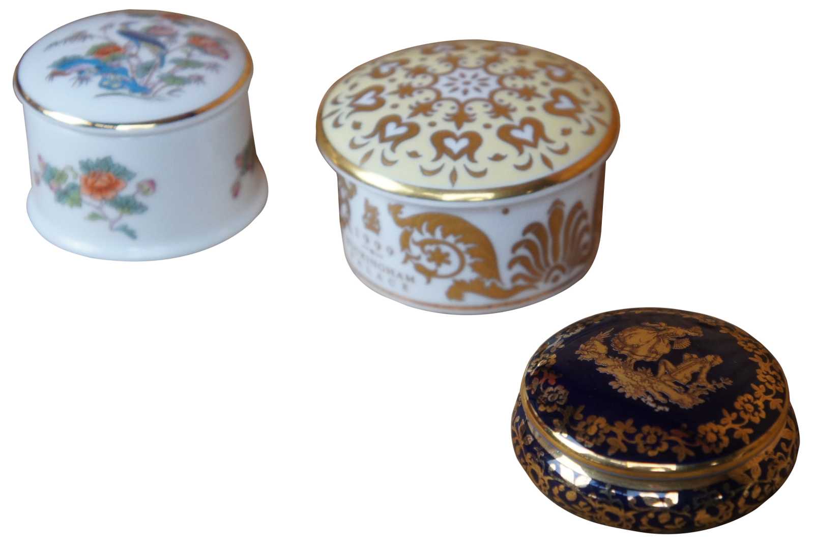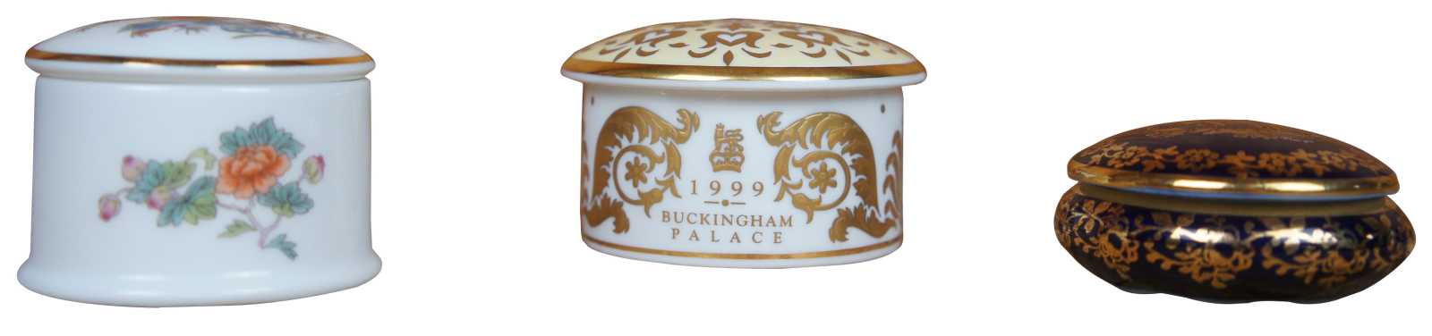 Three lidded limoge trinket boxes. Wedgwood Kutani Crane floral peacock / bird, England. Royal Collection Buckingham Palace 1999, English. Limoges 22k gold cobalt porcelain Courting Couple, France.