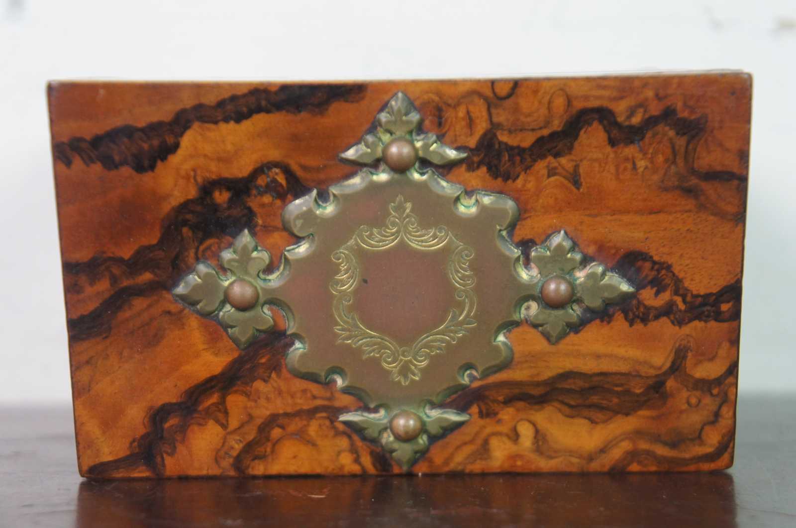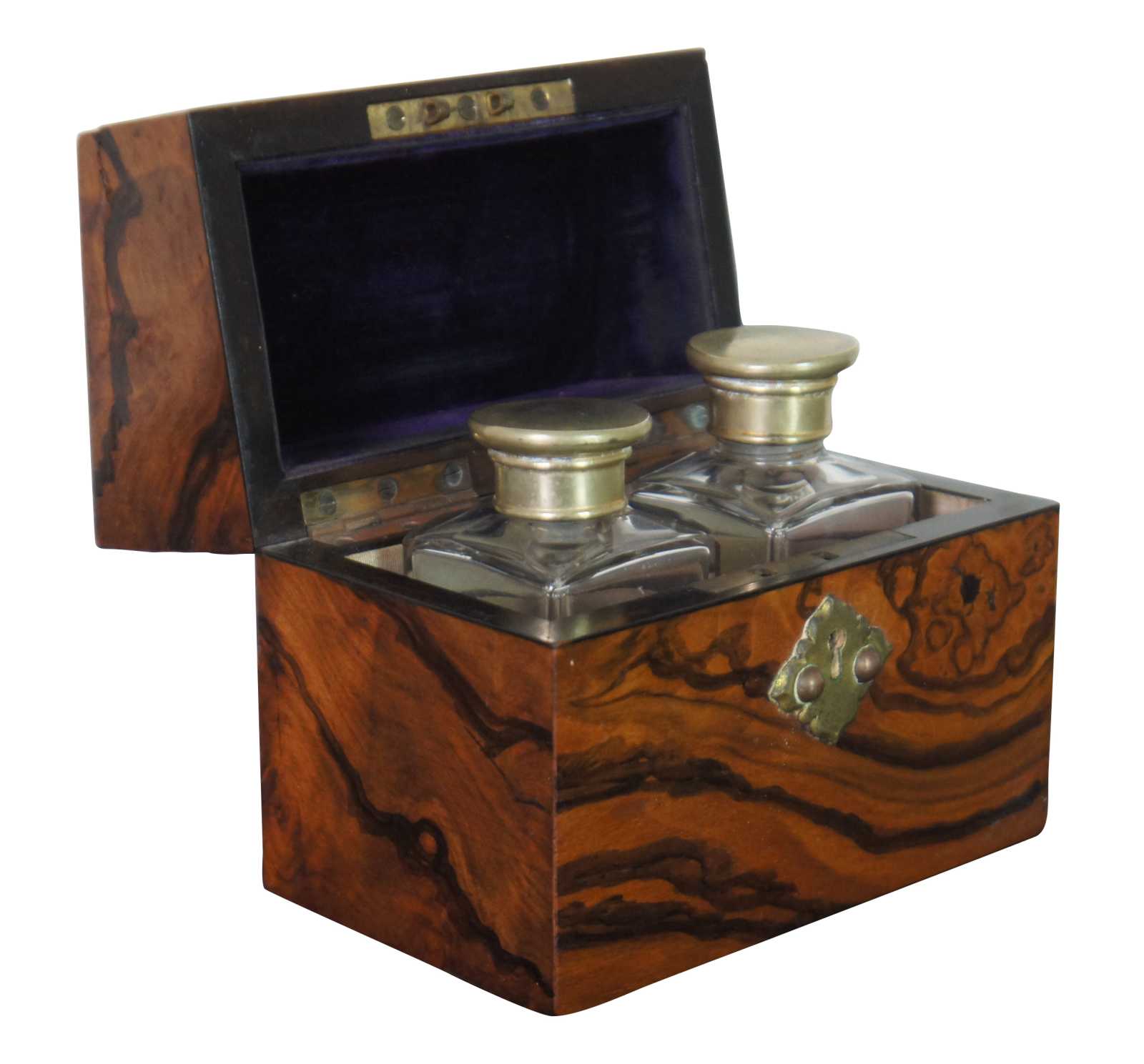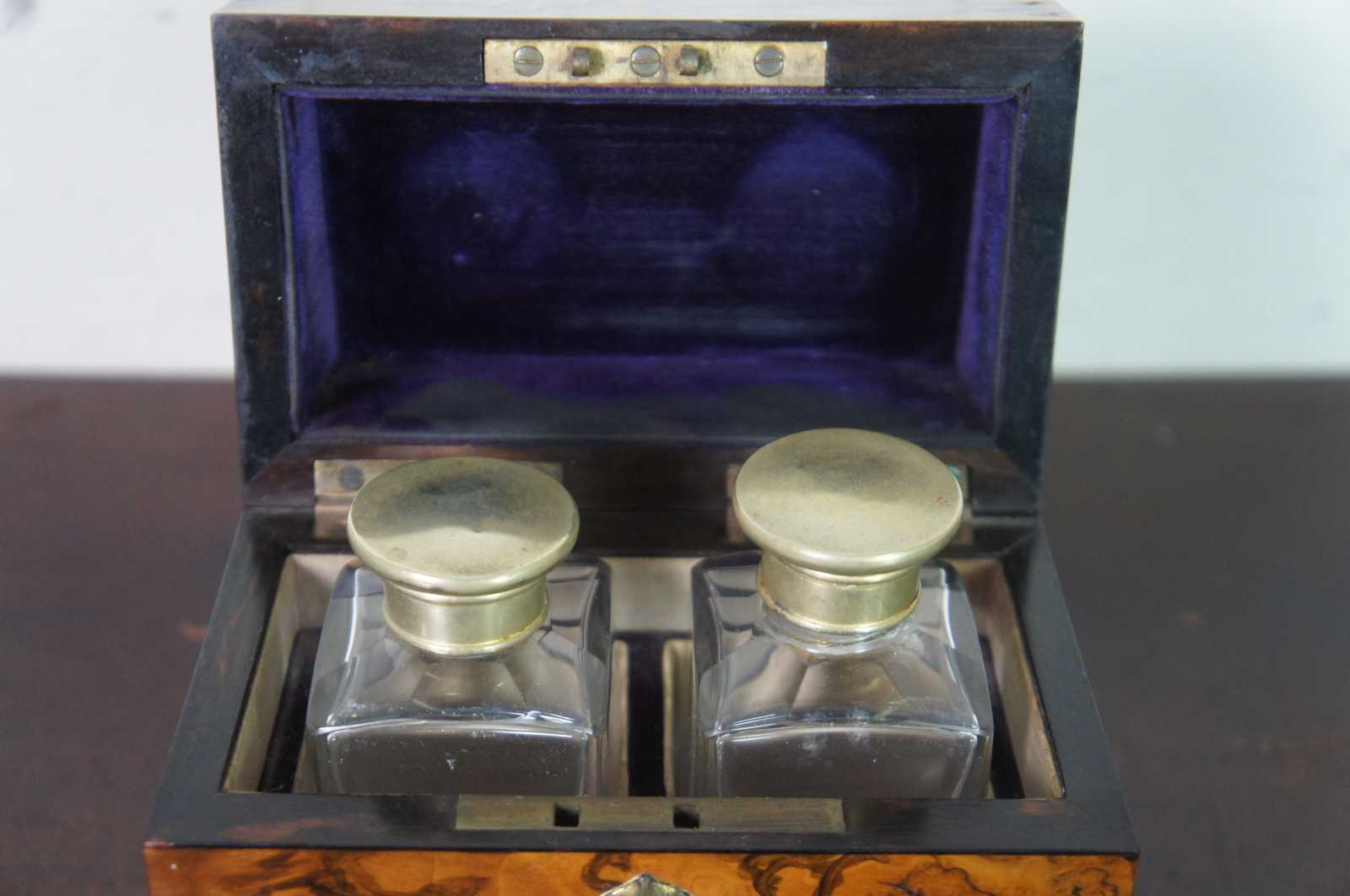 Antique 19th century burl walnut wooden box with decorative brass plaque on the lid, containing two glass or crystal perfume bottles with brass caps.