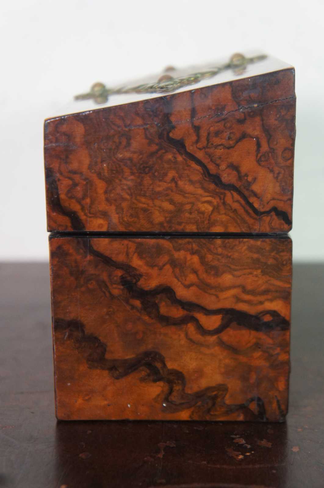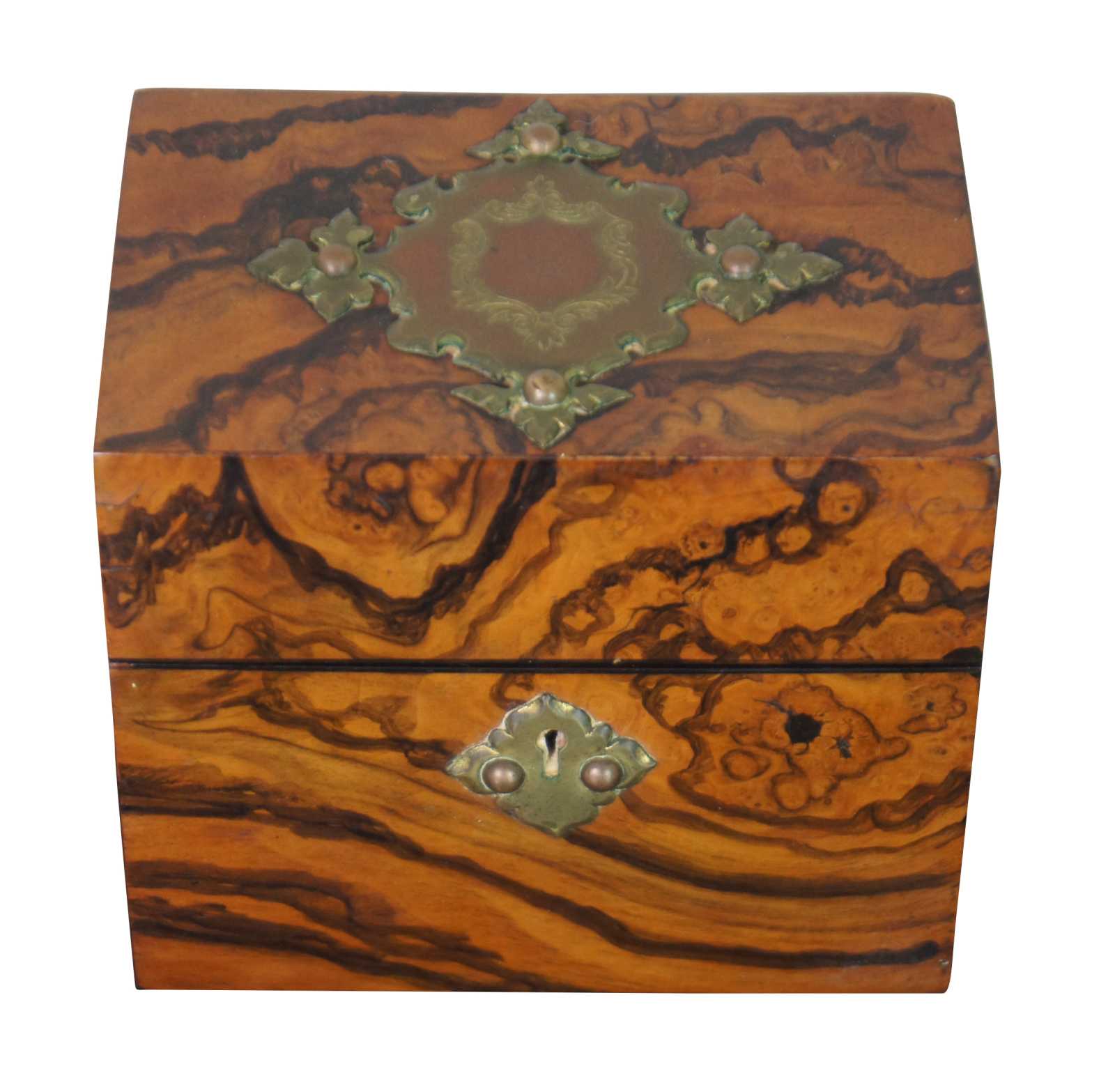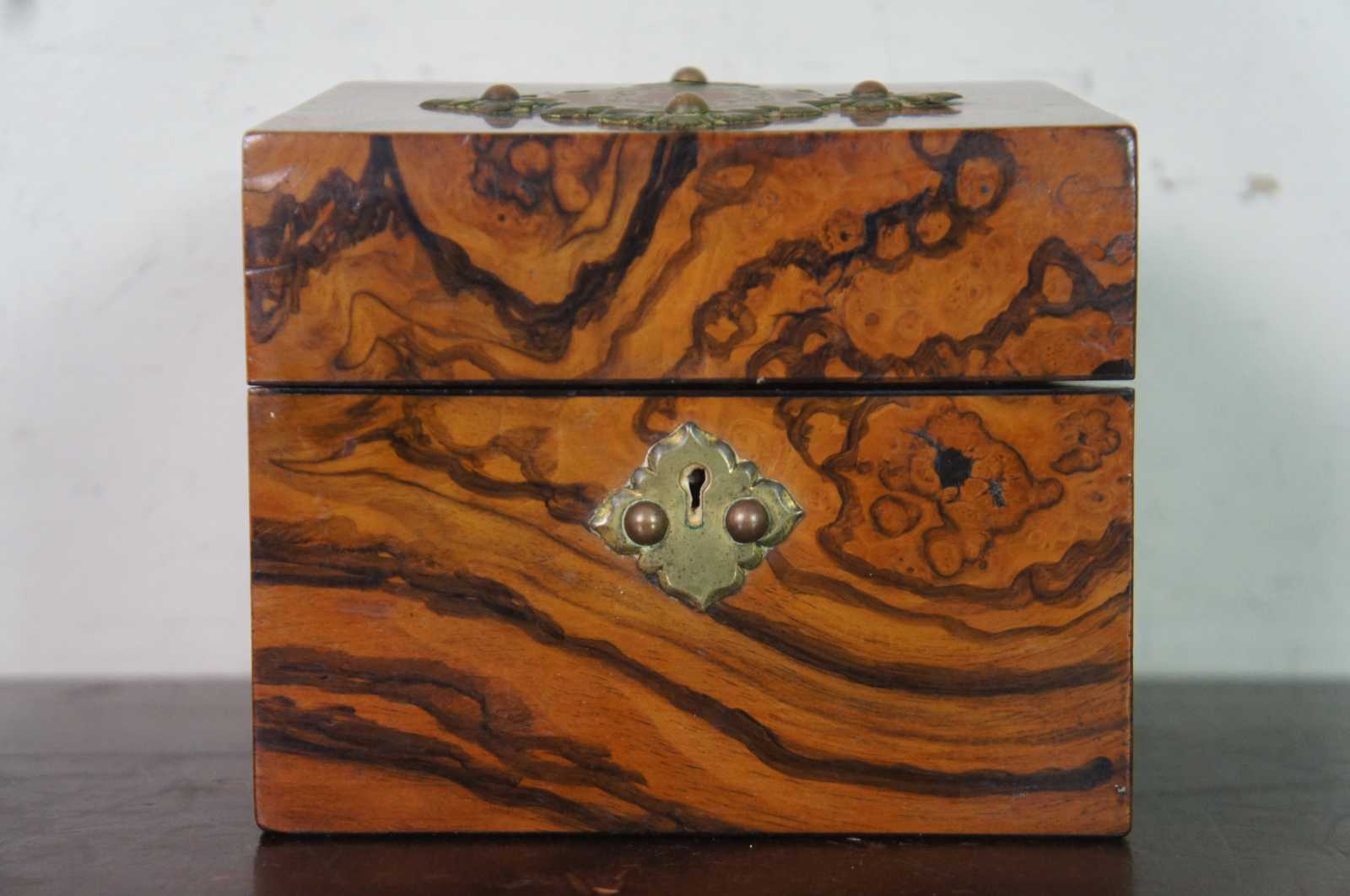 Antique 19th century burl walnut wooden box with decorative brass plaque on the lid, containing two glass or crystal perfume bottles with brass caps.