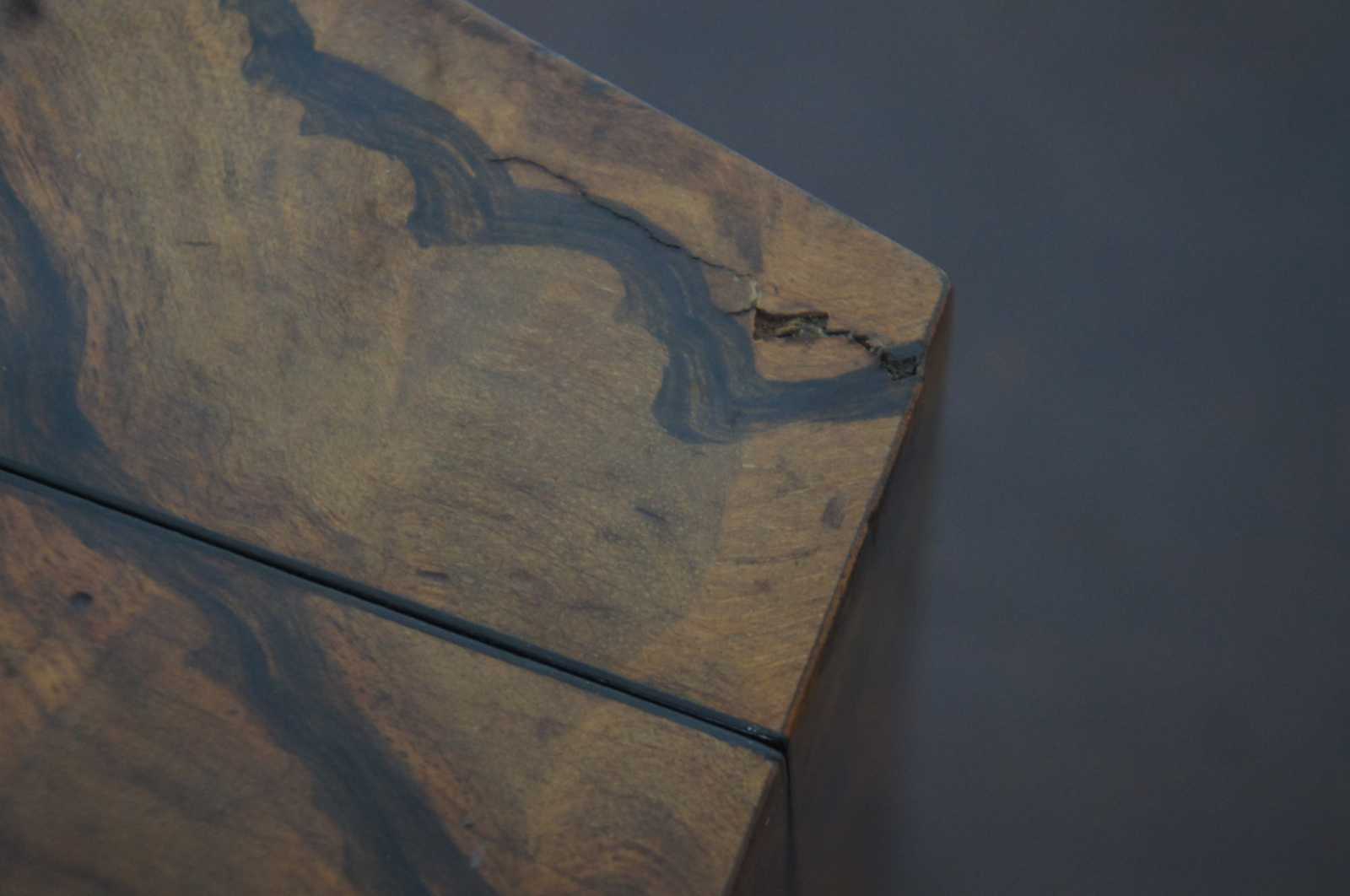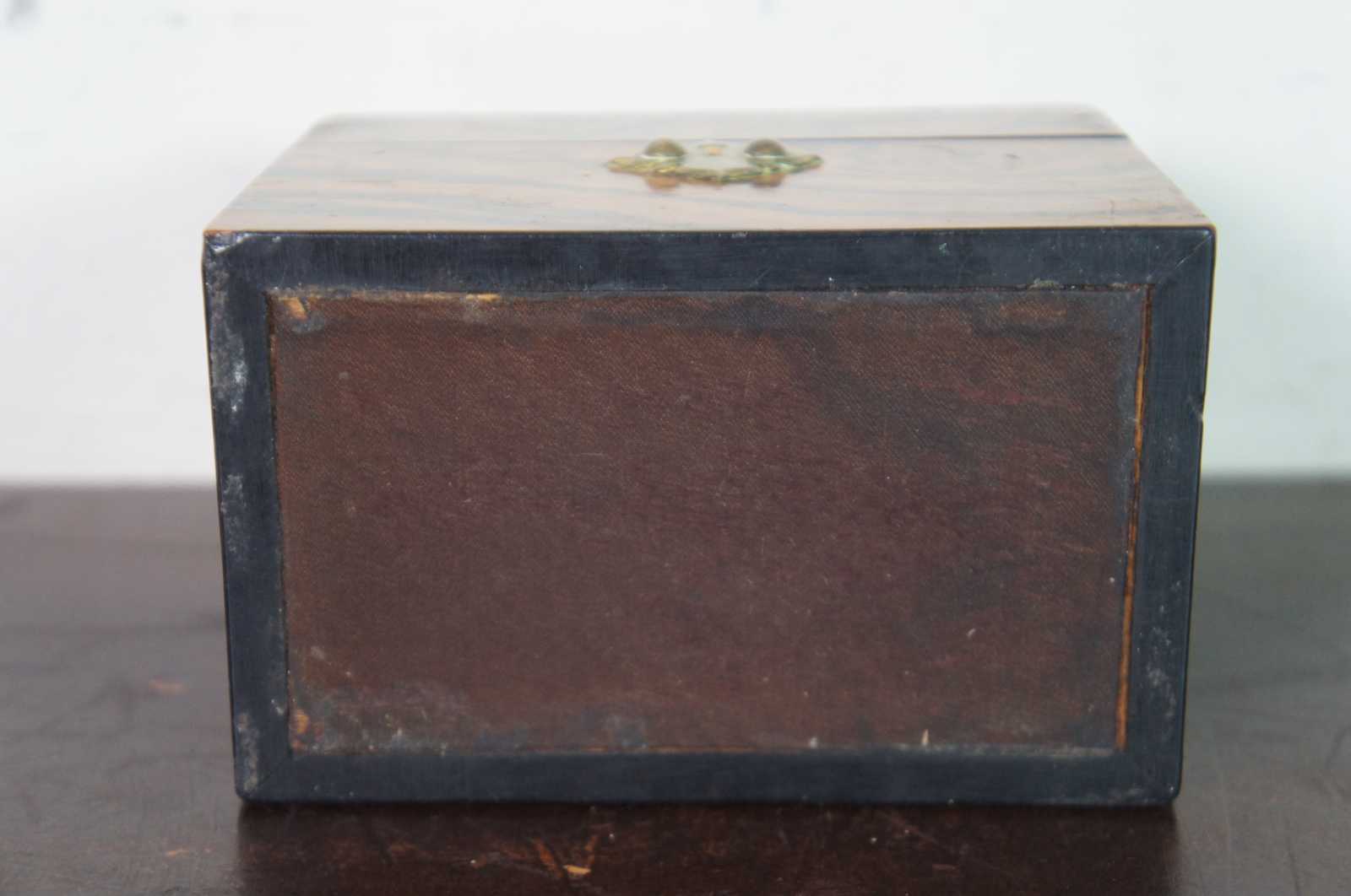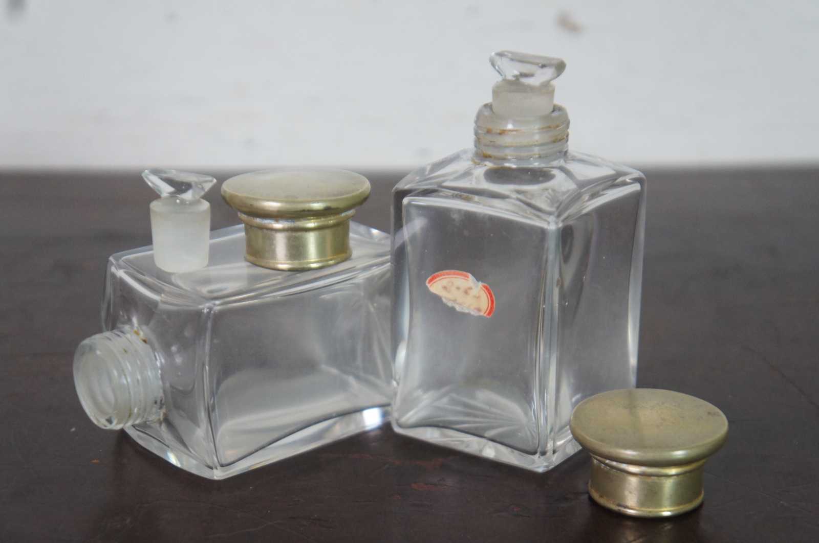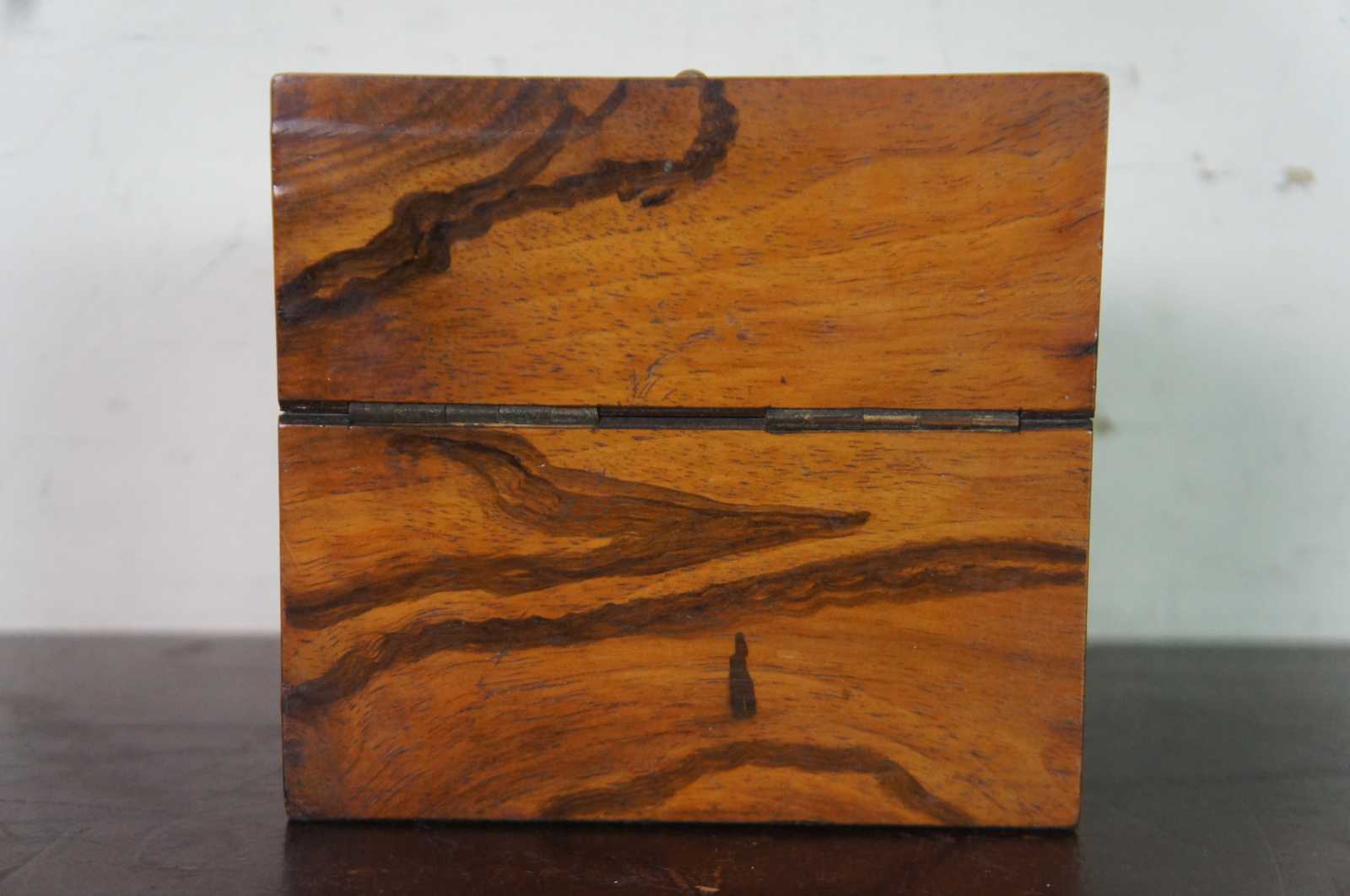 Good Antique Condition - Couple of cracks to veneer; some wear/light stains to interior; stoppers got switched at some point and one is stuck.
