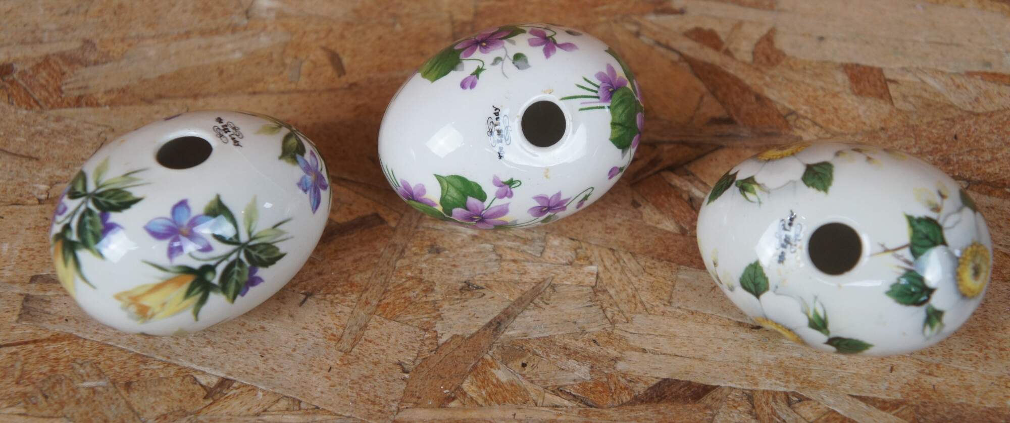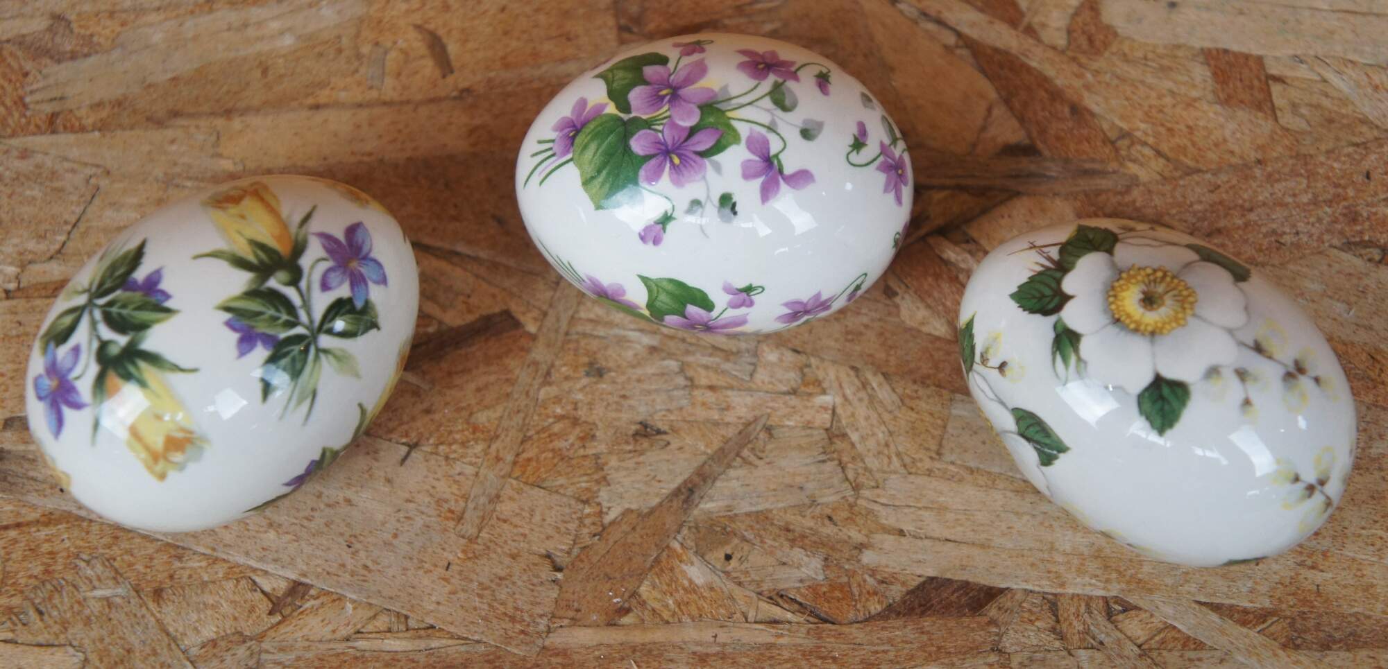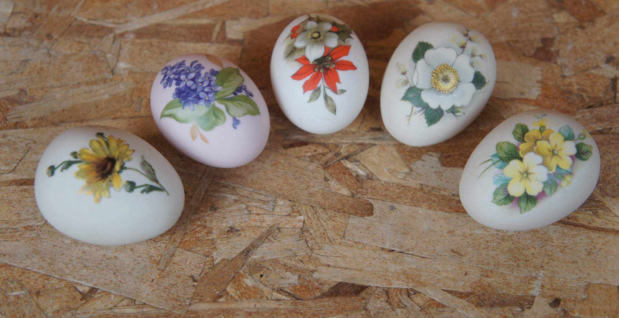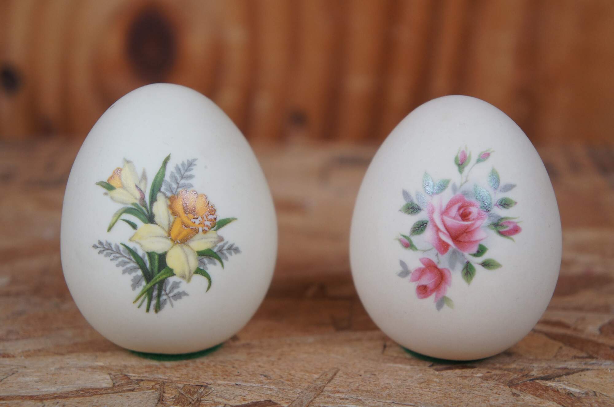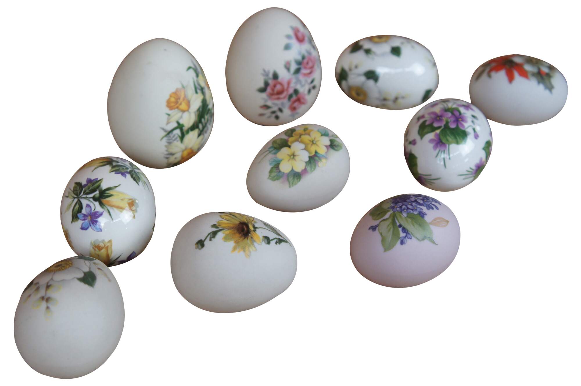 This lot of 10 decorative ceramic eggs feature a variety of floral designs, including buttercups, daisies, hyacinths and roses.