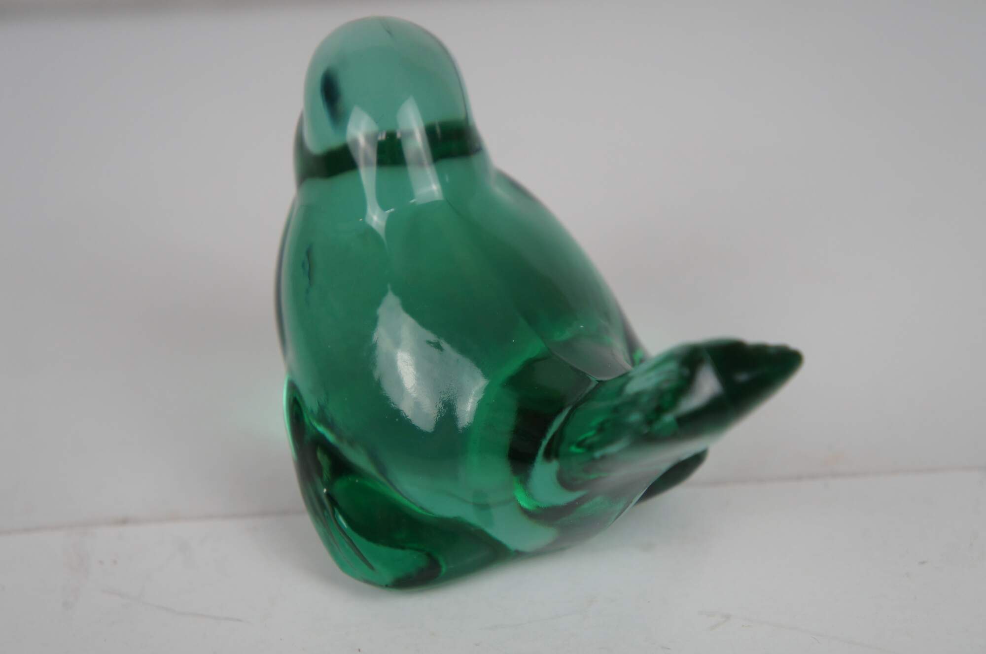 Delicate songbird made of green glass by Fenton Art Glass Company.