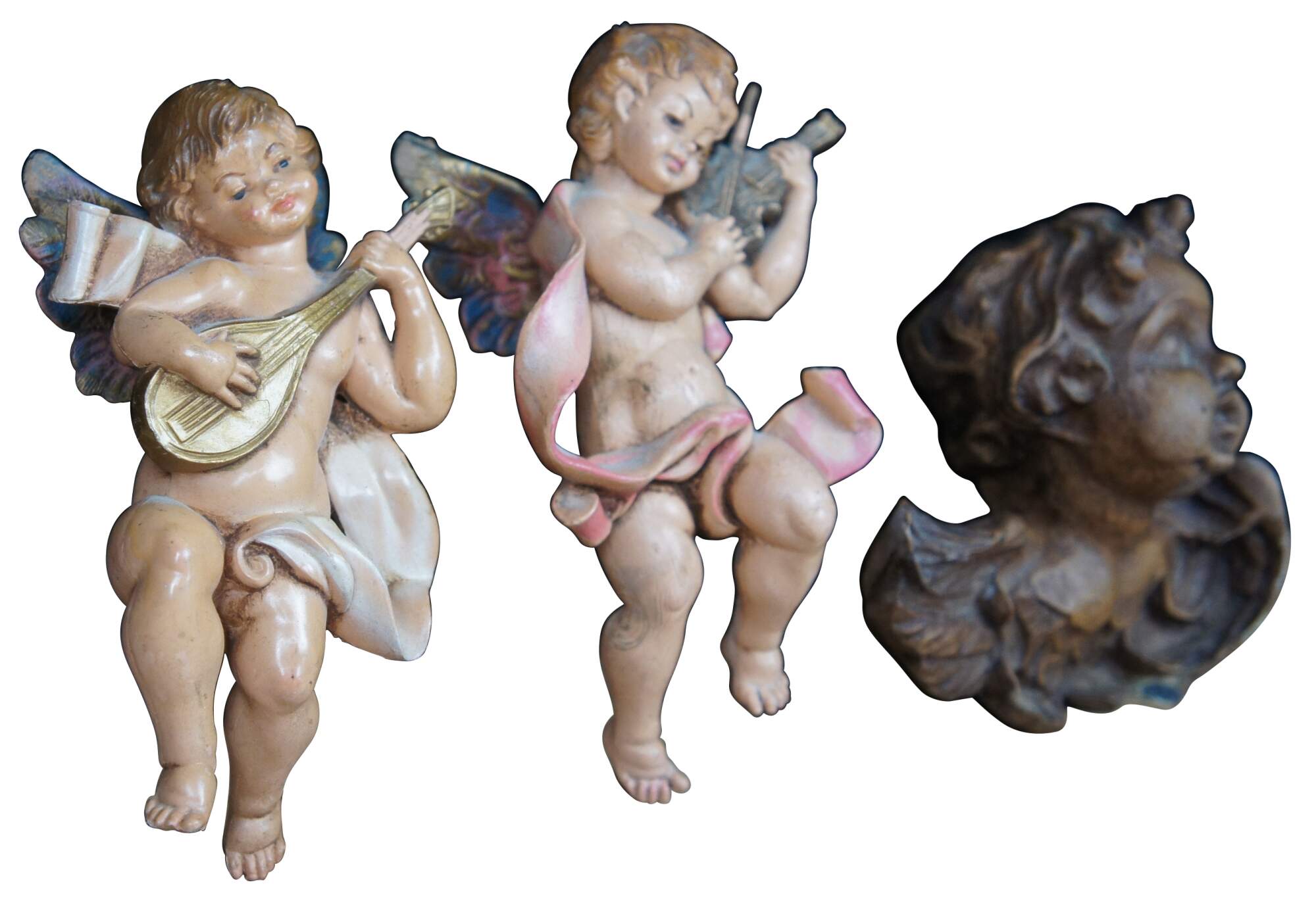 A trio of wall hanging cherubs, two stamped ‘Italy’, done in an Italian style, with delicate details.