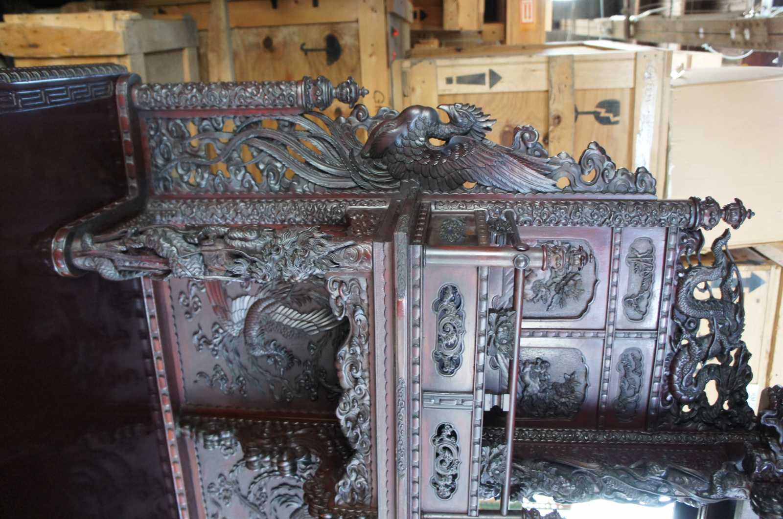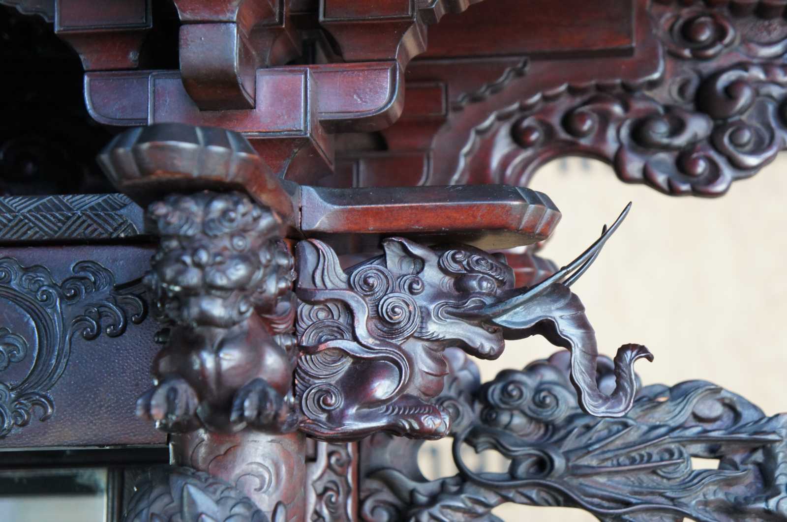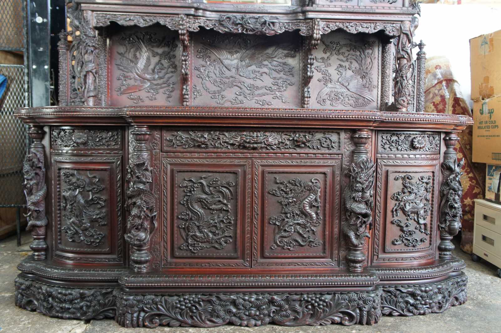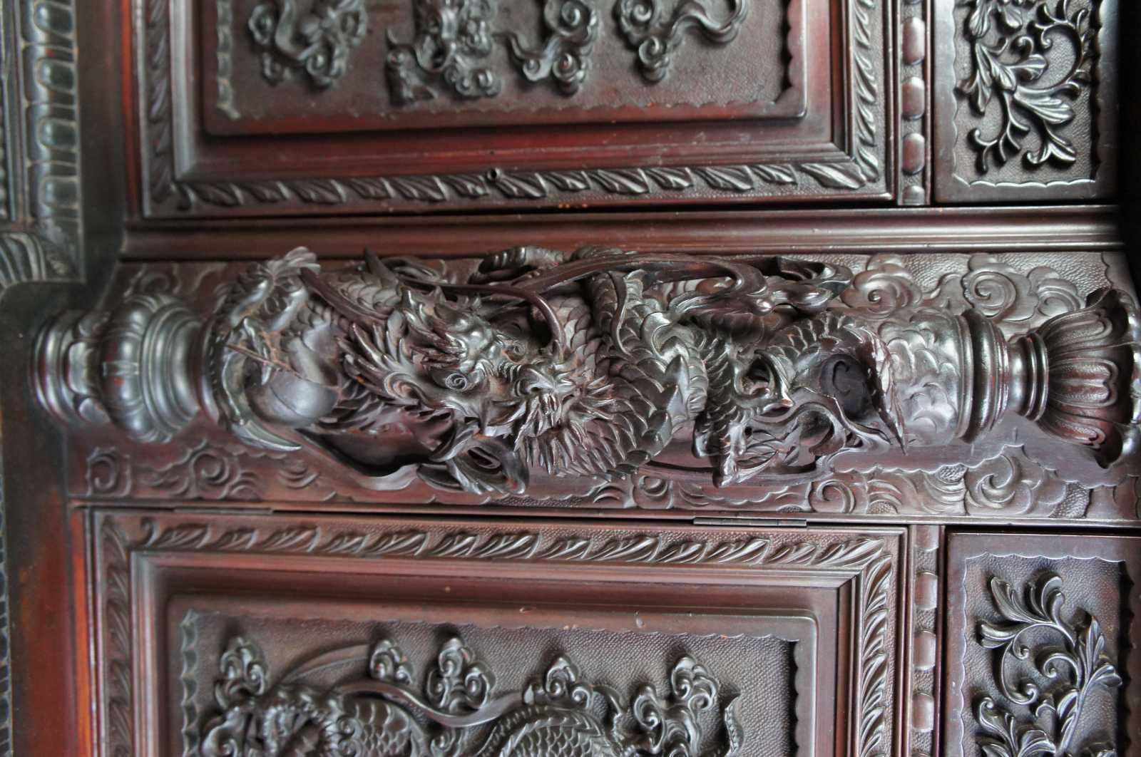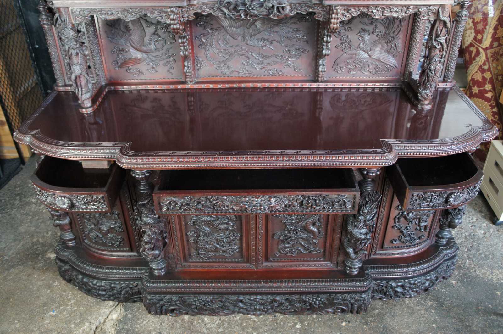Important 19th C. Japanese Meiji Period ornately carved extreme high relief, credenza or bar back. Meticulously designed with one of a kind tooling. A breakfront form with three drawers over lower cabinets, topped by a hutch with shelves and central mirror. Features a dragon or serpent theme, phoenix's, elephants, foo dogs and pierced foliate placed throughout. Amongst the animals is the Imperial (Mons) seal of Japan or Chrysanthemum, emblazoned along drawer handles and within scenes, Charismatic 3-D carvings ordain all surfaces with robust columns at the forefront. Aprons are accented by beading, gadrooning and Japanese Greek key. The pagoda form crown is topped by an intriguing dragon looking down over a chrysanthemum medallion while holding the crown of the cabinet in its mouth. Flanked by two spectacular guardian lions. A masterpiece that would have been made for and limited to a member of the Royal Family/ Imperial House of Japan.