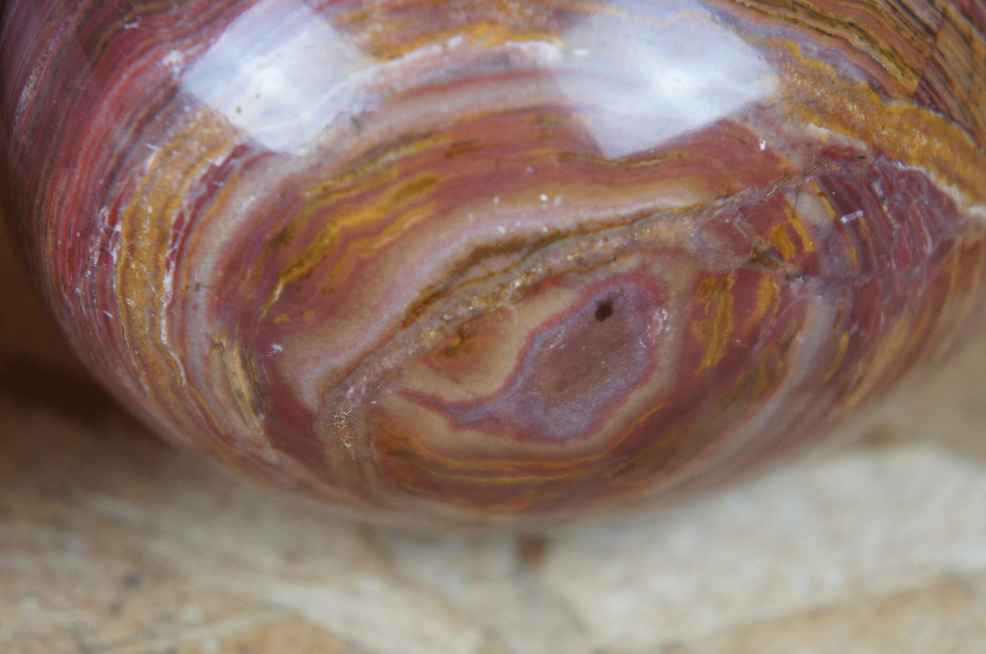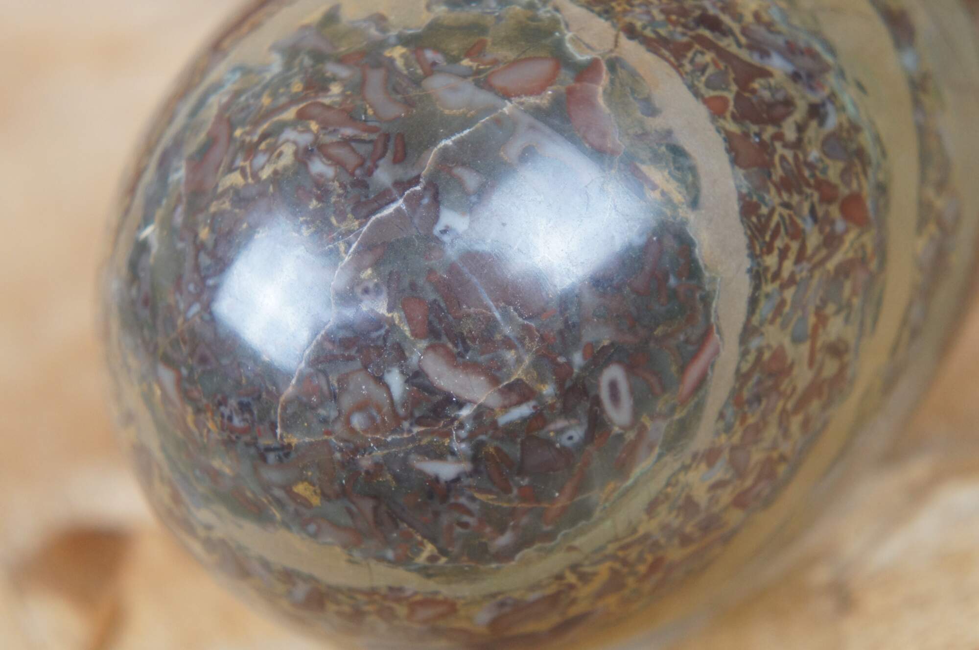 7 large eggs of assorted sizes and materials with wooden and brass stands.