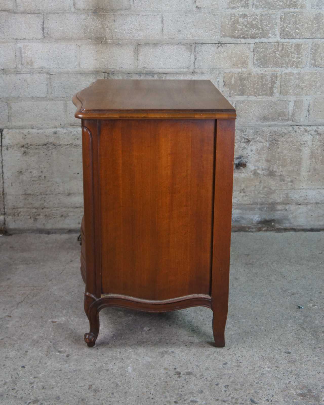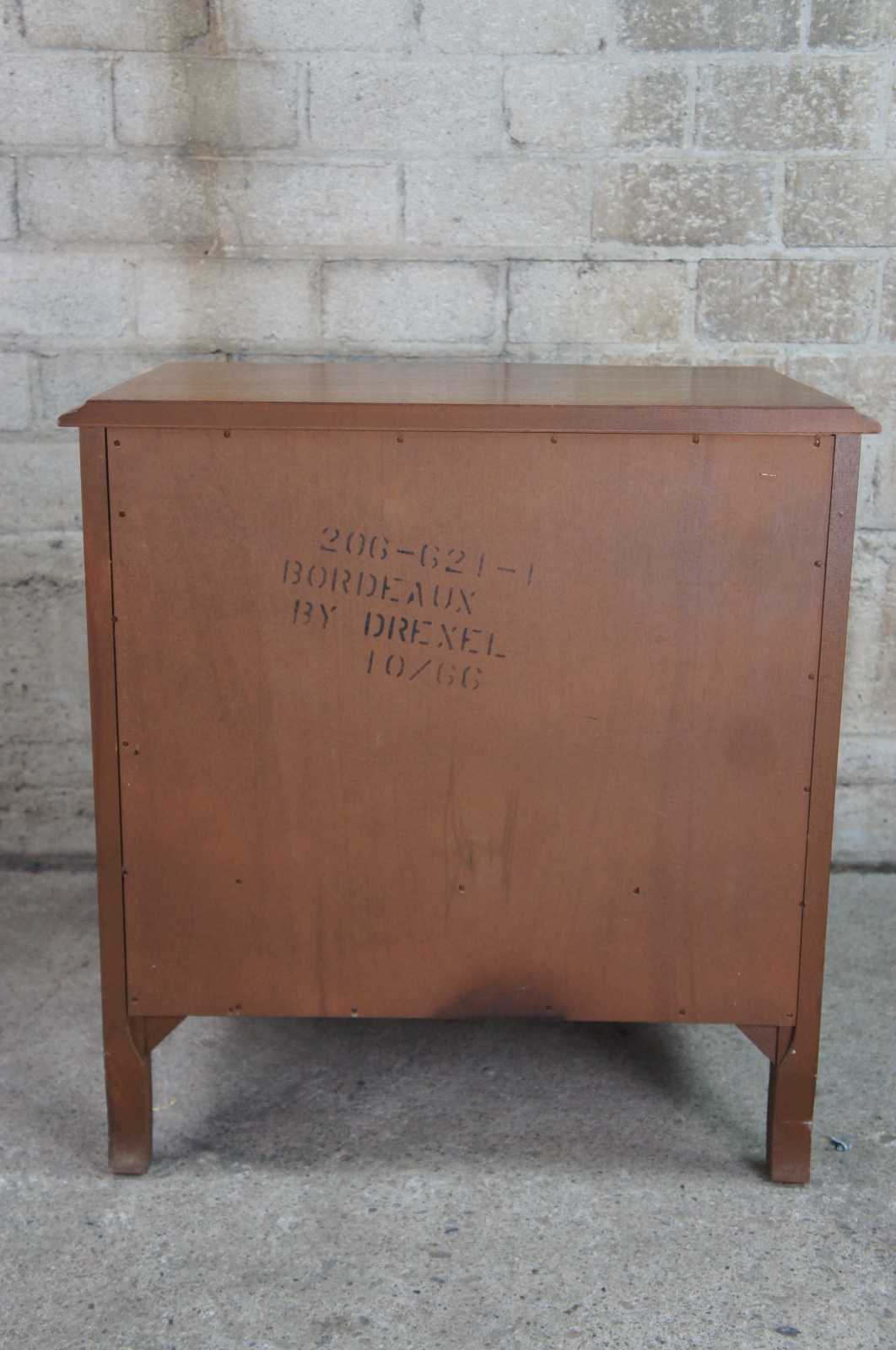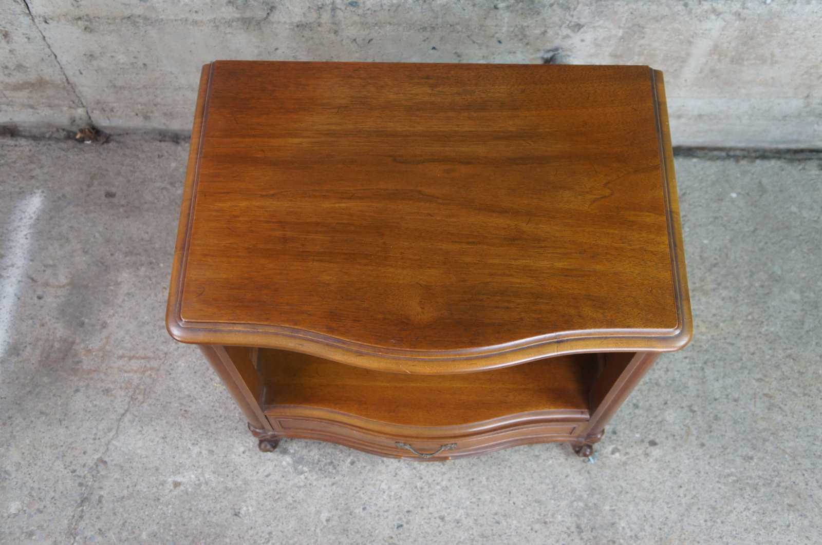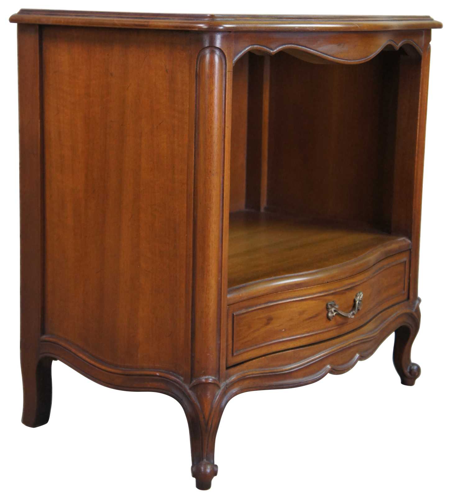 Mid century Drexel Bordeaux nightstands or side accent tables featuring serpentine form with one drawer and open cubby over cabriole legs. Circa 1966. 1728.
