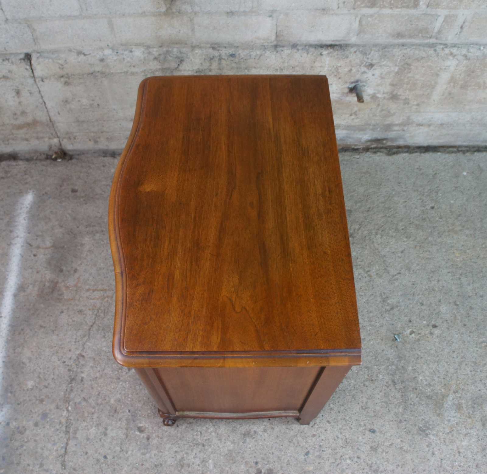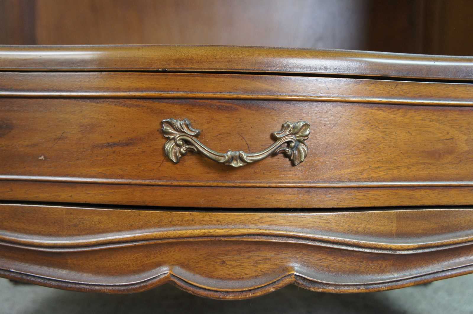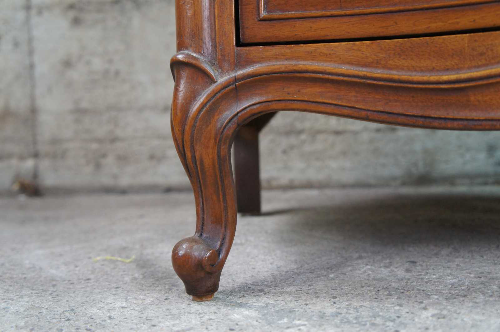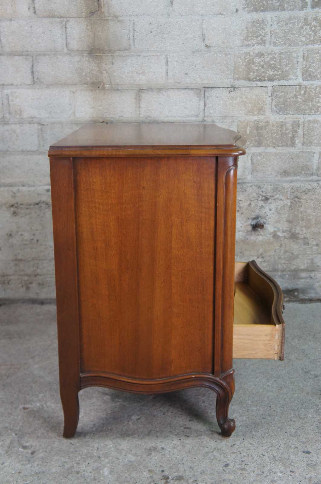 Mid century Drexel Bordeaux nightstands or side accent tables featuring serpentine form with one drawer and open cubby over cabriole legs. Circa 1966. 1728.