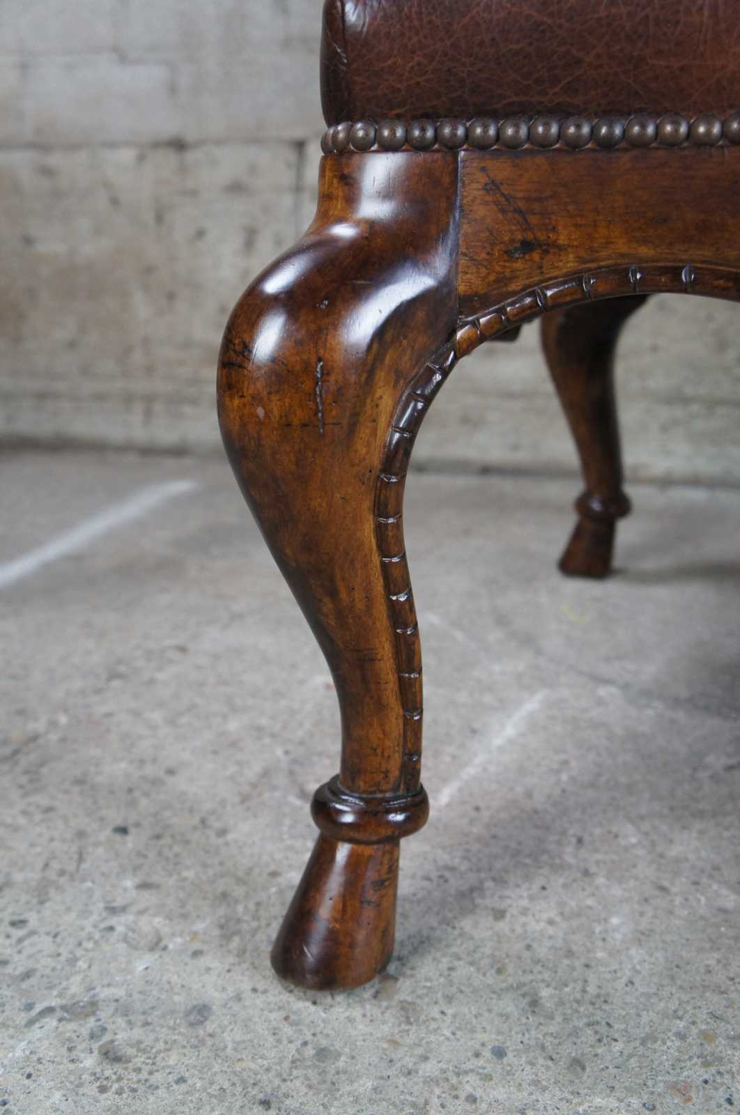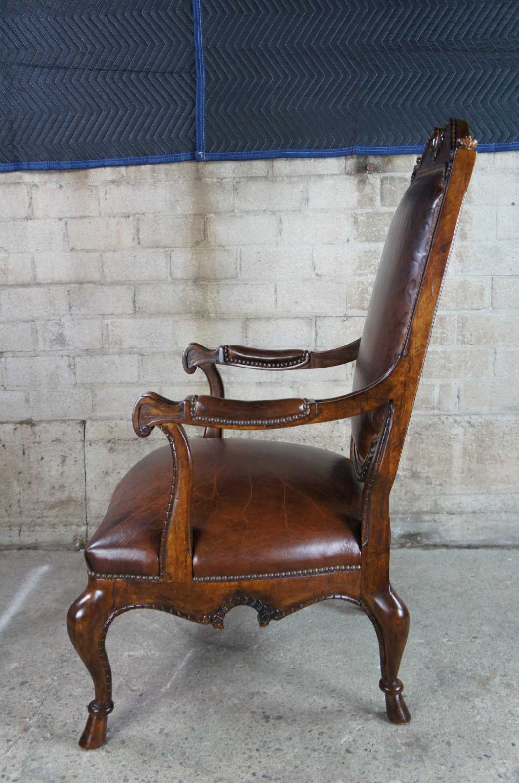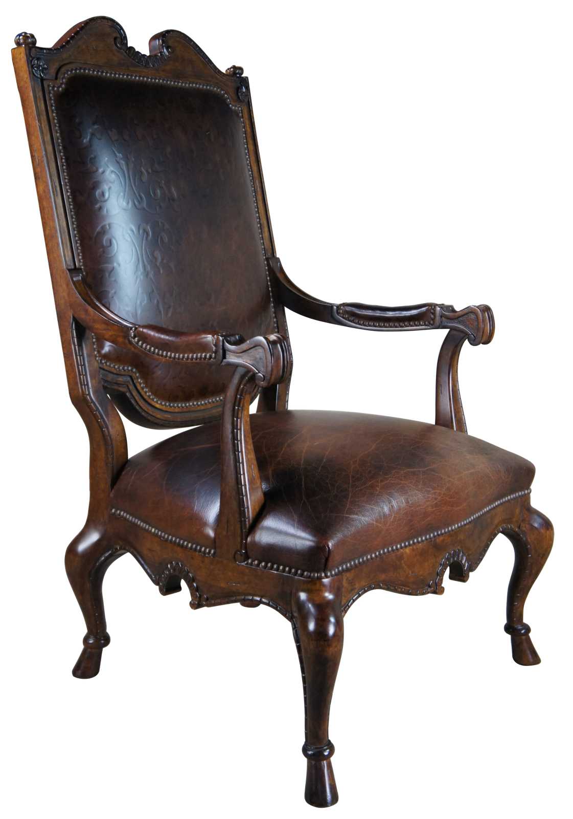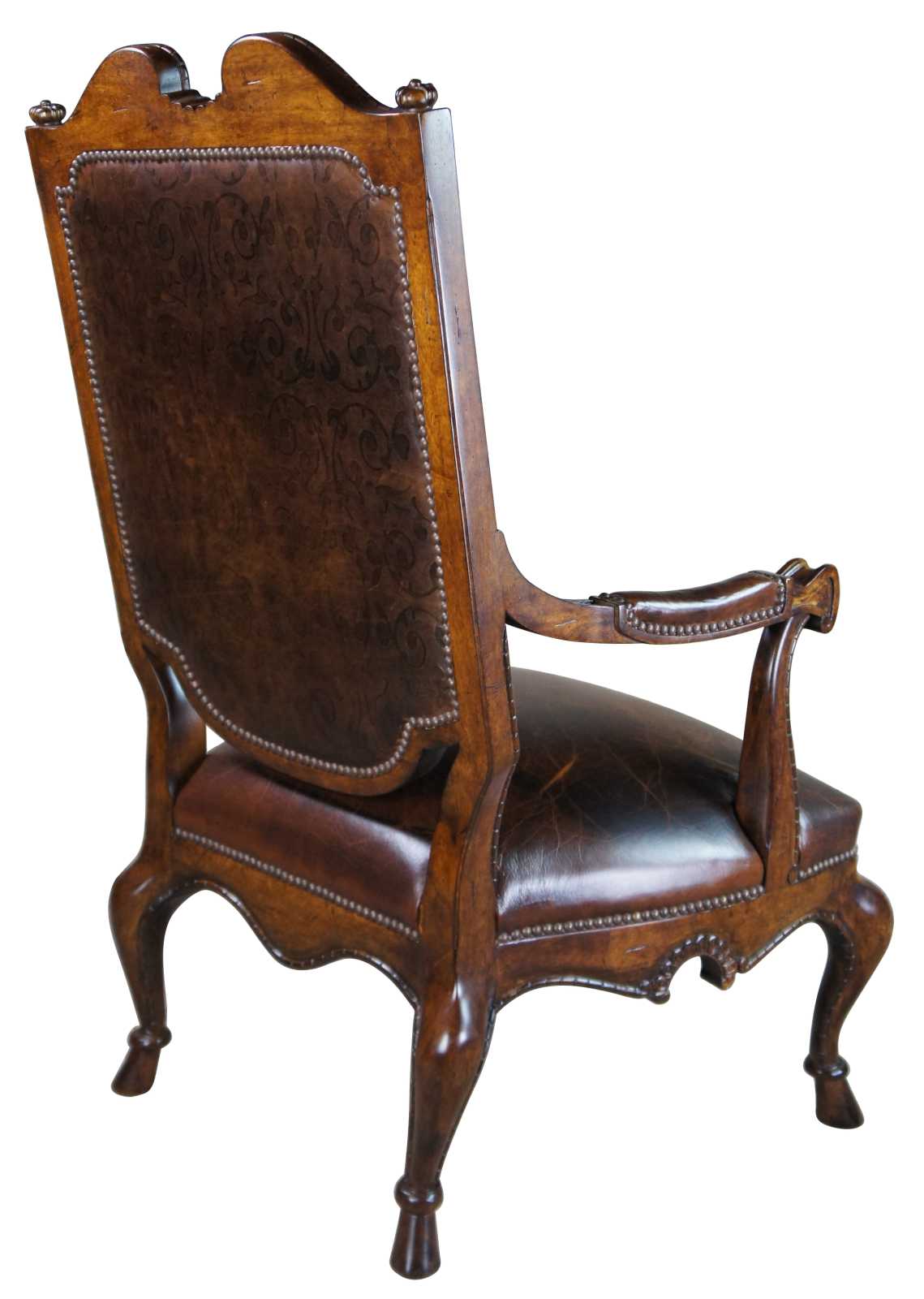 Century Furniture carved occasional armchair, circa 1990s Inspired by French Country styling with a high back and oversized form. Made from walnut with tooled brown leather, nailhead trim, cabrioe legs and hooved / hoof feat. The highback includes an open pediment, french carved medallions and crown shaped finials. Great for use as a desk chair or a statement piece. #3217