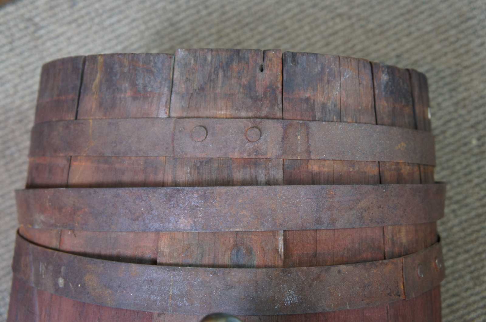 Antique oak iron banded beer or whiskey barrel keg with crank spigot. A charming design element for any bar or home.