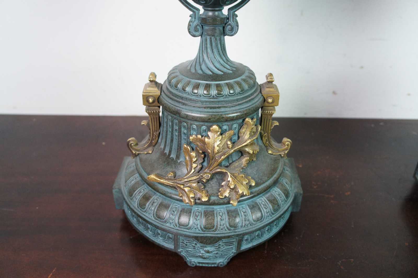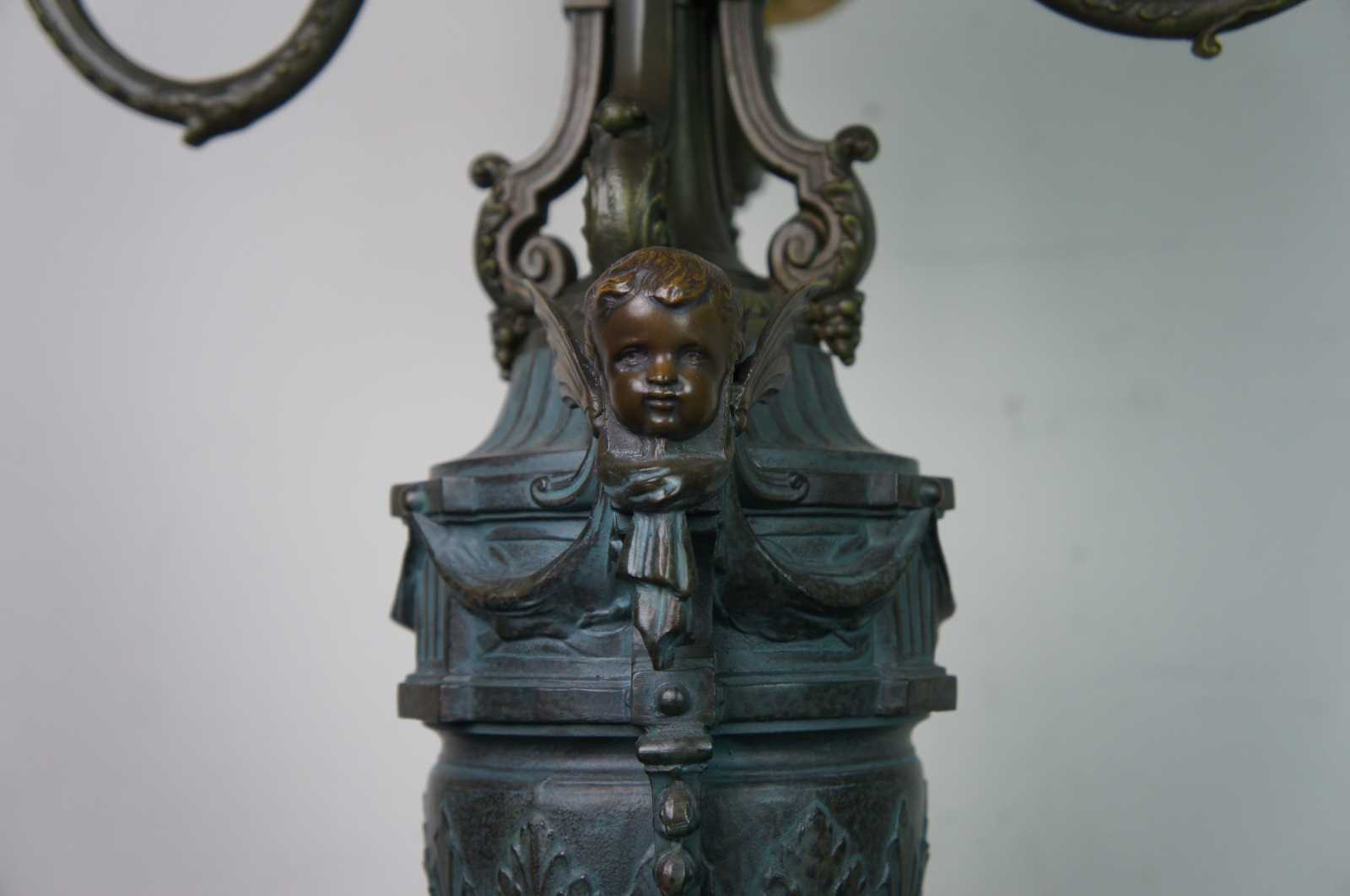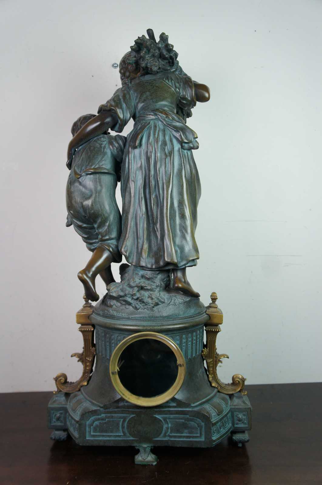 Monumental Antique French Art Nouveau Auguste Moreau garniture clock set. Made of bronze with gilt accents featuring a peasant woman and child carrying a shieth of wheat flanked by large candelabra urns featuring neoclassical stying with cherub / putti faces.