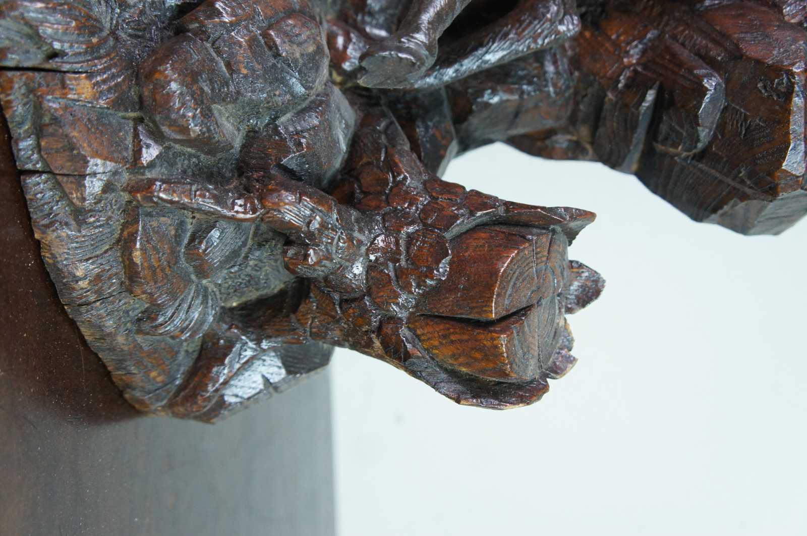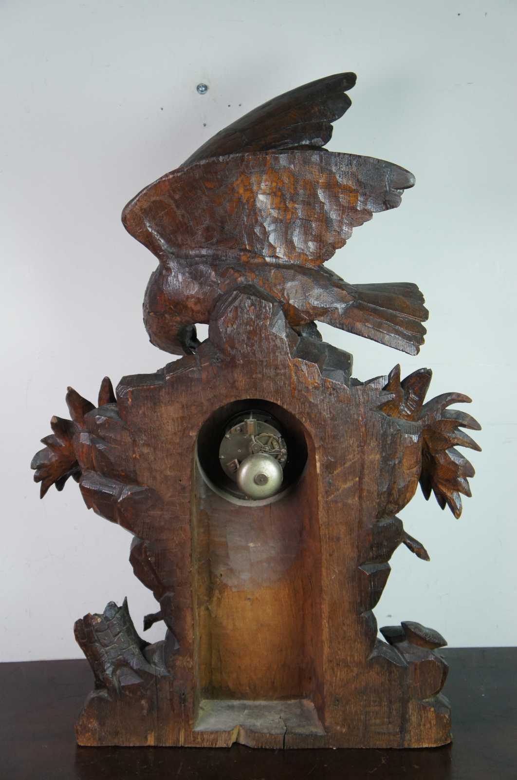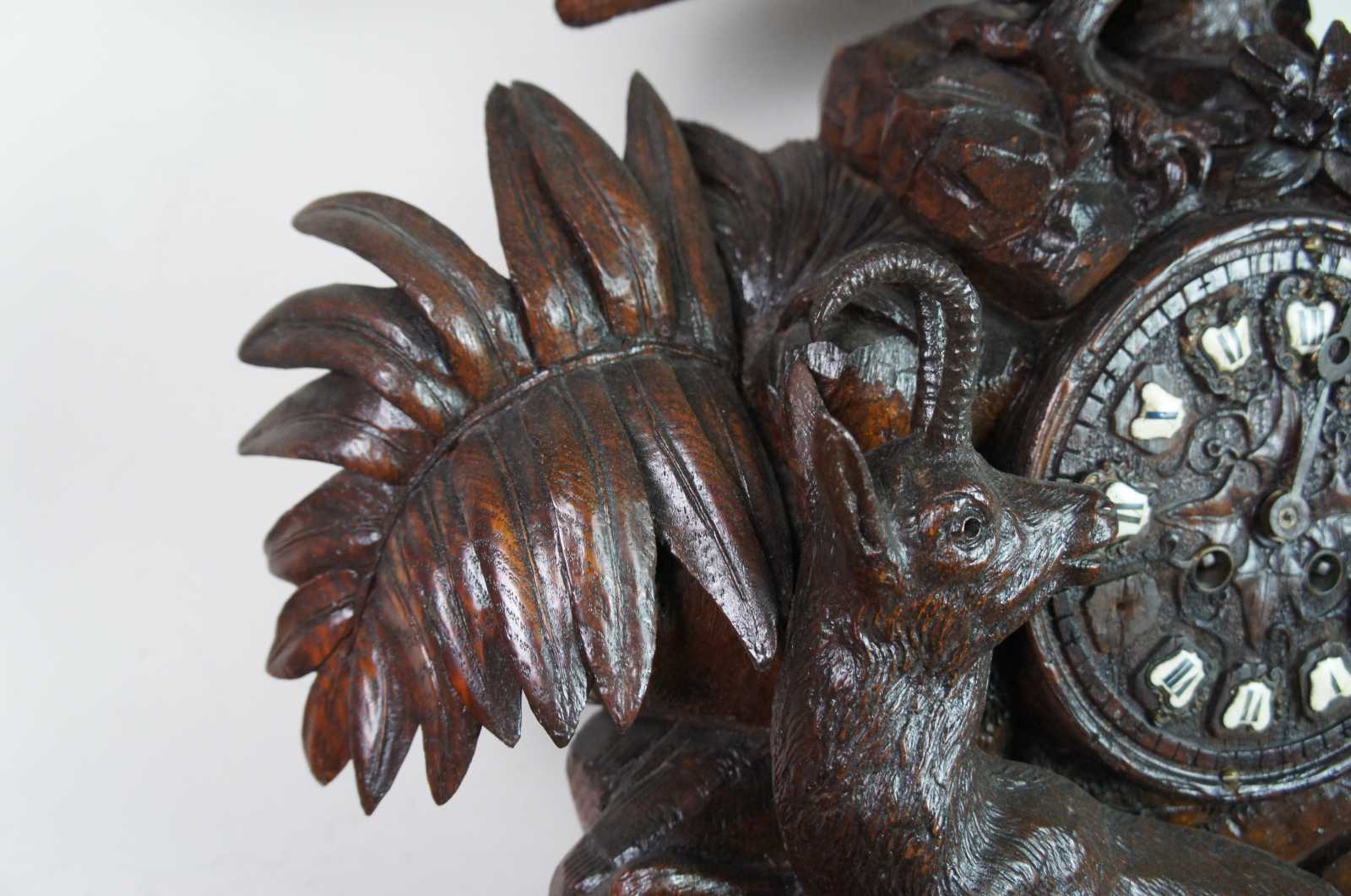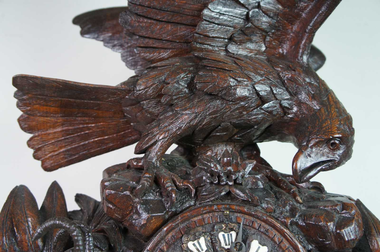 Monumental 19th century antique German Black Forest walnut mantel clock featuring carved high relief details with a winged bald eagle mounted atop foliage hunting a Chamois mountain antelope / goat and her baby.