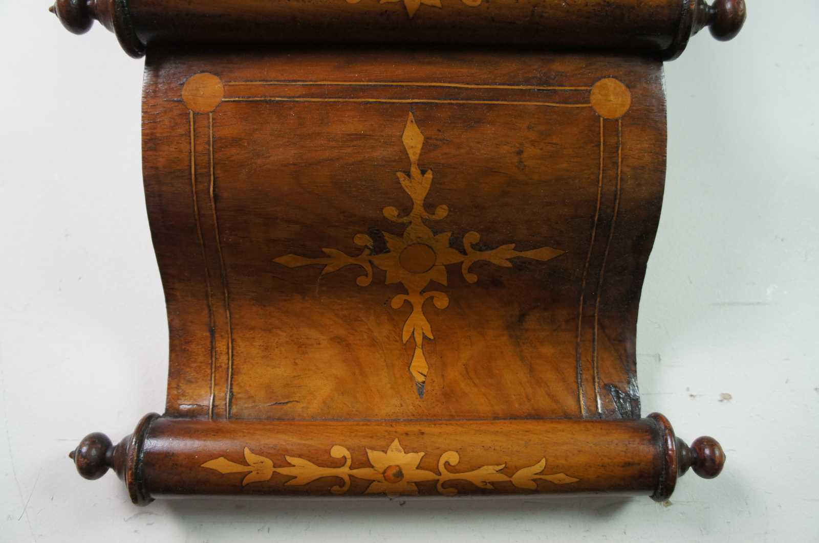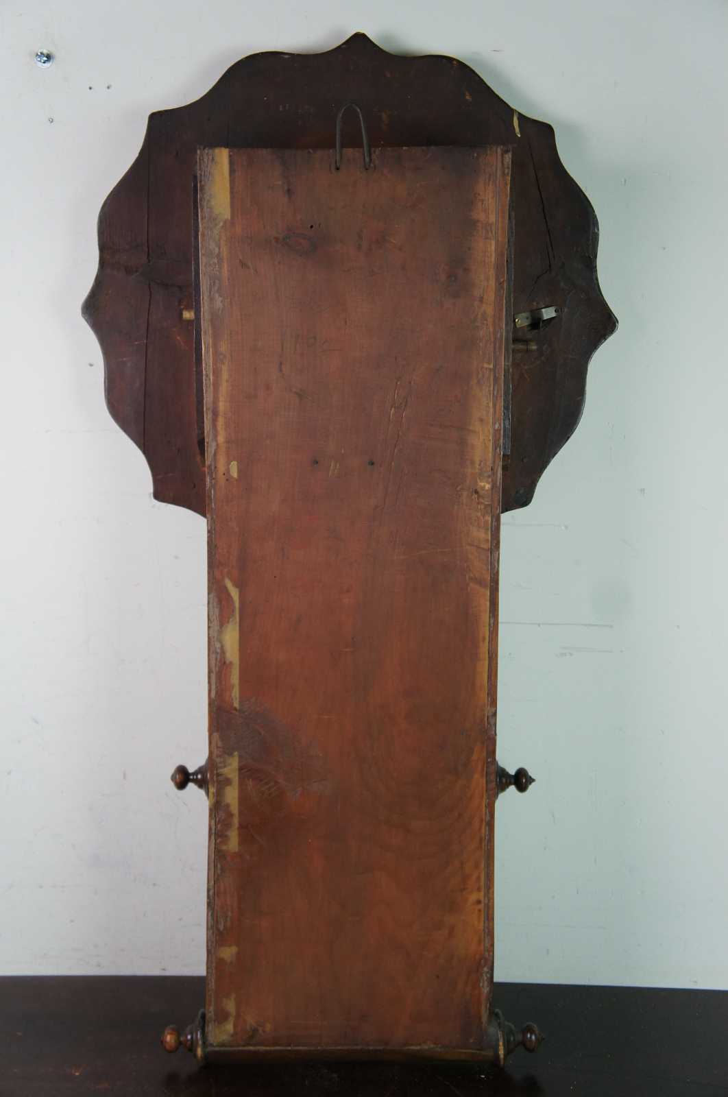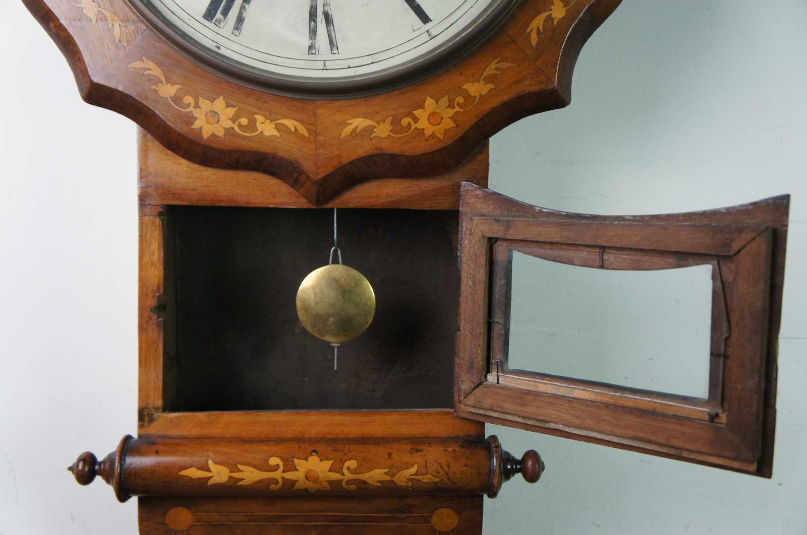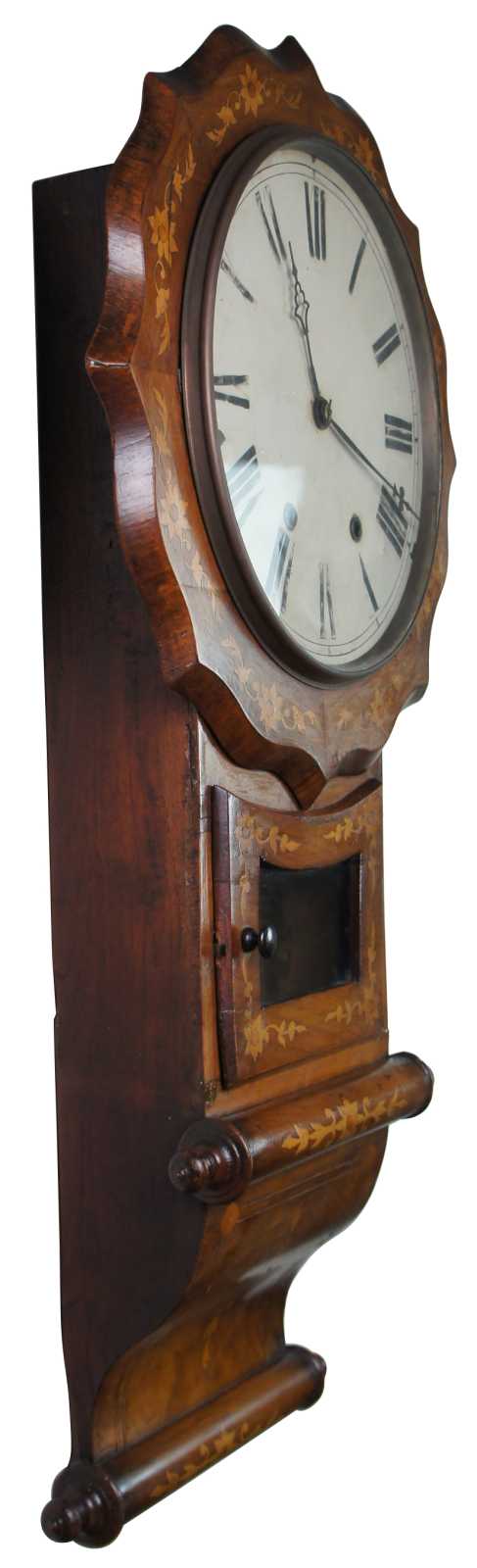 Antique 19th century Anglo American drop dial wall clock. The hand-crafted case being made in England, and the movement being imported from the Us Made of walnut and inlaid satinwood / fruitwood featuring scalloped form with a starburst / sunburst shaped case with scrolled accents and Roman numeral face. Circa 1880s