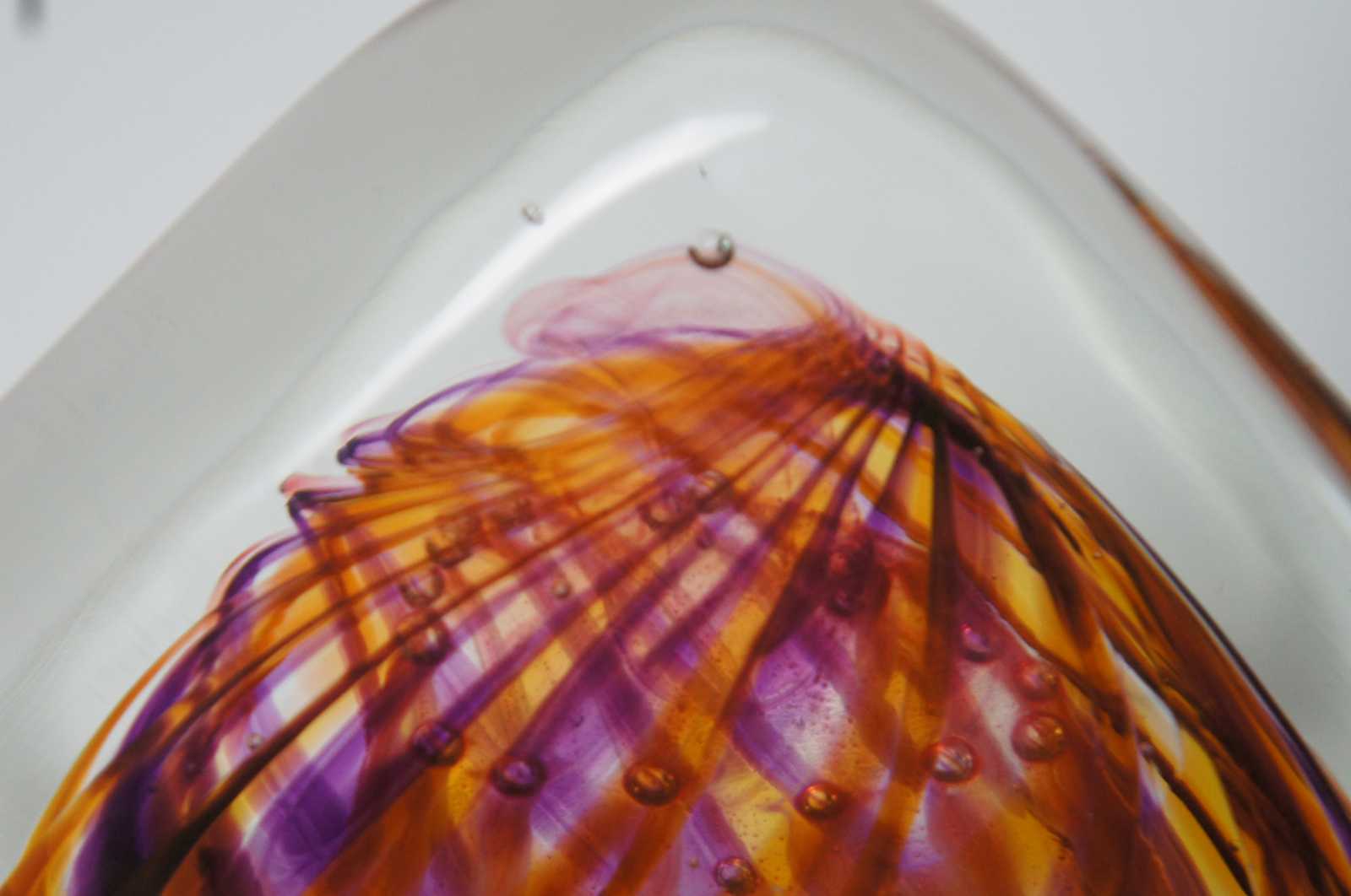Nick Delmatto 1996 art glass paperweight or sculpture, featuring a clear abstract form filled with translucent swirls of orange and purple. Signed and dated 1996 on base.