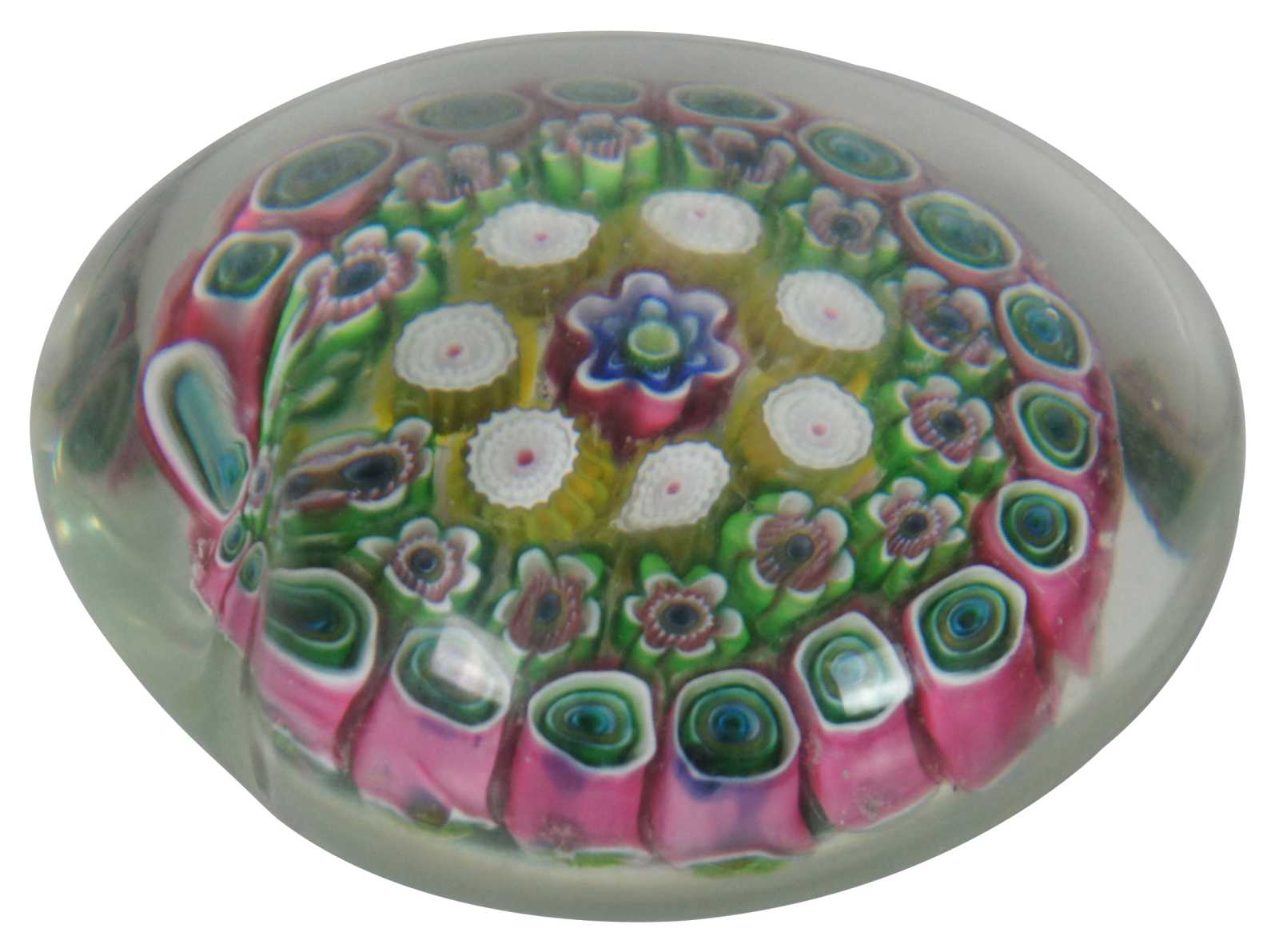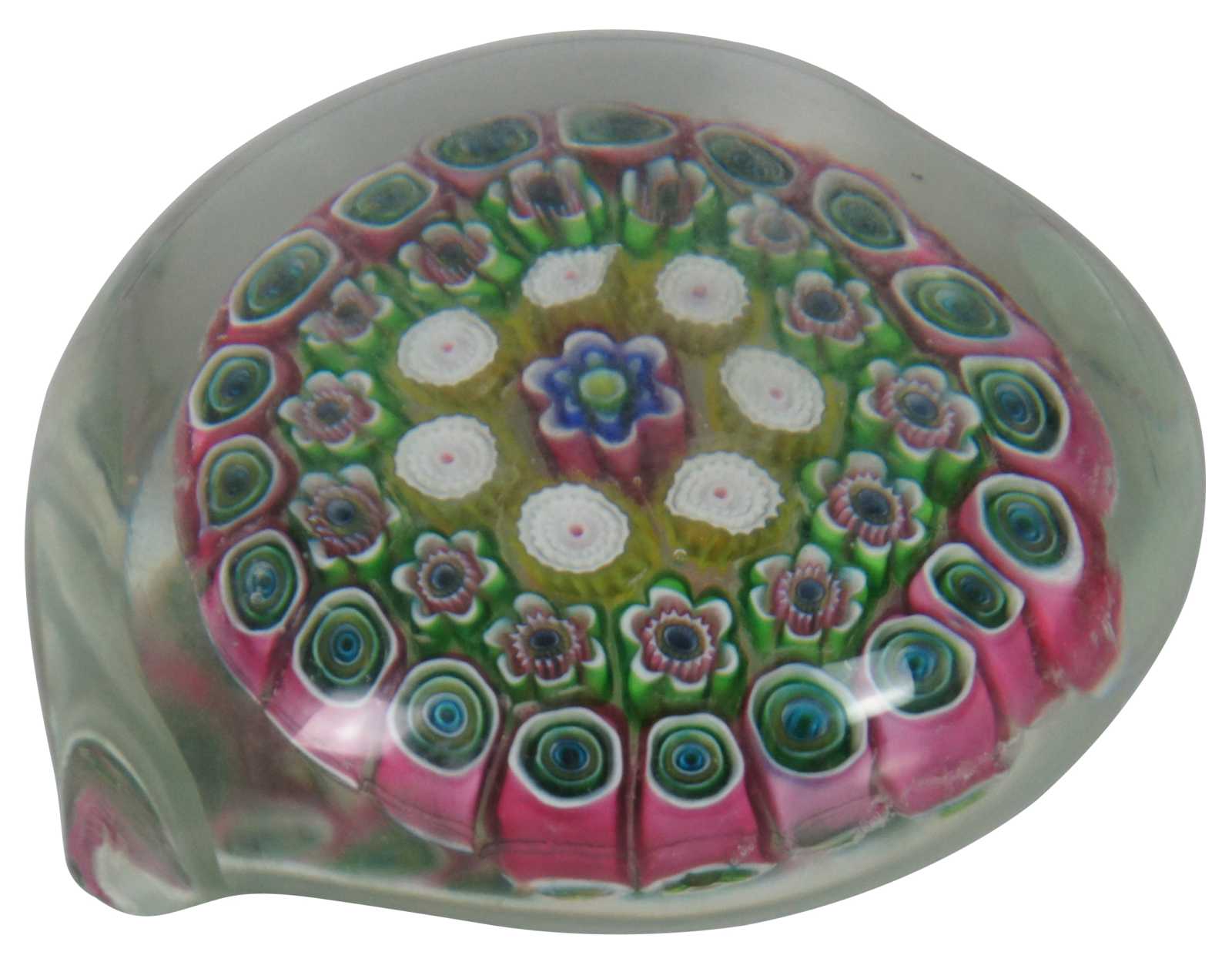 Vintage Murano Italy art glass heart and flower paperweight filled with millefiori glass cane patterns.